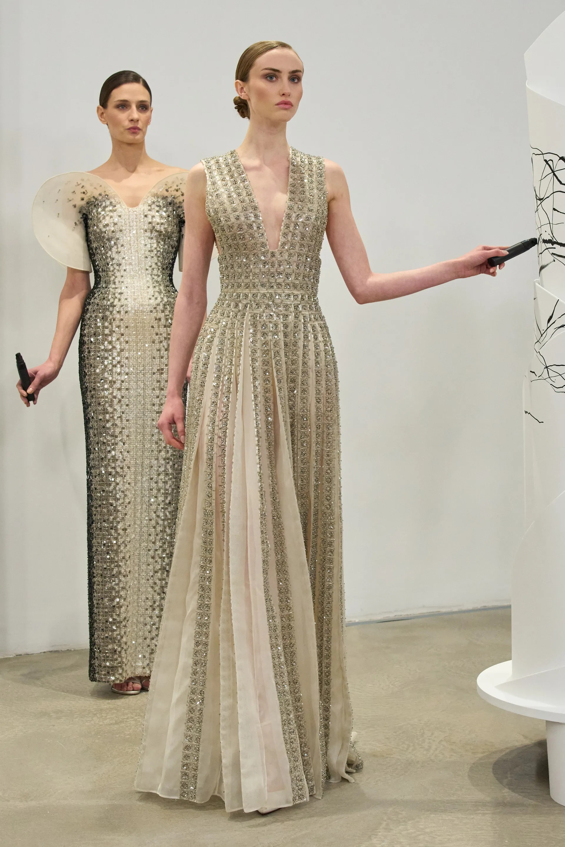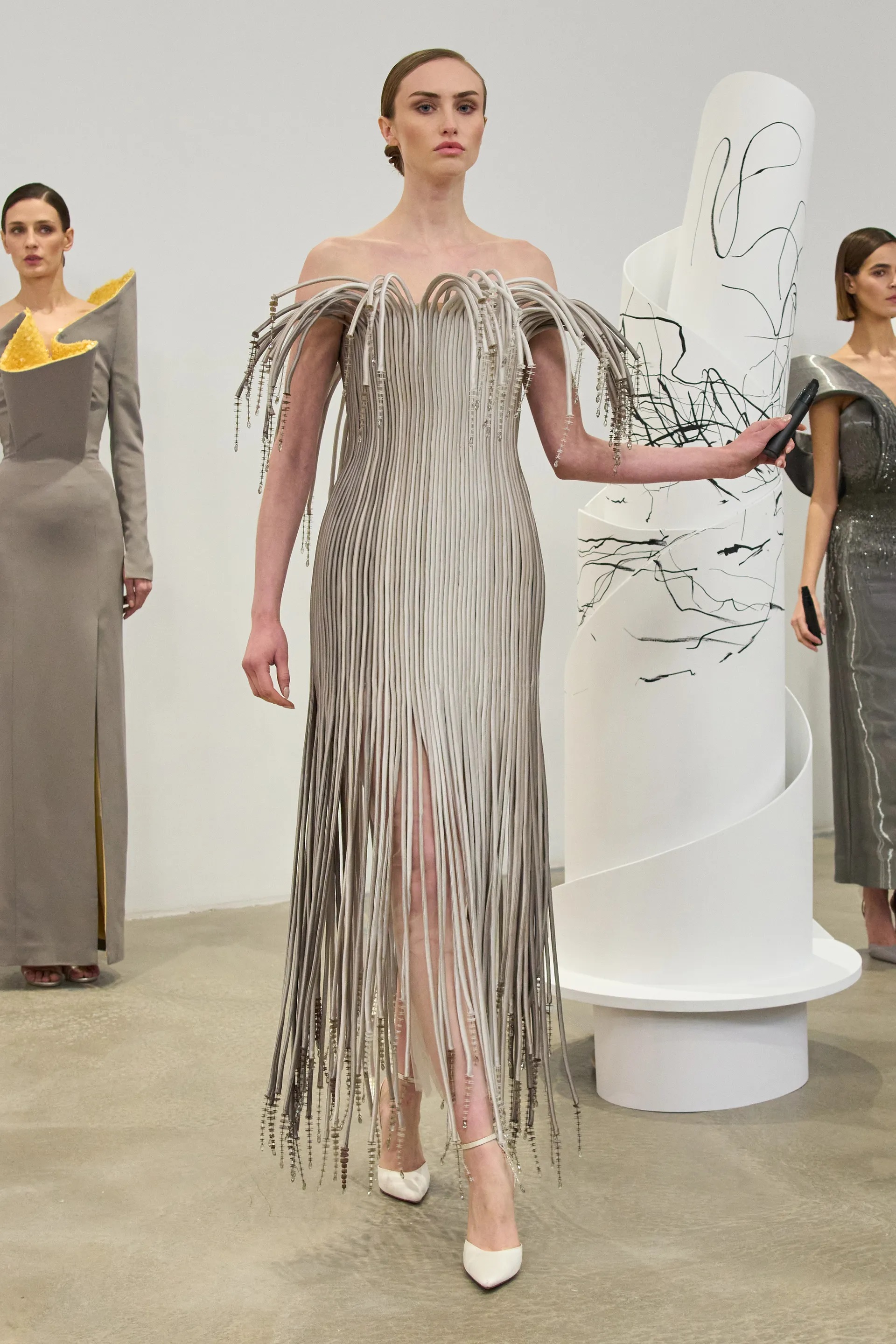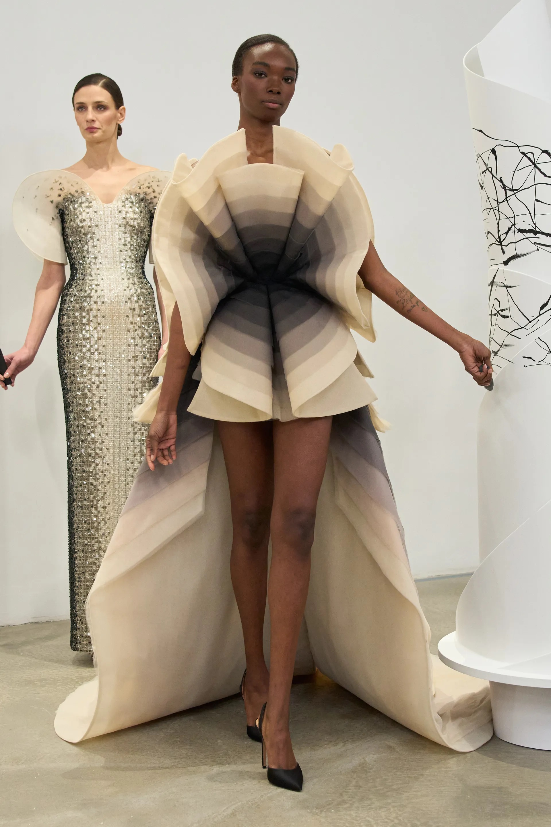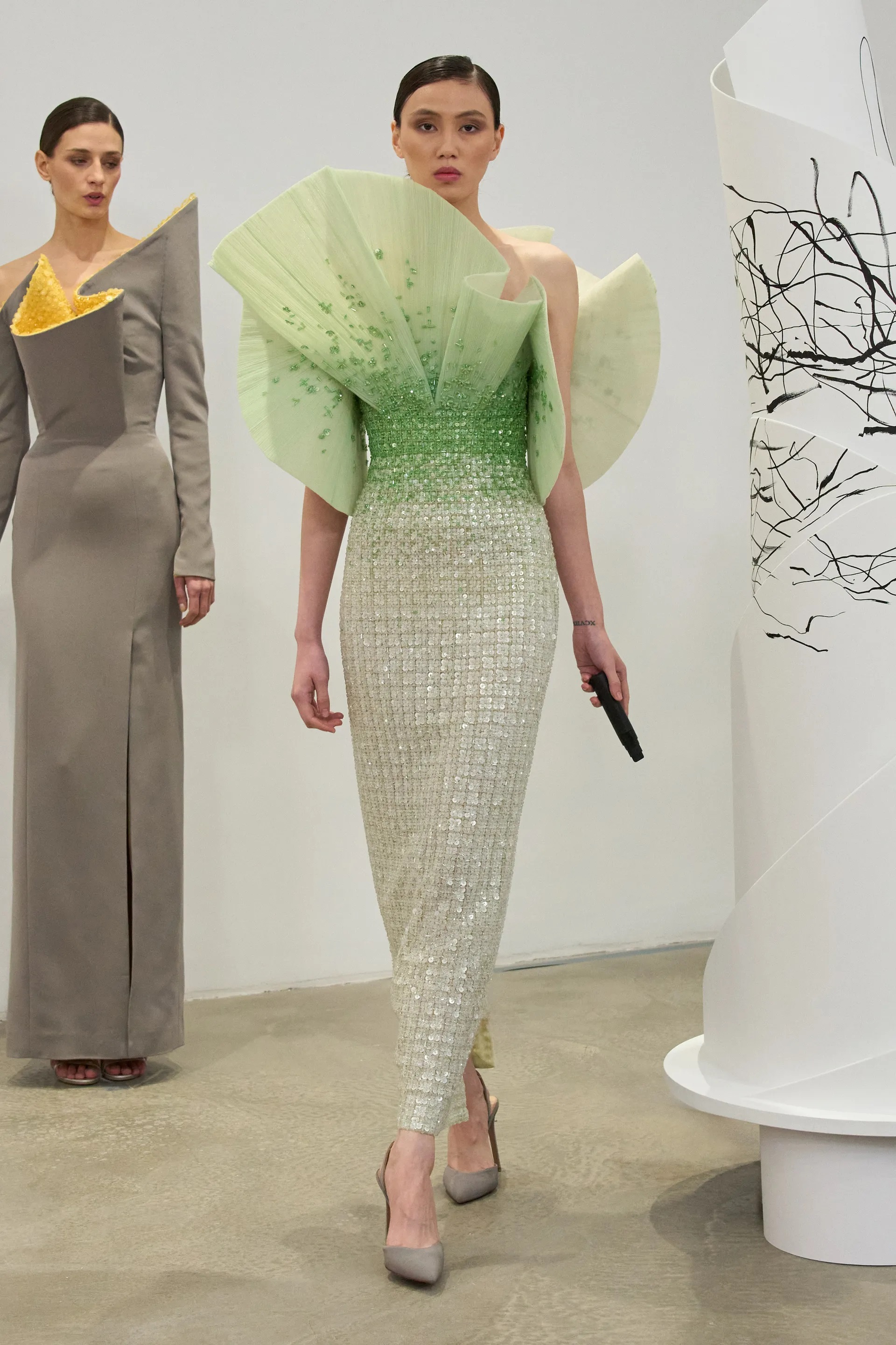 A kollekció színpalettája az elegáns szürkék visszafogottságát hordozta, amelyet a kankalinsárga, a buja zöld és a kagylórózsaszín vibráló árnyalatai törtek meg. Az árnyalatok kifinomult játékossága a természet dinamikáját idézte meg, miközben a couture kifogástalan luxusát sugározta. Az egyes sziluettek precízen kidolgozott formái a méhsejtek geometrikus szerkezetét és a kagylók lágy íveit juttatták eszembe, zökkenőmentesen egyesítve a természet organikus szépségét a kézműves kivitelezés mesteri megoldásaival.