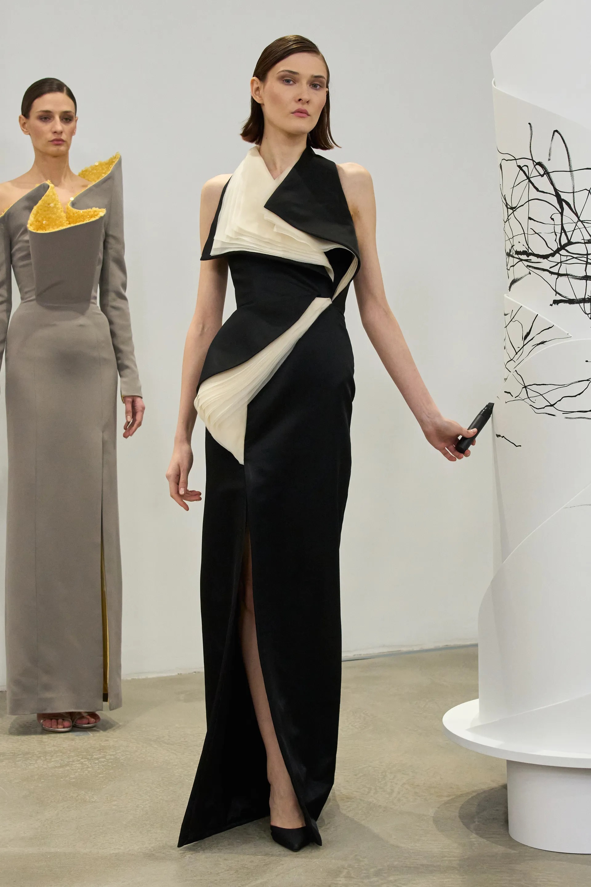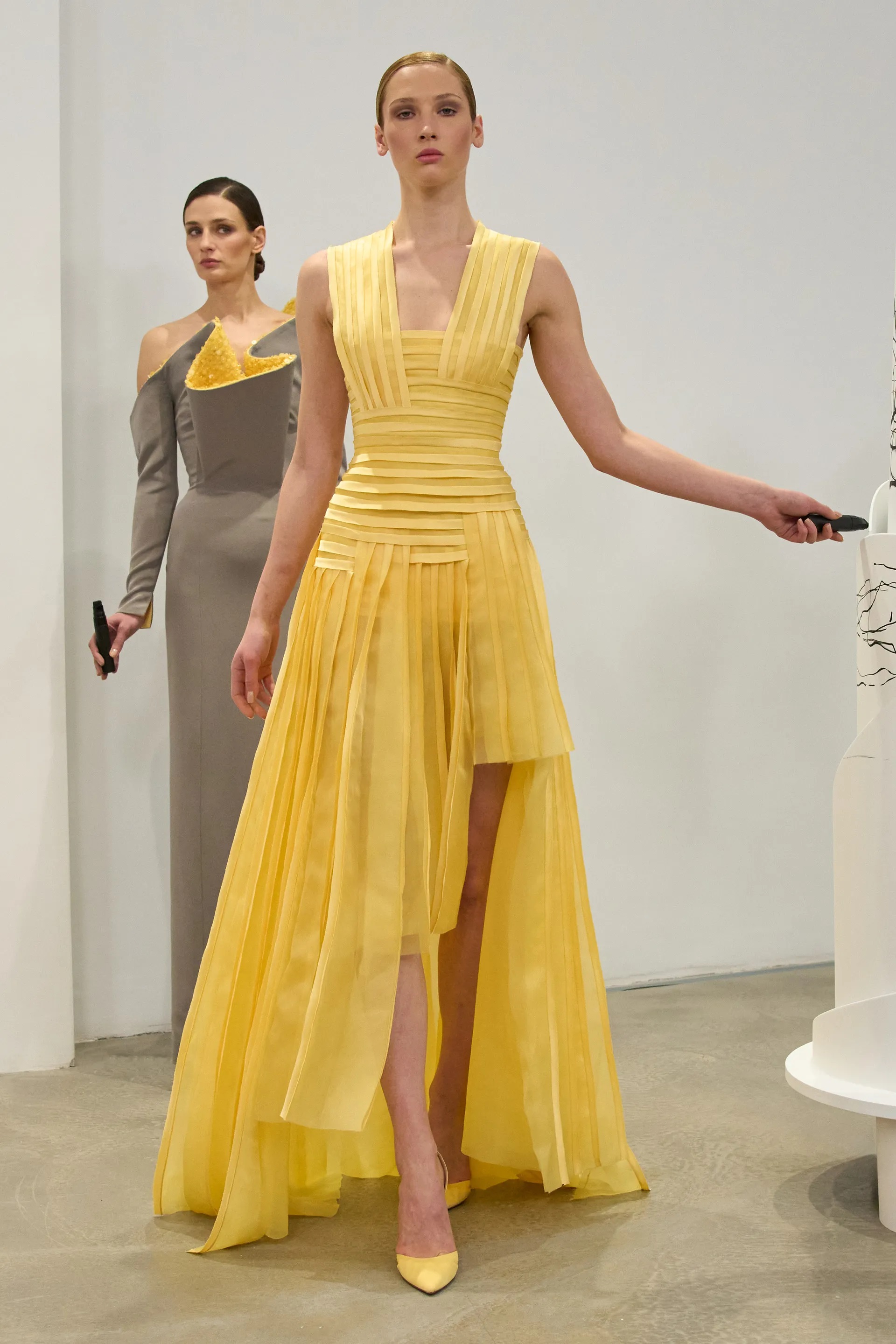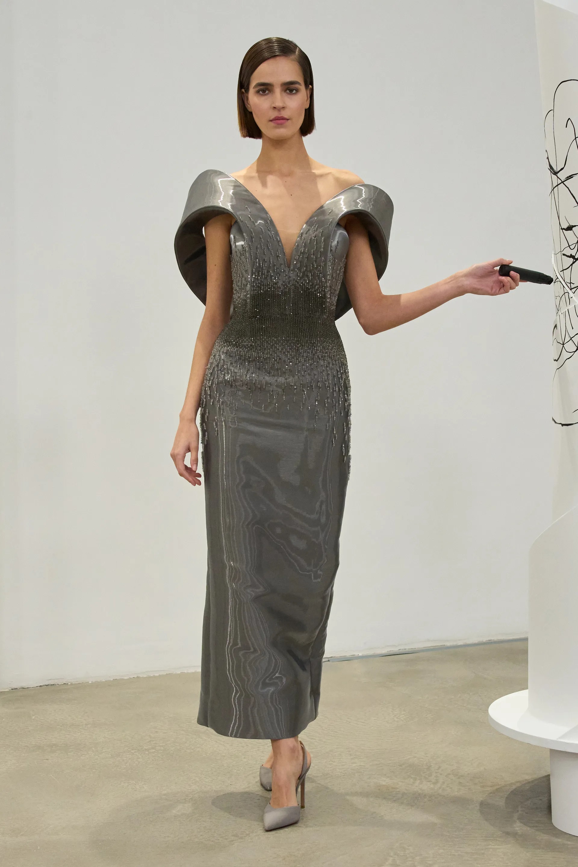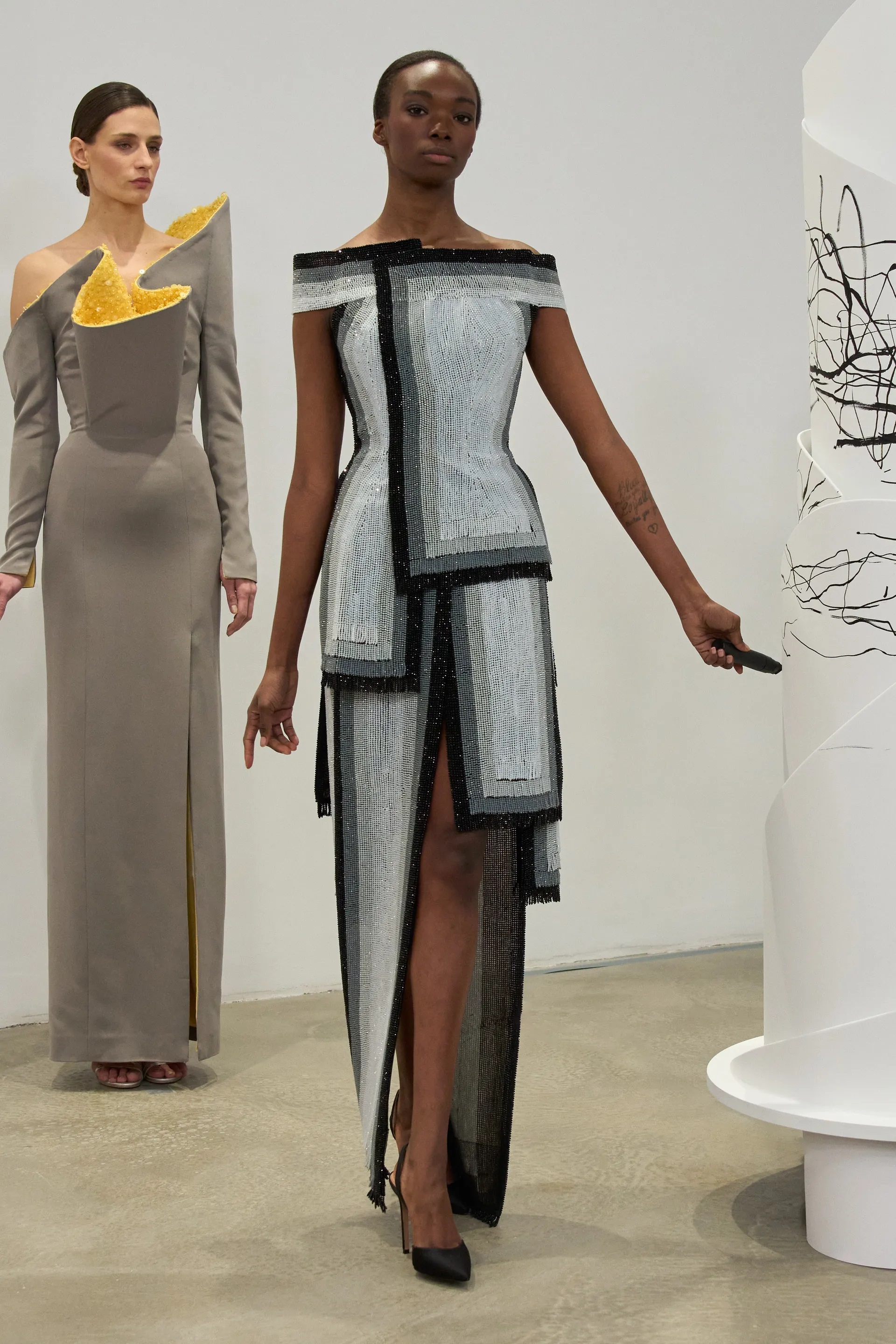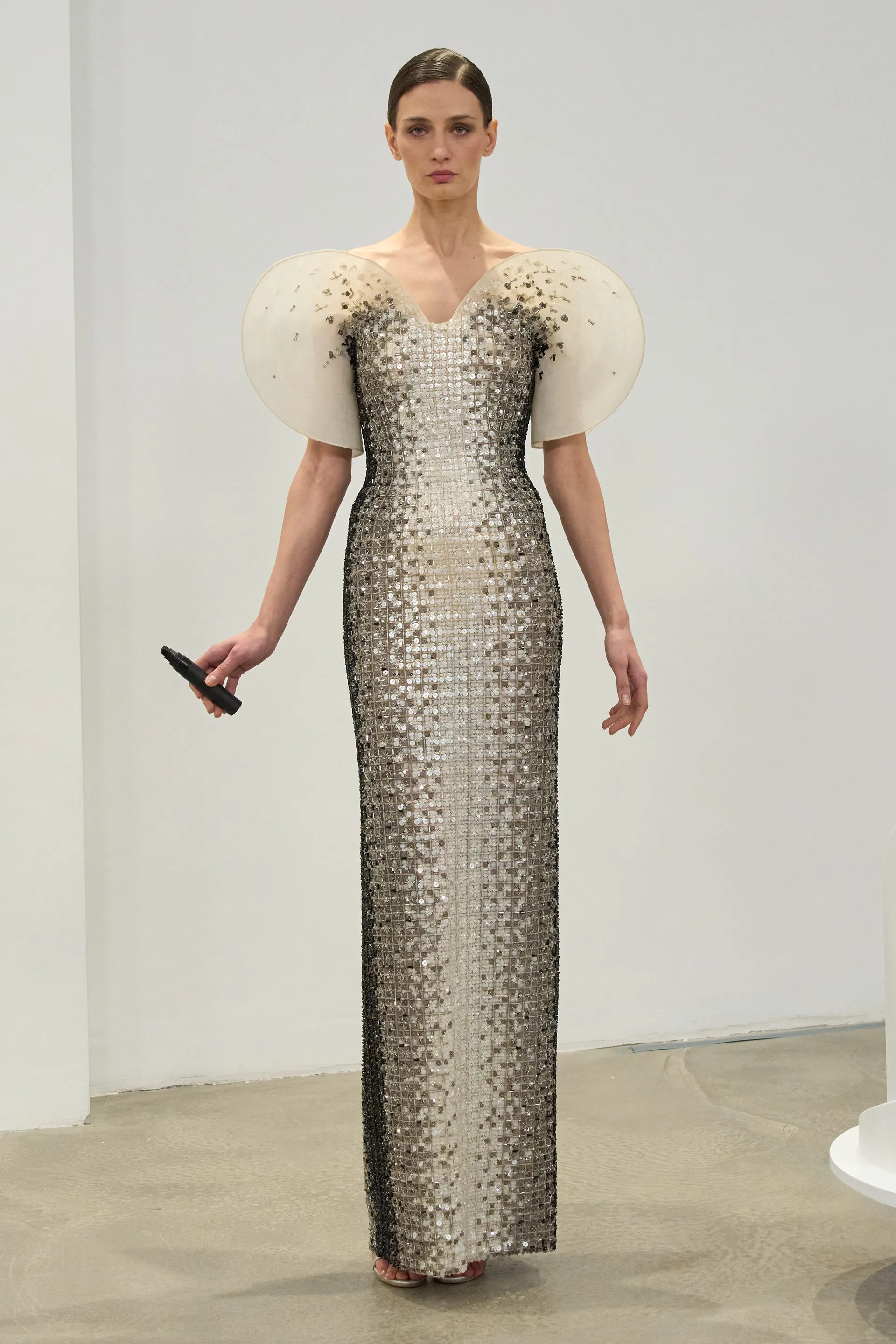 A kollekció színpalettája az elegáns szürkék visszafogottságát hordozta, amelyet a kankalinsárga, a buja zöld és a kagylórózsaszín vibráló árnyalatai törtek meg. Az árnyalatok kifinomult játékossága a természet dinamikáját idézte meg, miközben a couture kifogástalan luxusát sugározta. Az egyes sziluettek precízen kidolgozott formái a méhsejtek geometrikus szerkezetét és a kagylók lágy íveit juttatták eszembe, zökkenőmentesen egyesítve a természet organikus szépségét a kézműves kivitelezés mesteri megoldásaival.