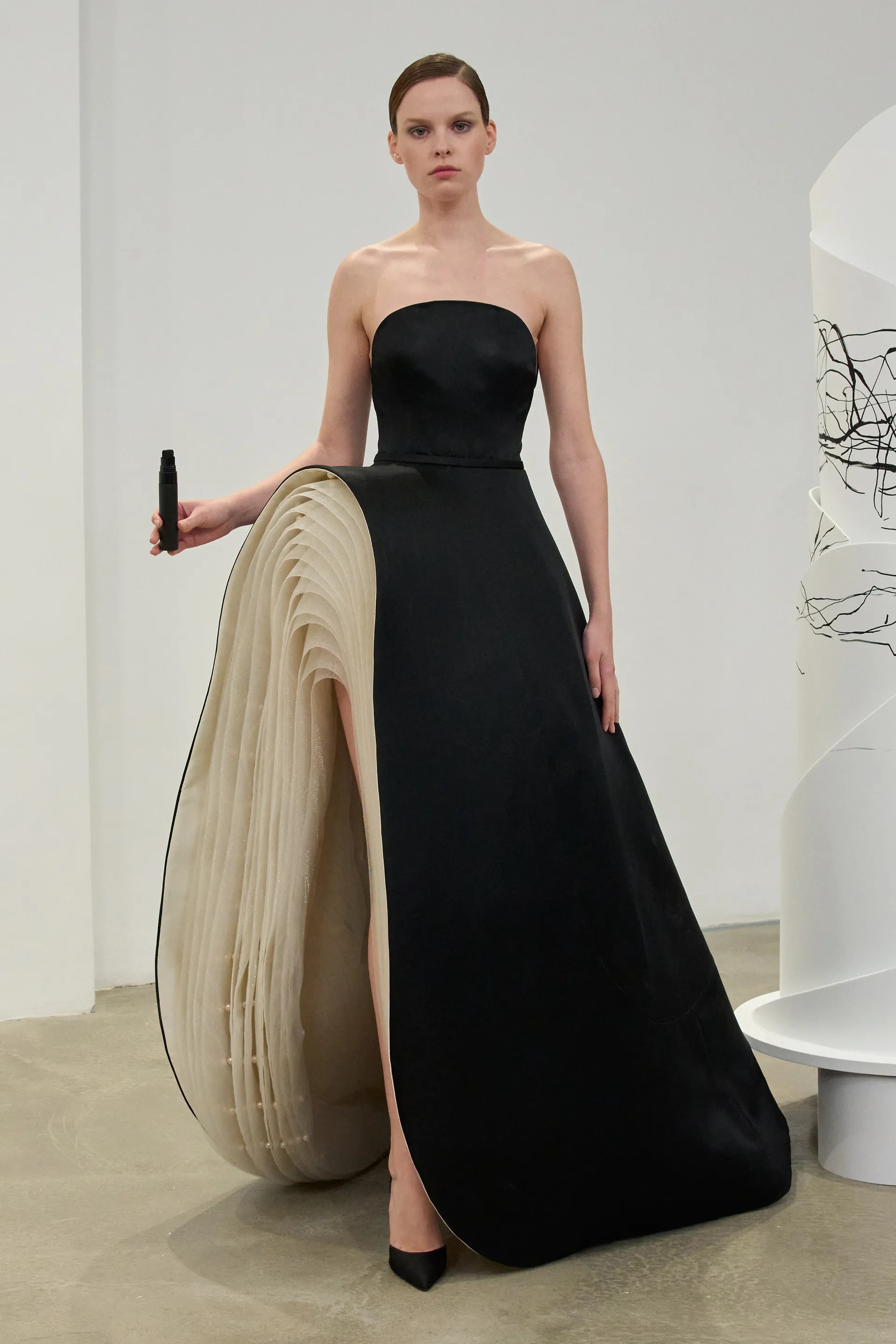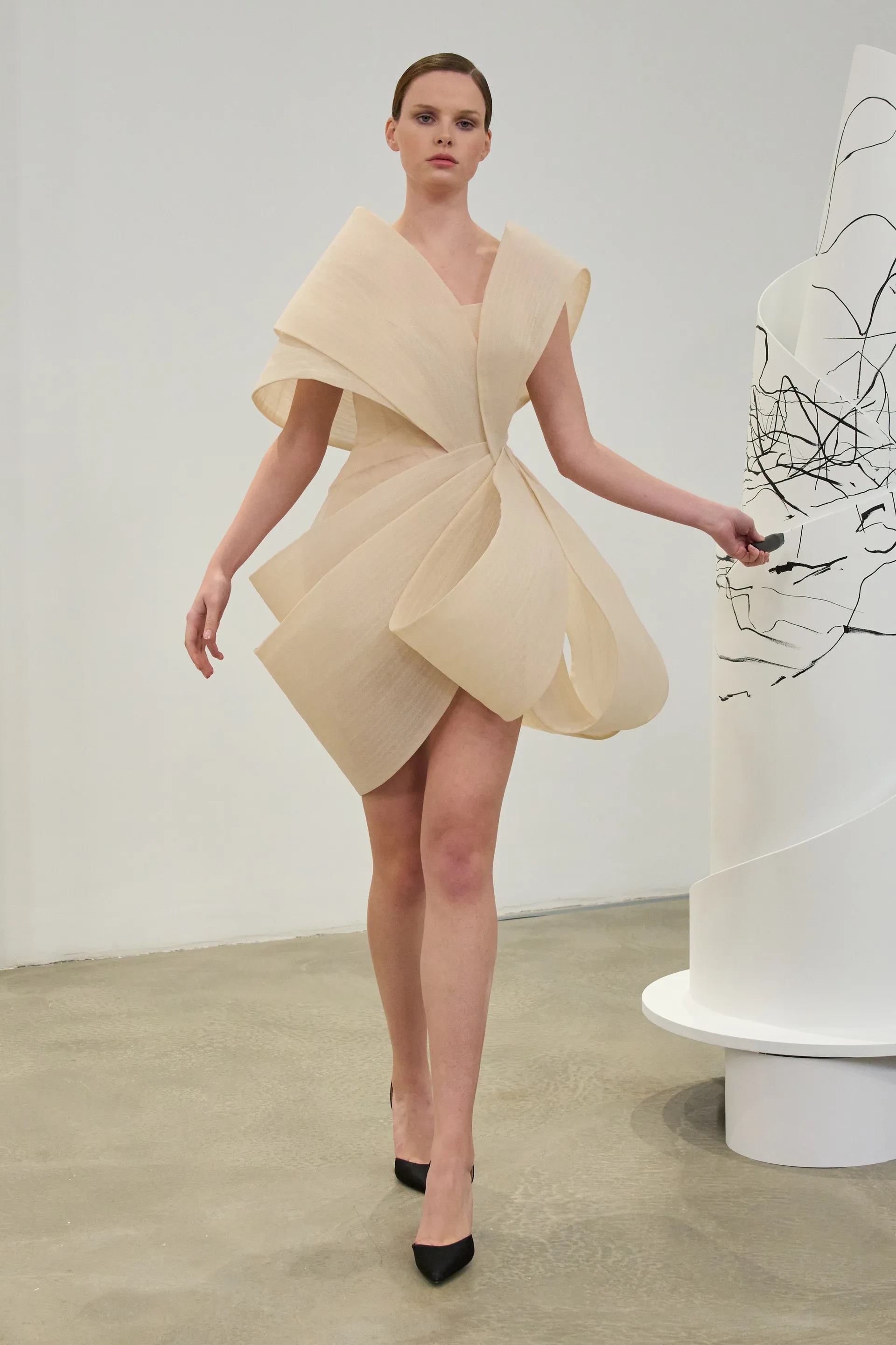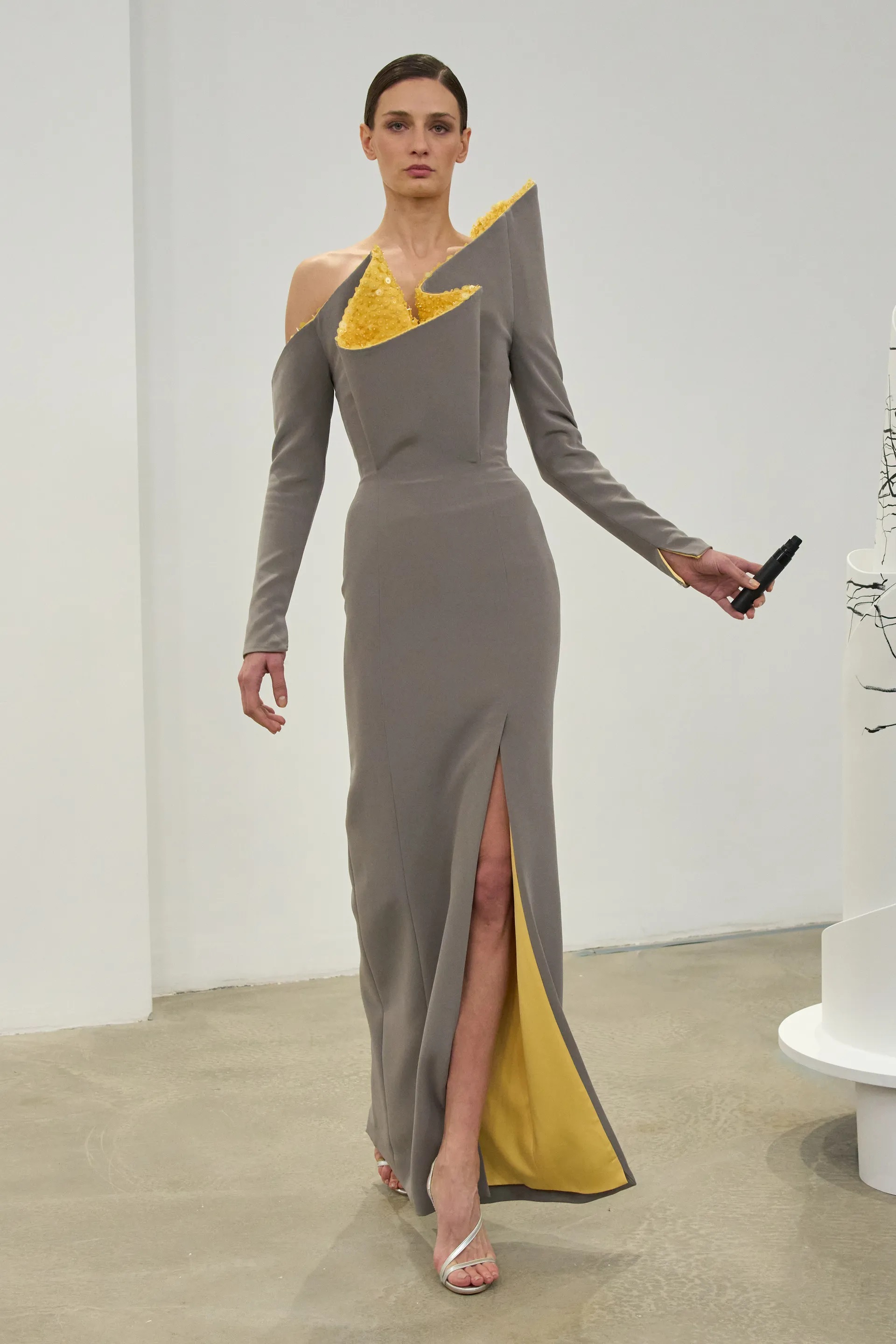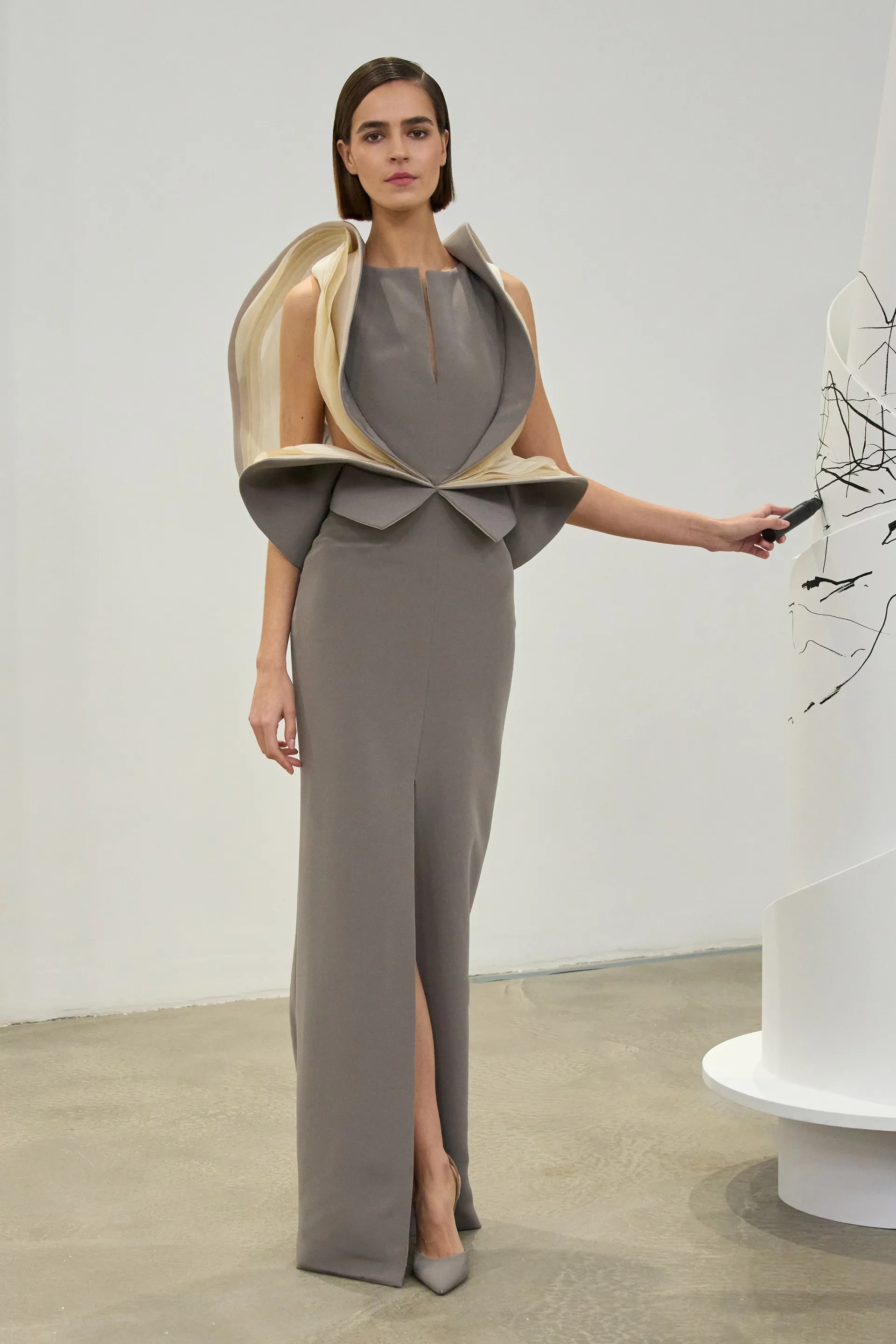 A kollekció színpalettája az elegáns szürkék visszafogottságát hordozta, amelyet a kankalinsárga, a buja zöld és a kagylórózsaszín vibráló árnyalatai törtek meg. Az árnyalatok kifinomult játékossága a természet dinamikáját idézte meg, miközben a couture kifogástalan luxusát sugározta. Az egyes sziluettek precízen kidolgozott formái a méhsejtek geometrikus szerkezetét és a kagylók lágy íveit juttatták eszembe, zökkenőmentesen egyesítve a természet organikus szépségét a kézműves kivitelezés mesteri megoldásaival.