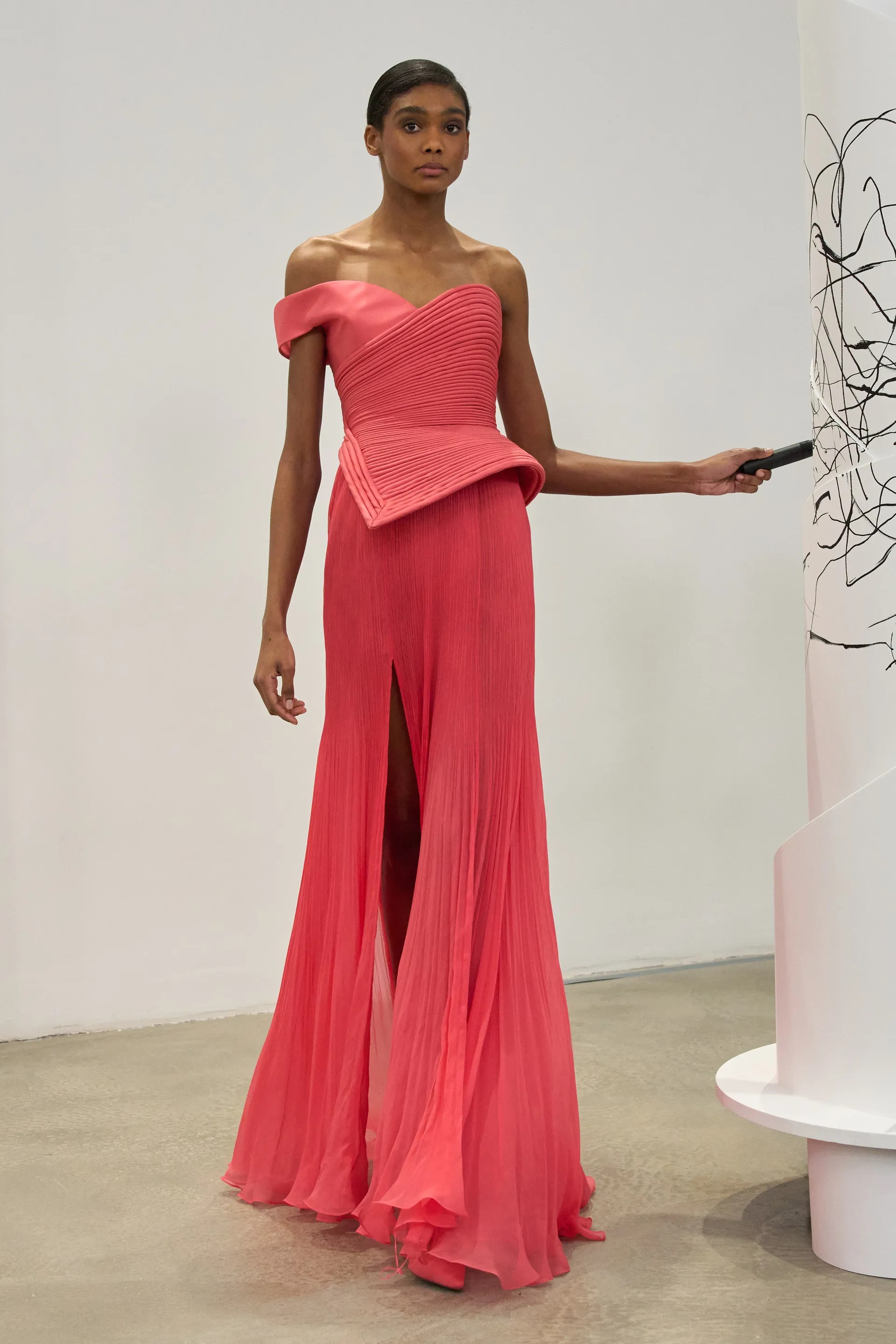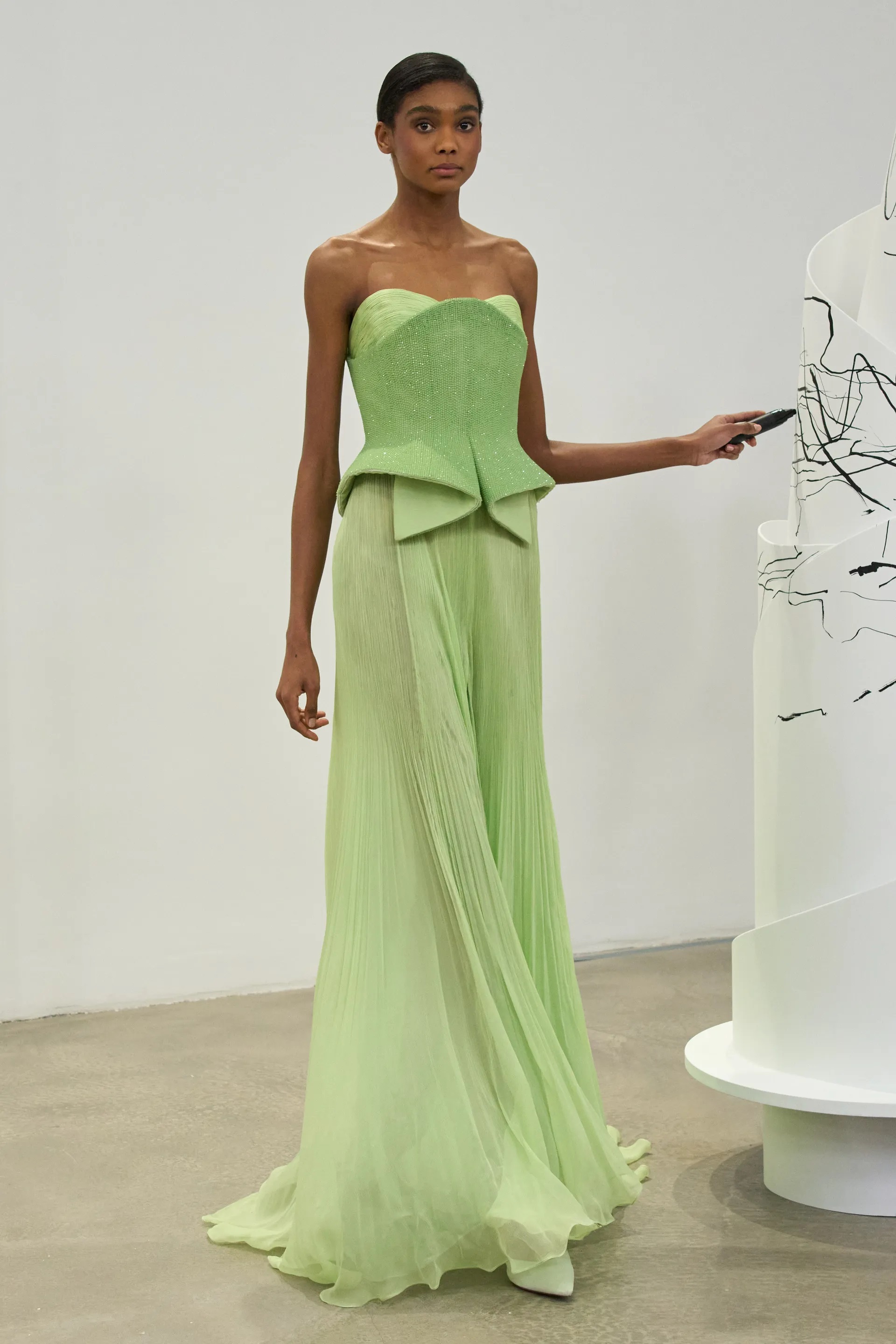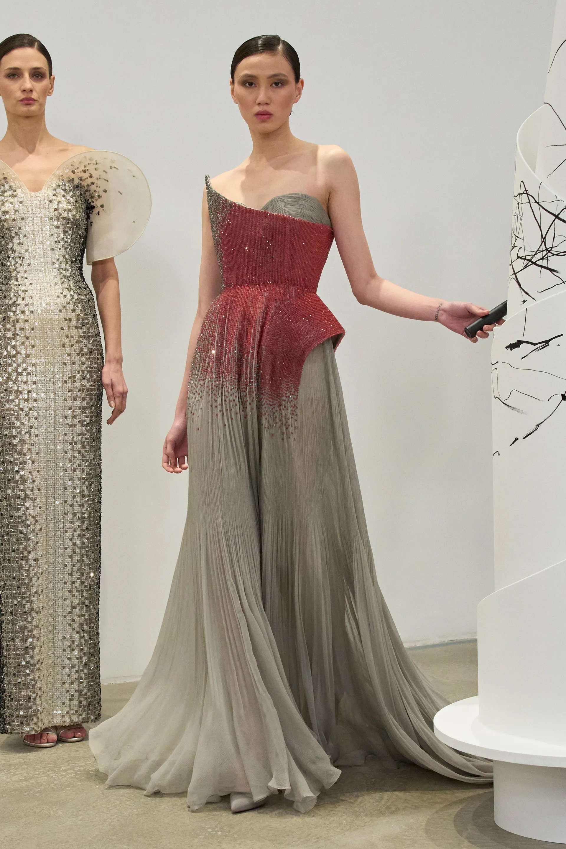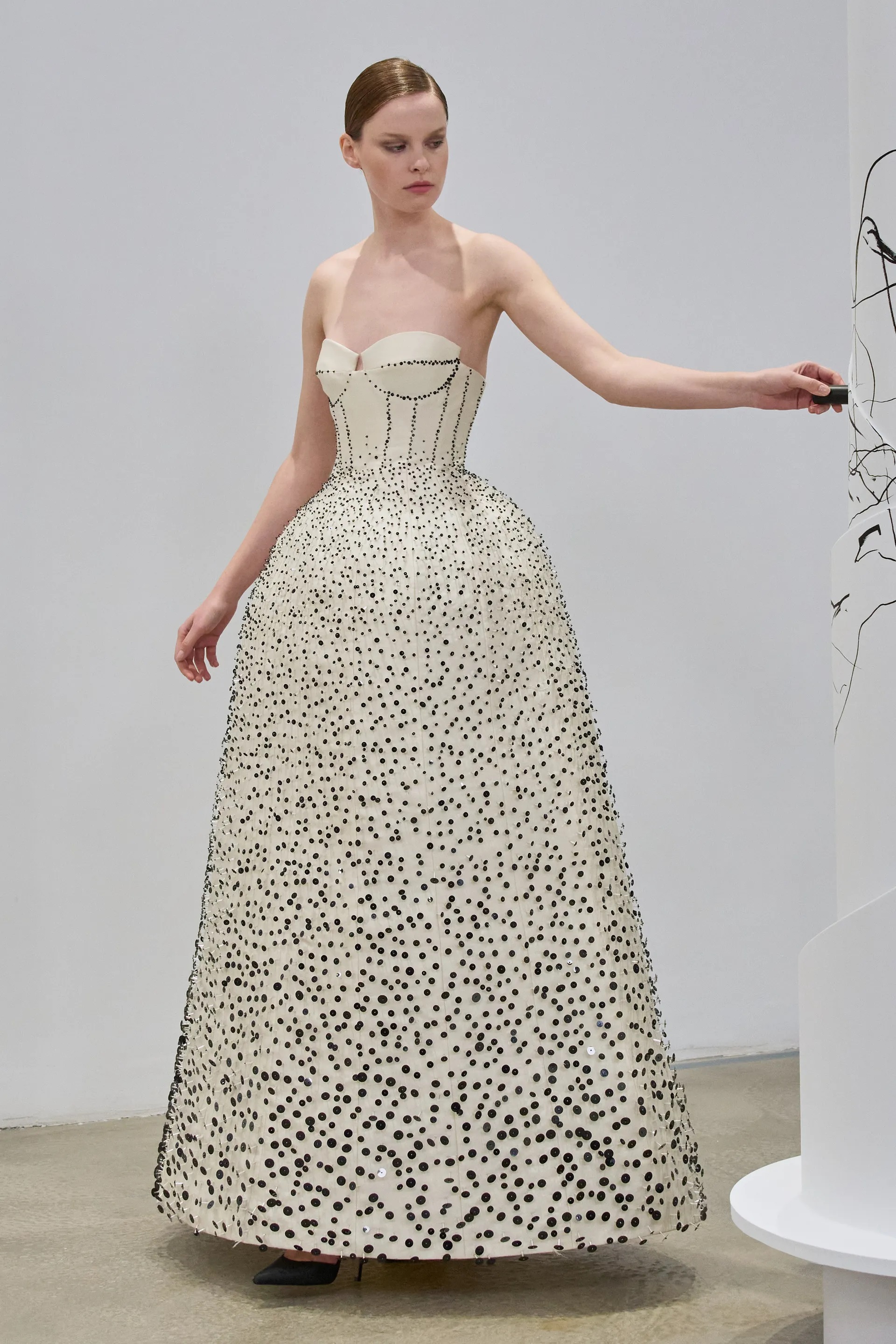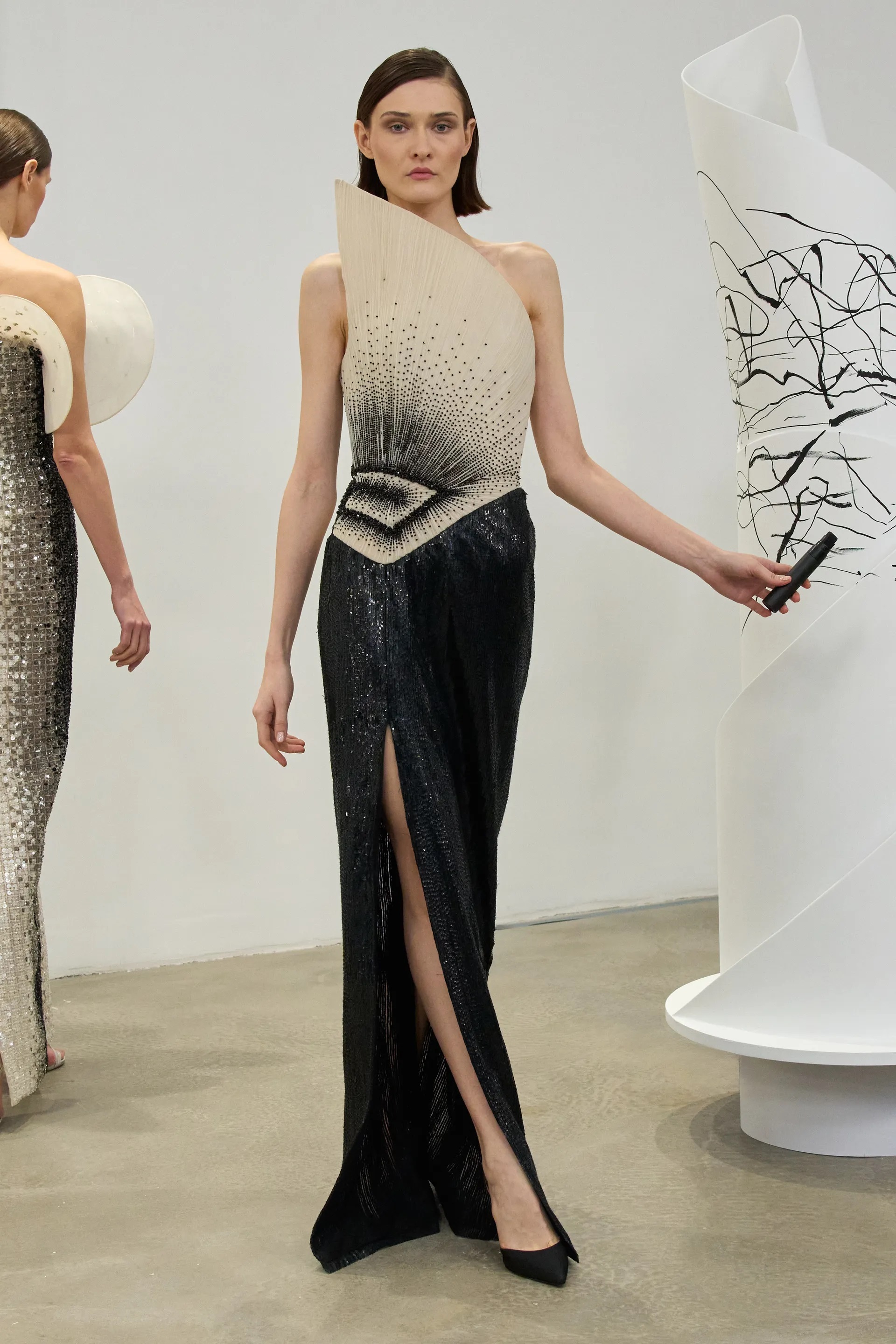 A kollekció színpalettája az elegáns szürkék visszafogottságát hordozta, amelyet a kankalinsárga, a buja zöld és a kagylórózsaszín vibráló árnyalatai törtek meg. Az árnyalatok kifinomult játékossága a természet dinamikáját idézte meg, miközben a couture kifogástalan luxusát sugározta. Az egyes sziluettek precízen kidolgozott formái a méhsejtek geometrikus szerkezetét és a kagylók lágy íveit juttatták eszembe, zökkenőmentesen egyesítve a természet organikus szépségét a kézműves kivitelezés mesteri megoldásaival.