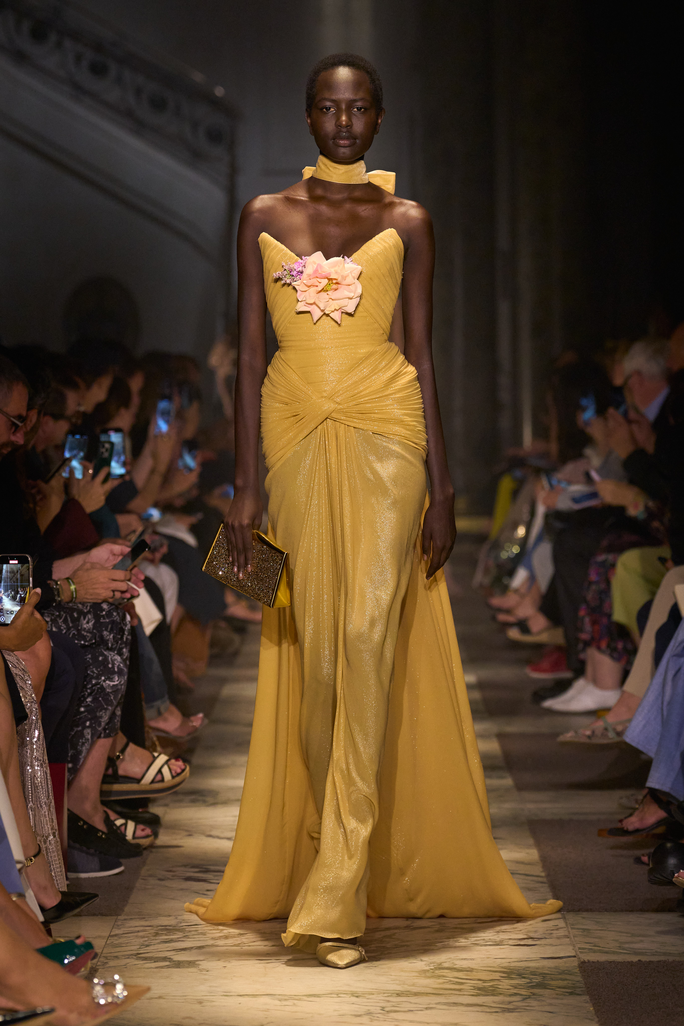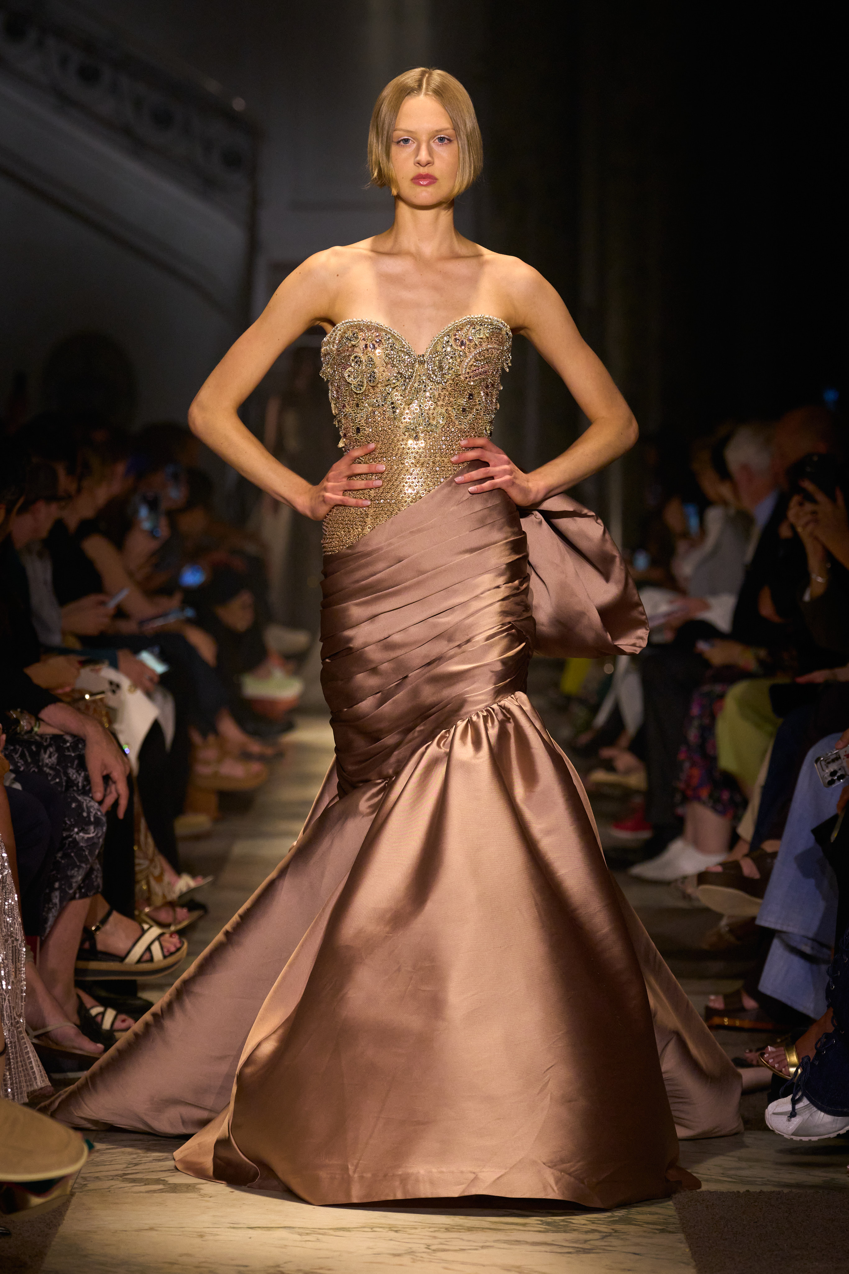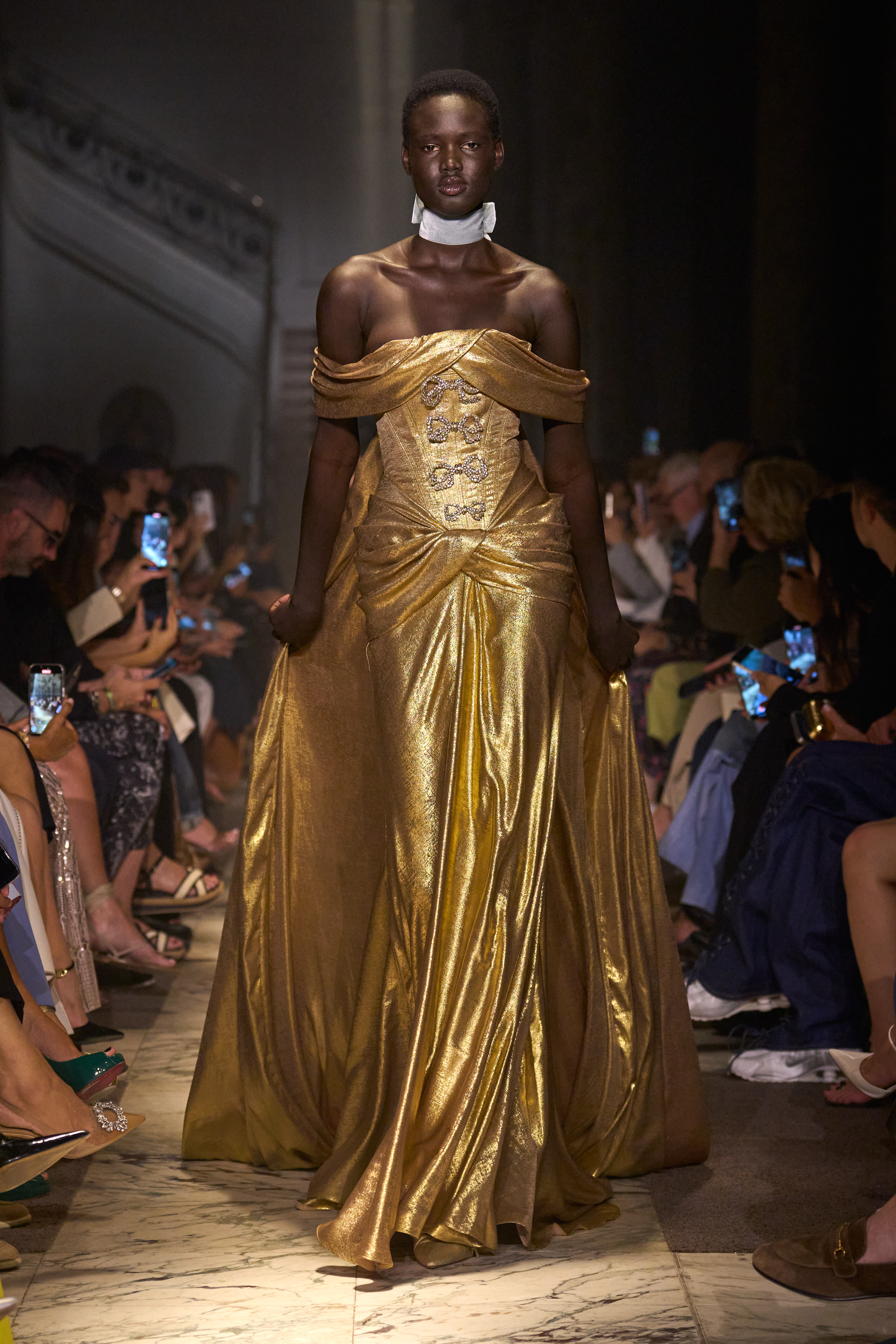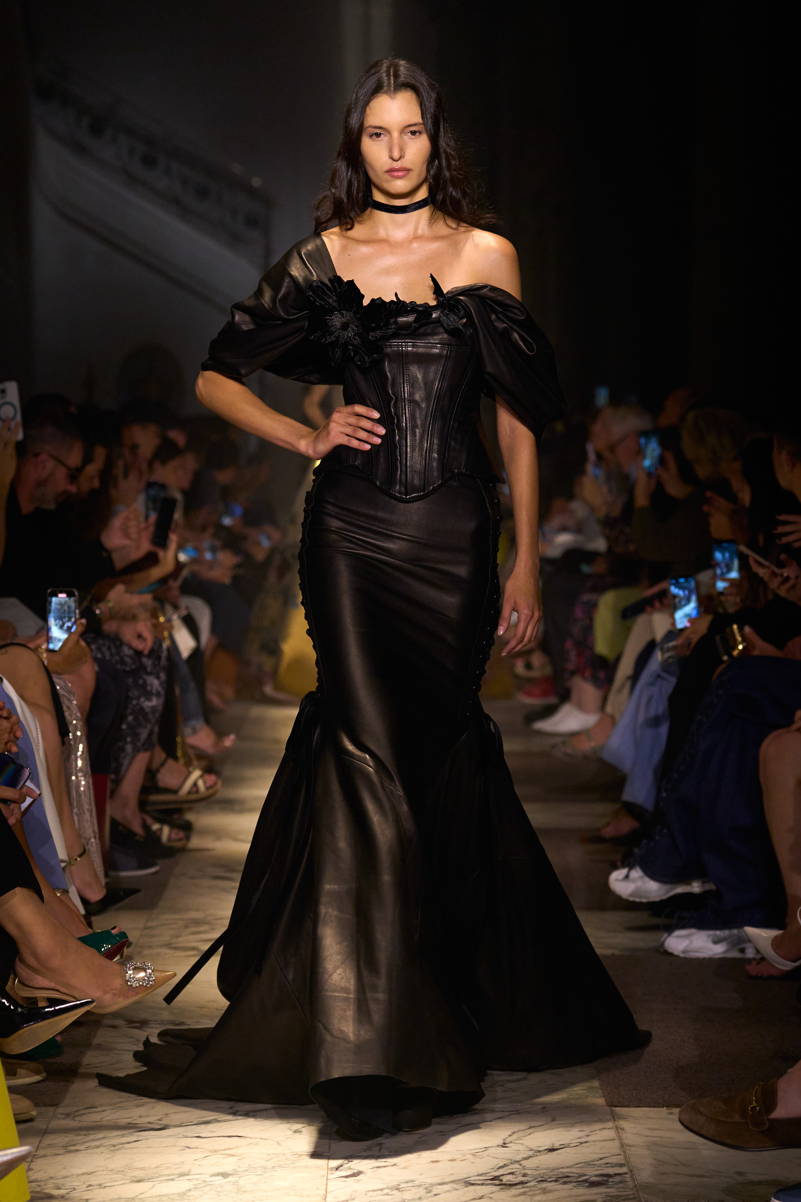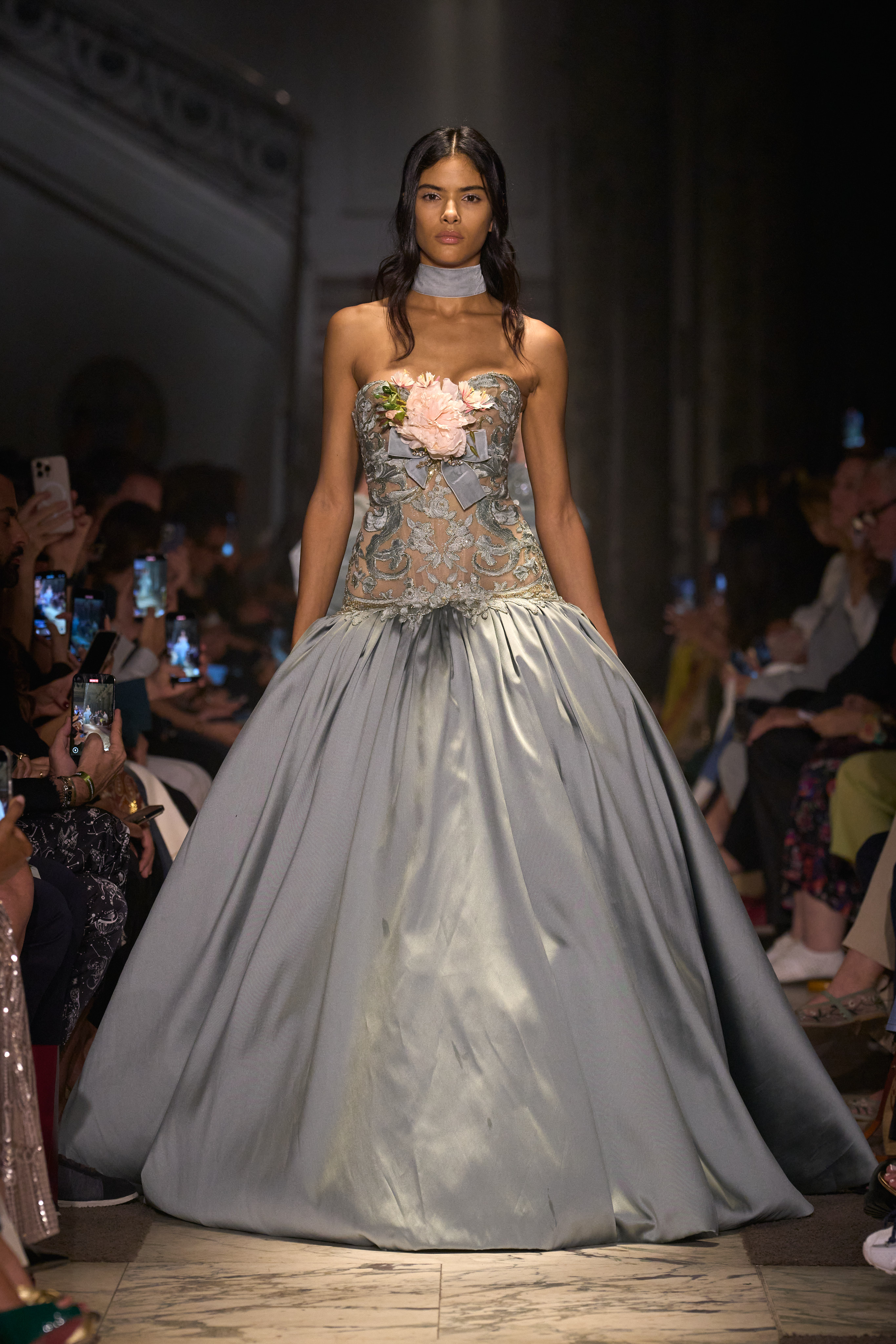 A látványos "La Nouvelle Cour" nevet viselő ruhasorozat érzéki sziluettekkel és szoborszerű részletekkel írja újra a csillogás és az elegancia fogalmát. A francia fűzőművészet új értelmet nyert, a fémes sziluettek, a csipkezuhatagok és a bordázott bársonyok kitűnő kiegészítői a klasszikus mídereknek. A drapériaszerűen leomló moaré izgalmas fényjátékot kölcsönöz az egyes szetteknek, miközben a macaron árnyalatok – a nude, a rózsaszín, a vízkék és a menta – finom kontrasztban állnak az elegáns feketével és arannyal.
