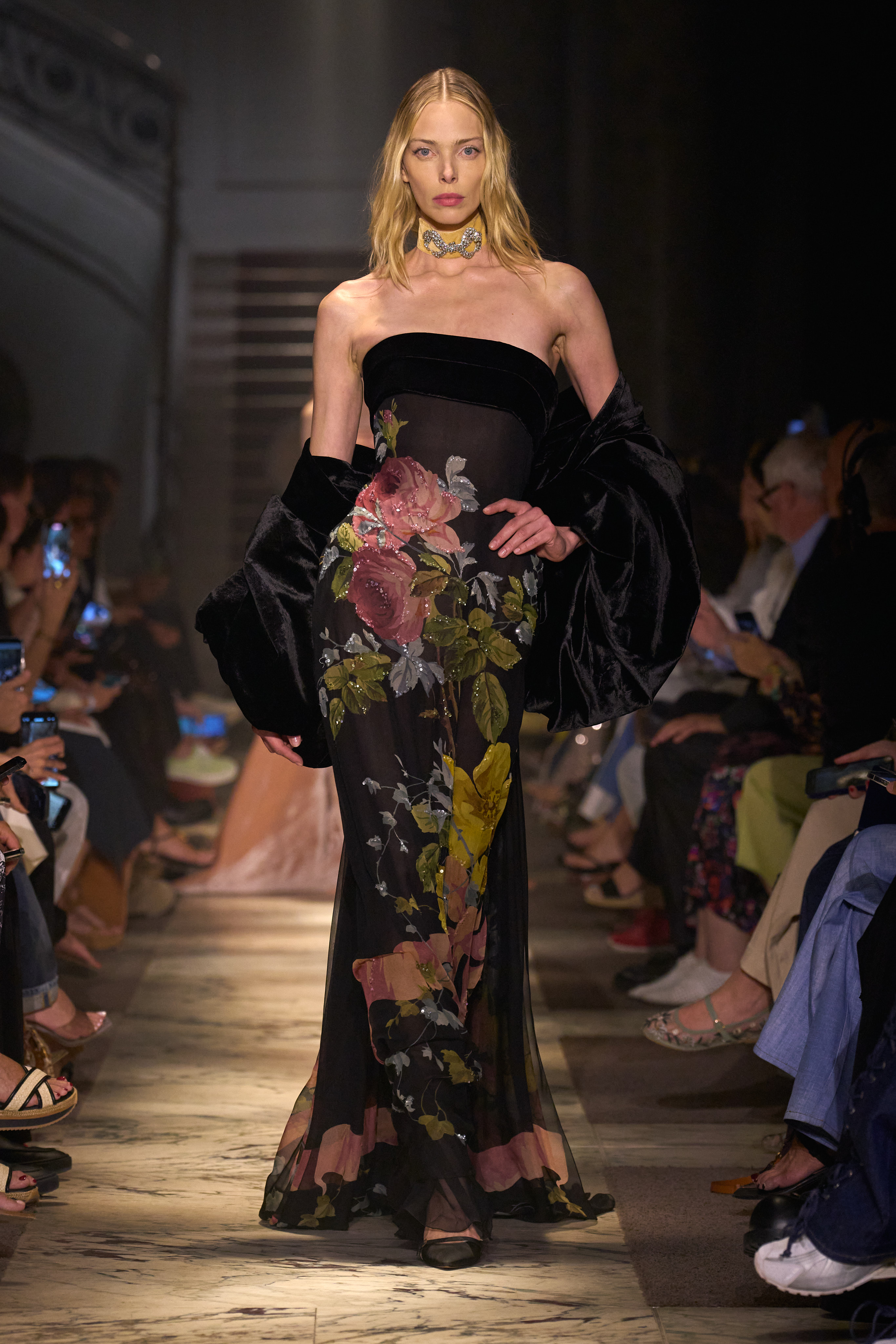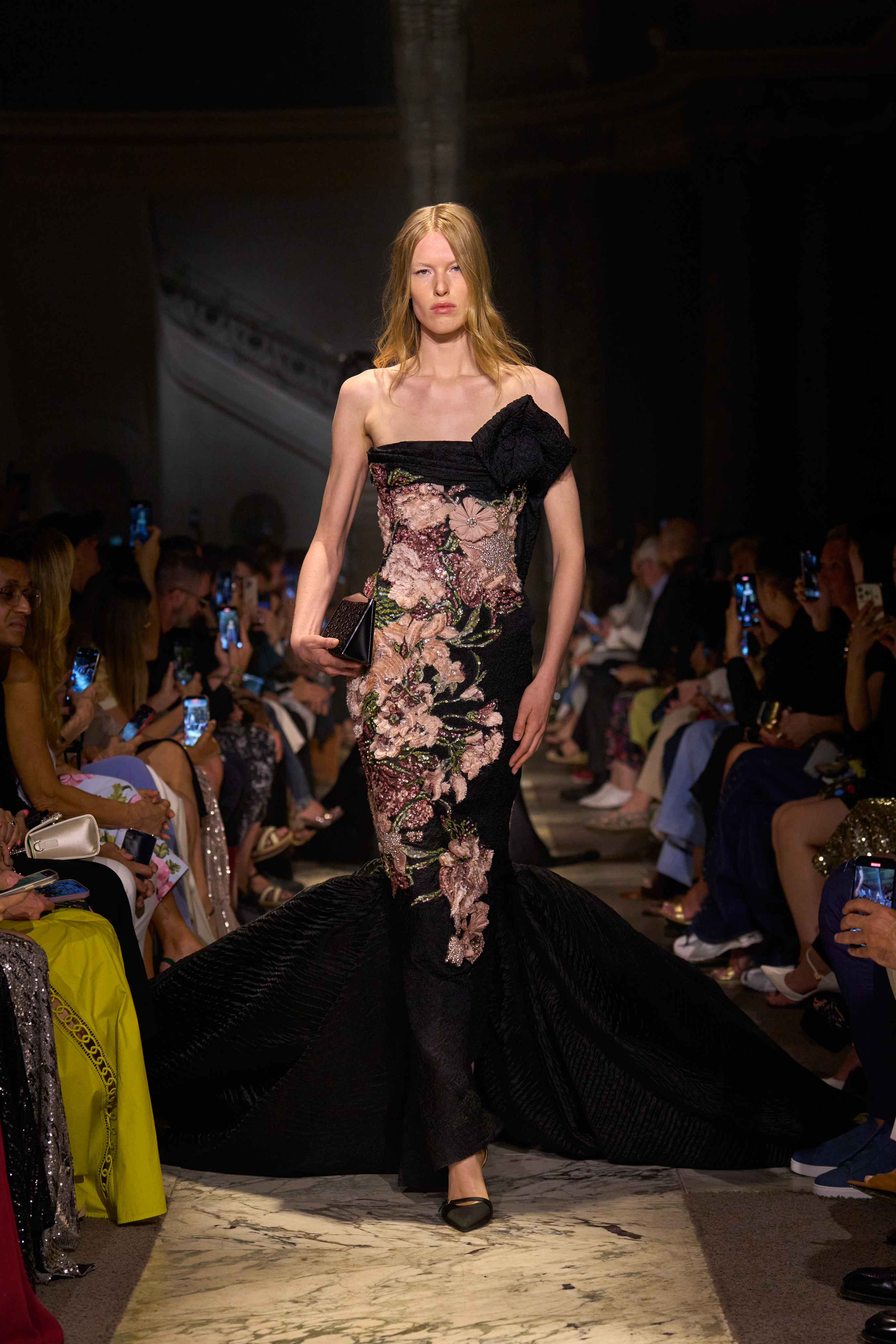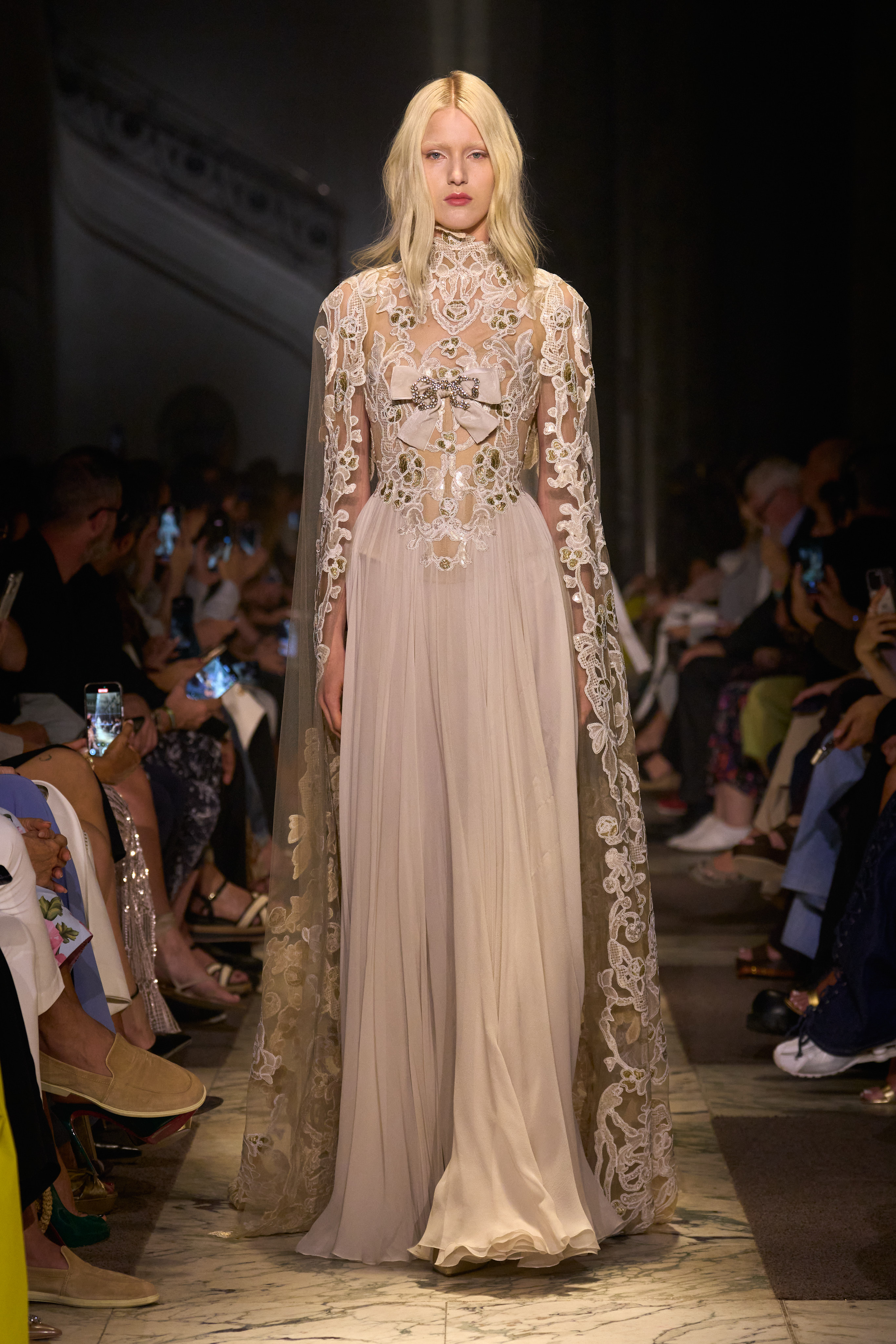Megkapóan izgalmas kép, ahogyan az éj leple alatt a modelleket földig érő bársonyköpenyekbe burkolja be Elie Saab, a fináléban megjelenő menyasszony gyöngyházfényben ragyogó, hímzett virágokkal borított királynői szettje feloldja és a mennyekbe emeli a viselőjét.