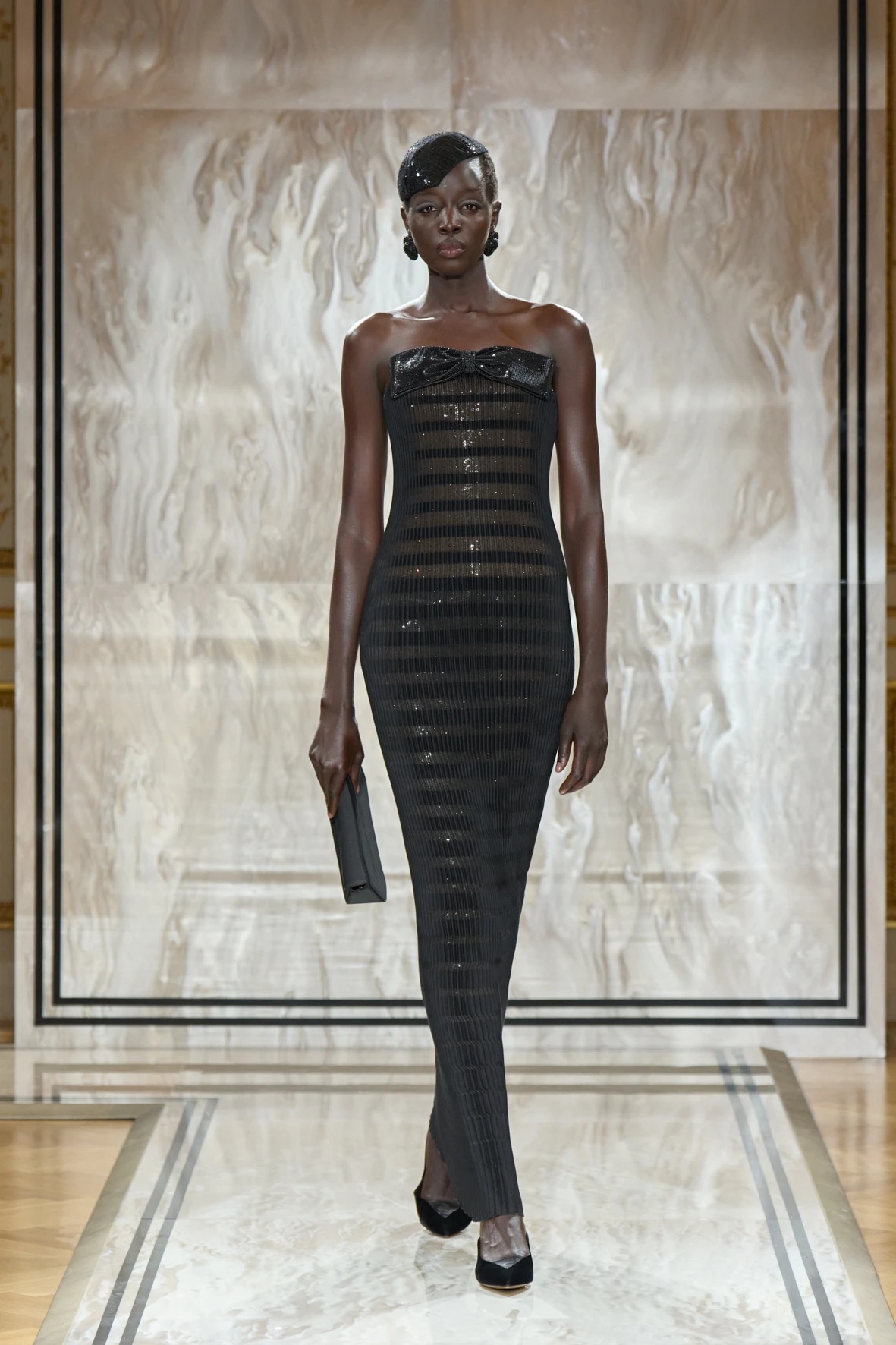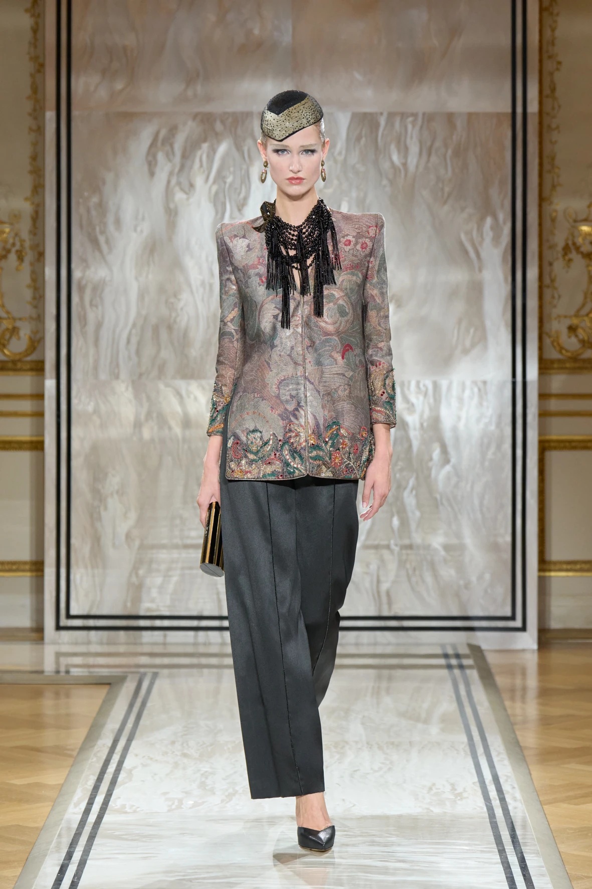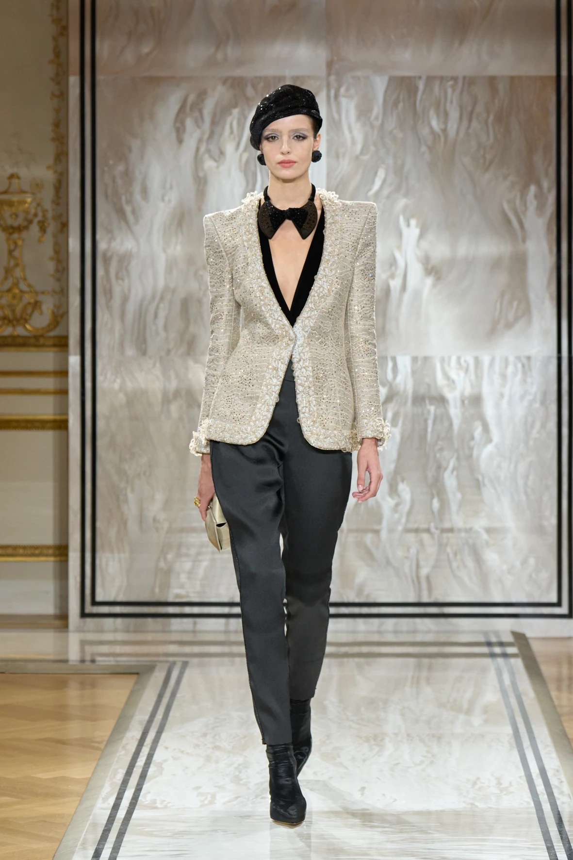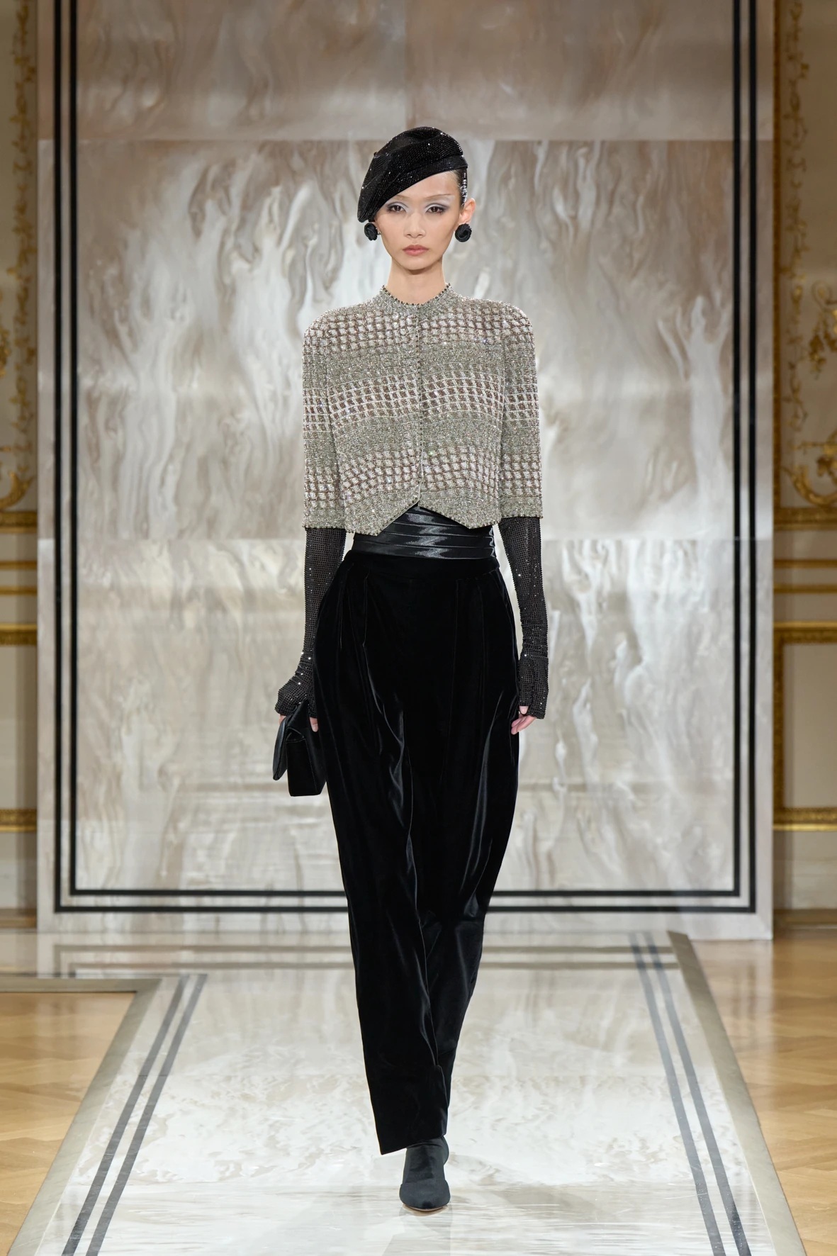 Bár Armanit gyakran a visszafogottság mestereként ünneplik, ezúttal engedte, hogy a teátrális érzékiség a textúrák tobzódásával és a fekete ezüsttel-arannyal való keverése új dimenziókat nyisson meg. A flitterek, a virágos applikációk, a kristálydíszítések és a bársony intarziák a felszíni ragyogás csendes káoszába csúsztak bele. A látszólagos lehetetlen közepette egy fontos kérdést is felvet: lehet-e egyszerre ragyogni és elrejtőzni?