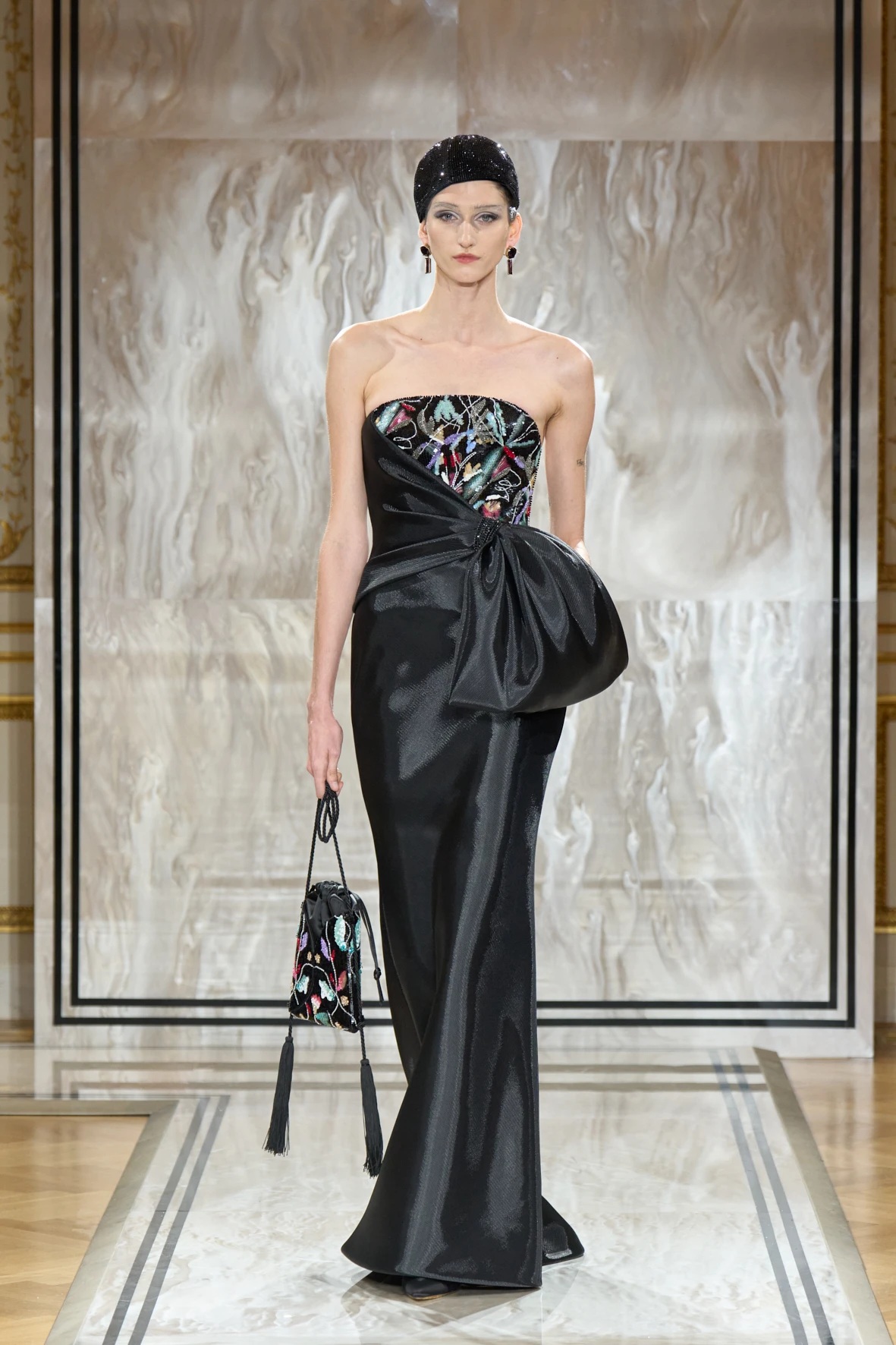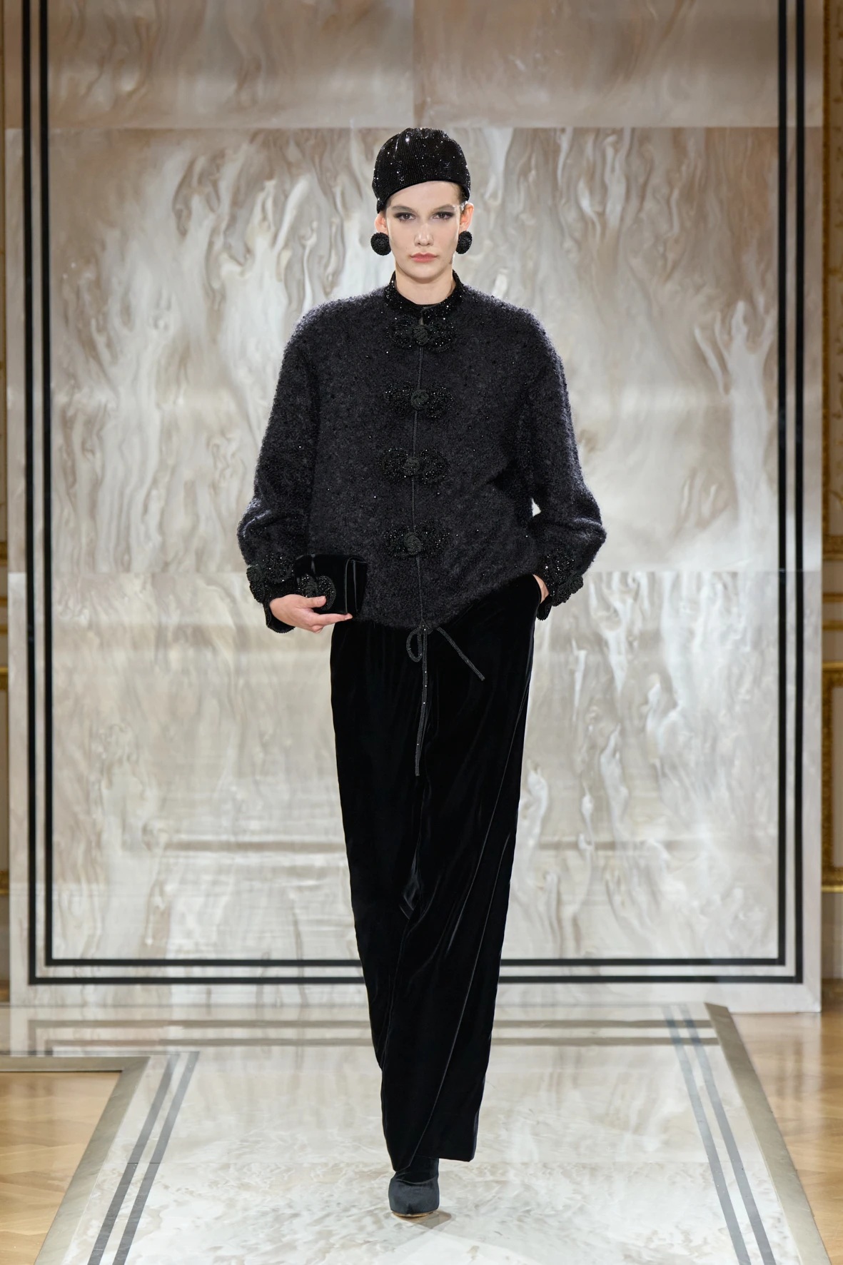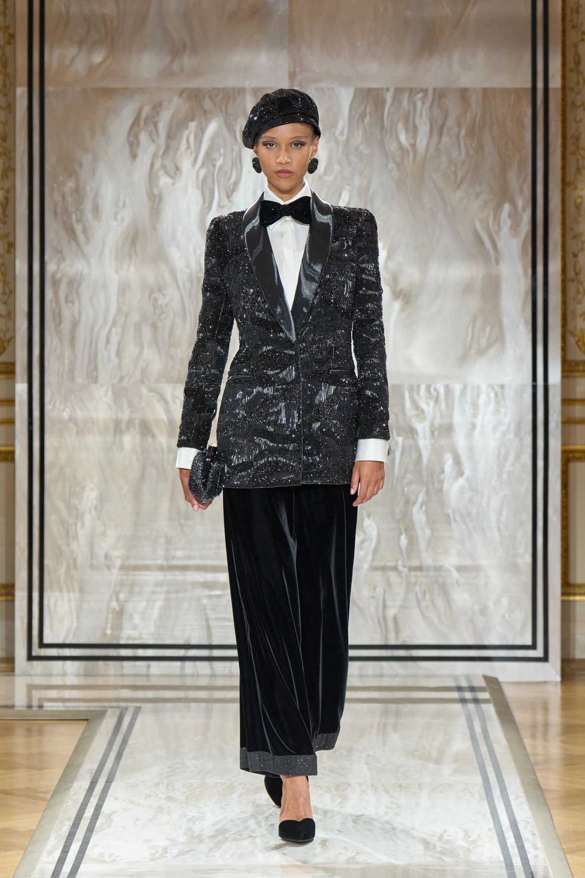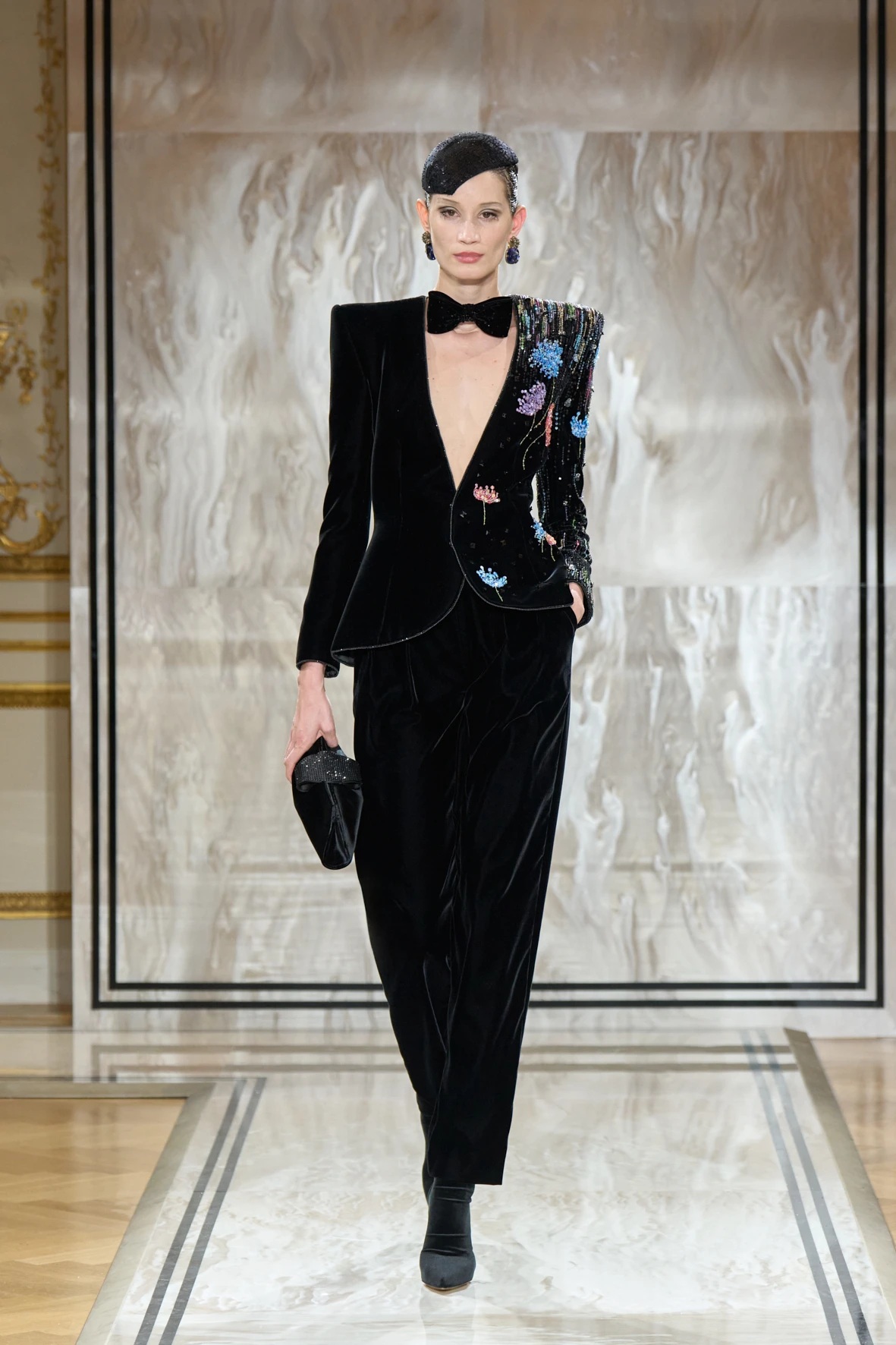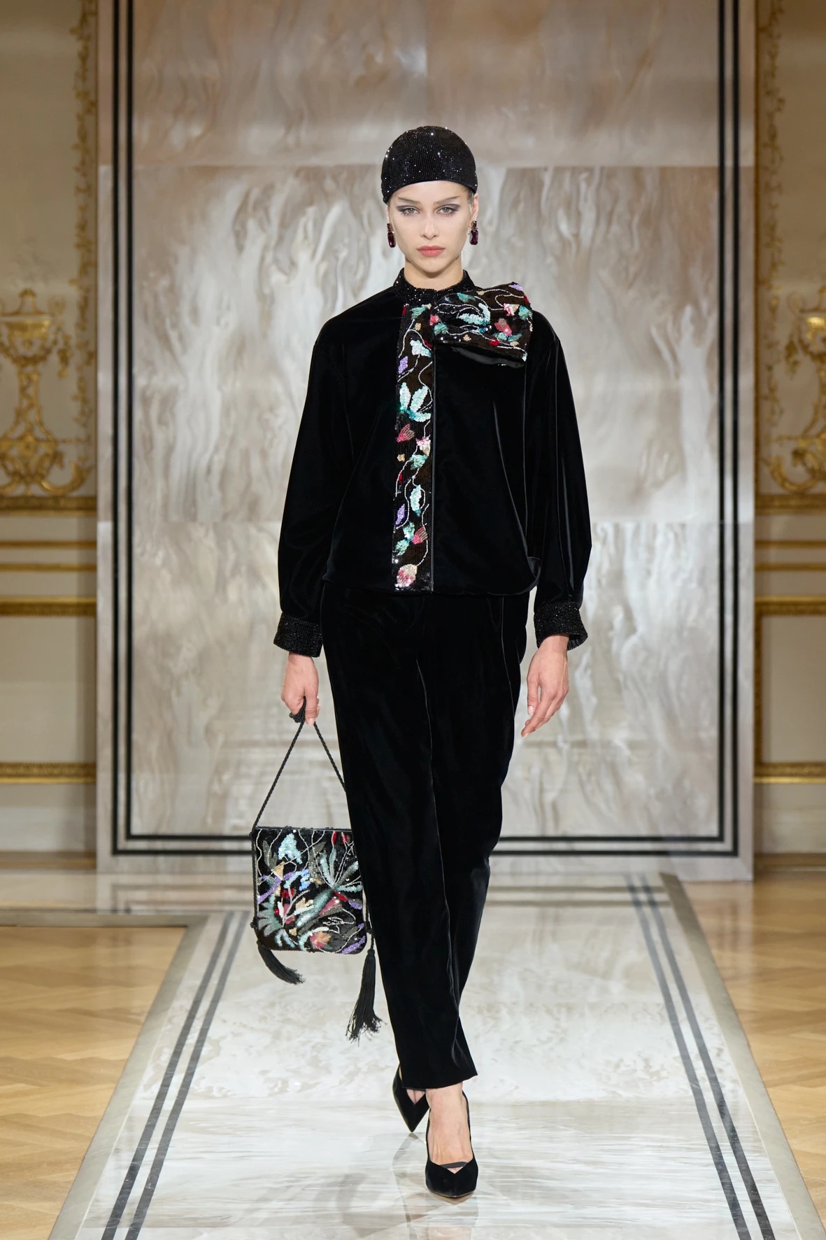 Bár Armanit gyakran a visszafogottság mestereként ünneplik, ezúttal engedte, hogy a teátrális érzékiség a textúrák tobzódásával és a fekete ezüsttel-arannyal való keverése új dimenziókat nyisson meg. A flitterek, a virágos applikációk, a kristálydíszítések és a bársony intarziák a felszíni ragyogás csendes káoszába csúsztak bele. A látszólagos lehetetlen közepette egy fontos kérdést is felvet: lehet-e egyszerre ragyogni és elrejtőzni?