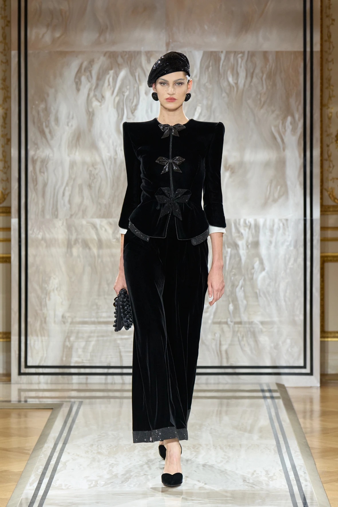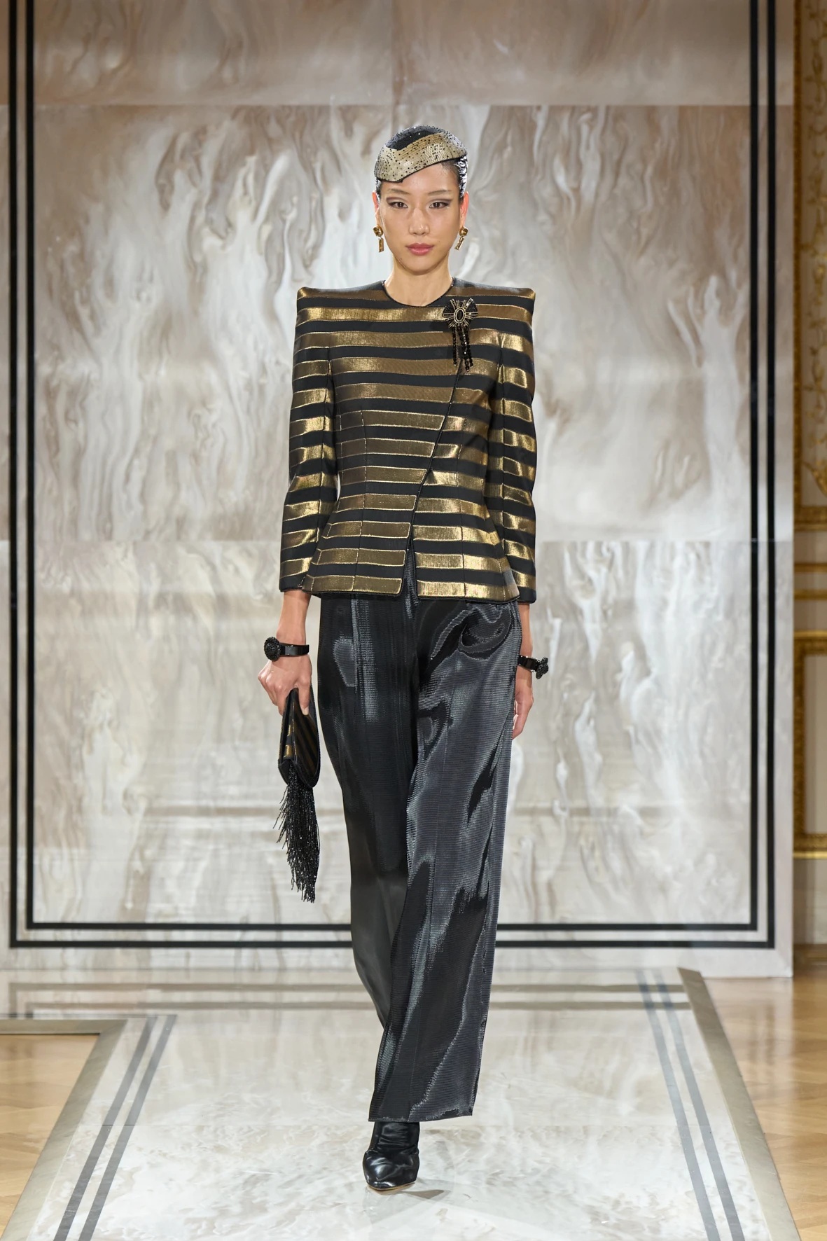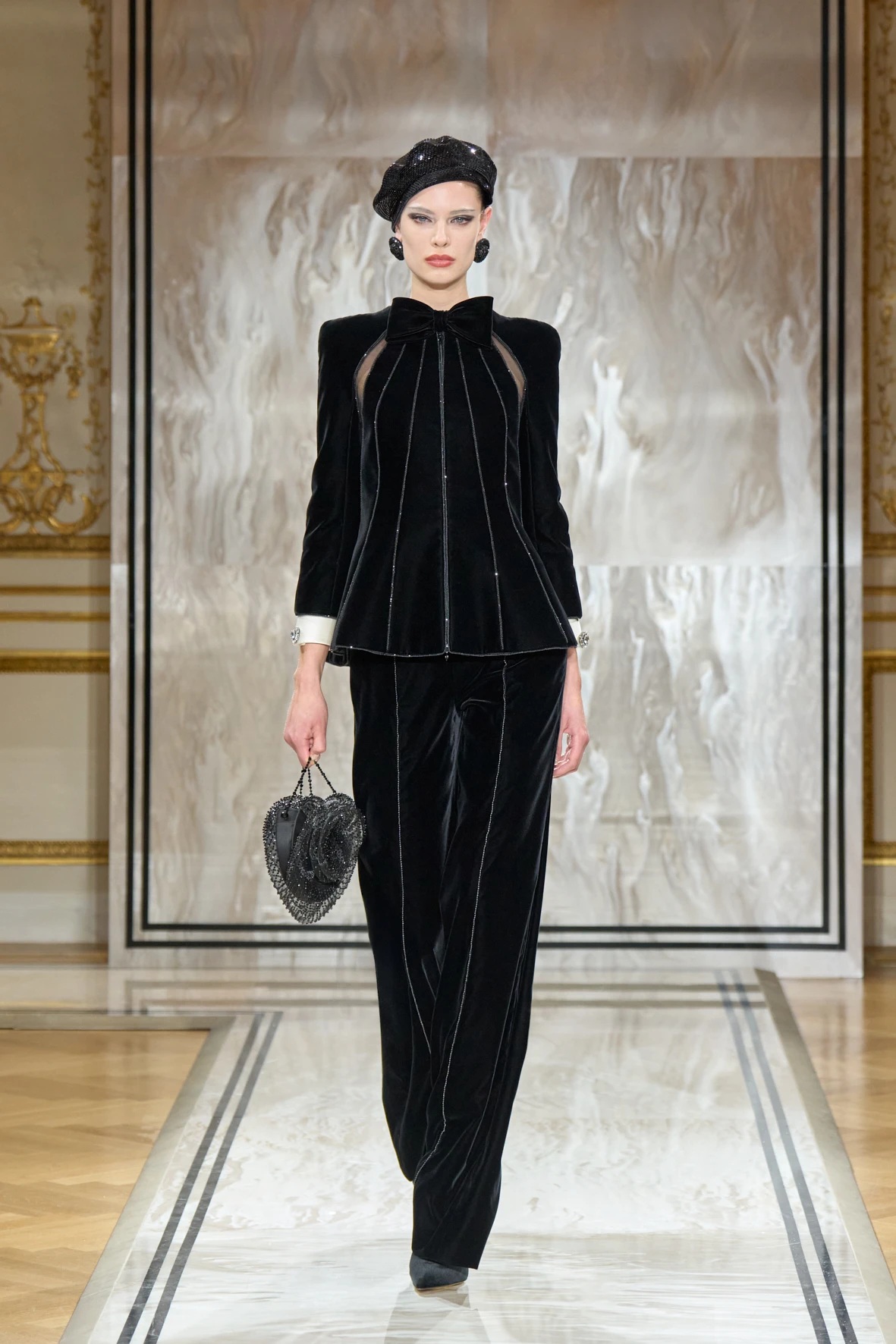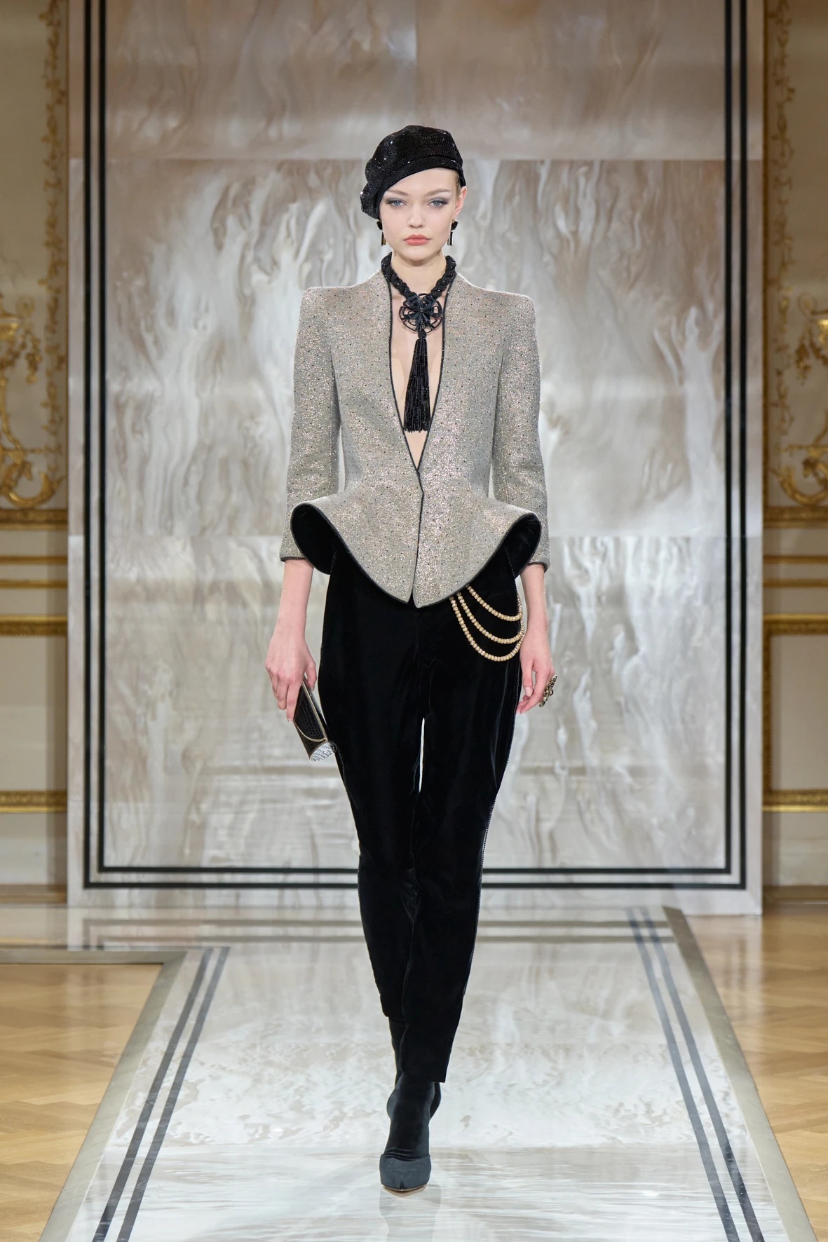 A gyűjtemény sziluettjei karcsúak és lágyan szigorúak – Armani szavaival élve: „mint a tintavonalak, diszkréten ragyogva, anélkül hogy vakítanának”. Az esti megjelenés új értelmezés kapott: a magas derekú, fekete bársonynadrágok kitűnően működtek a rövidre szabott zakókkal, a pagoda ujjakkal és az aszimmetrikus, peplumos felsőkkel. Finom átmenetet láthattuk a modern és a klasszikus sikk között, mintha egy kortárs Marlene Dietrich sétálna végig a kifutón – elegánsan, füstösen, szipkával és cigarettatartóval a kézben.