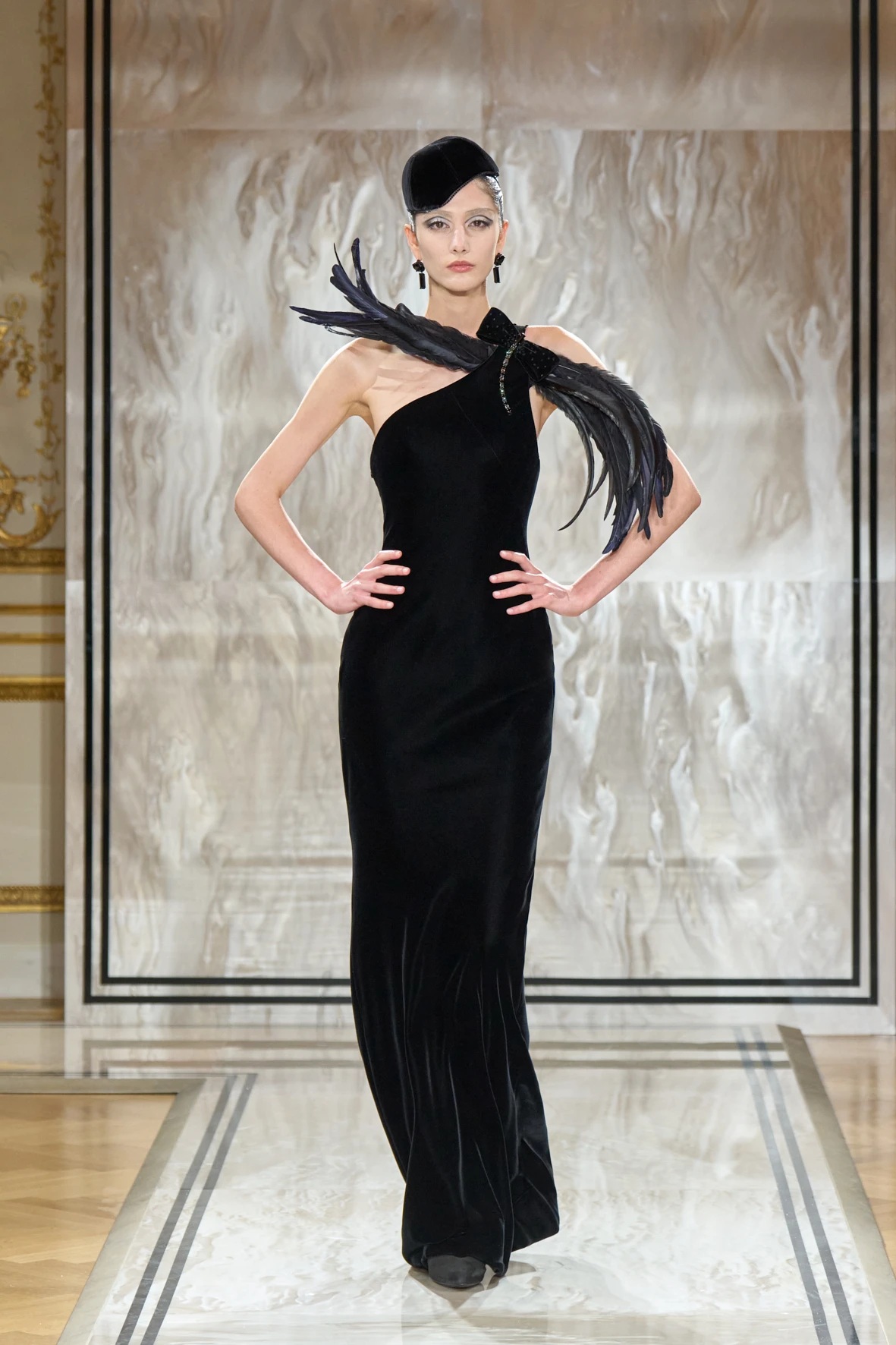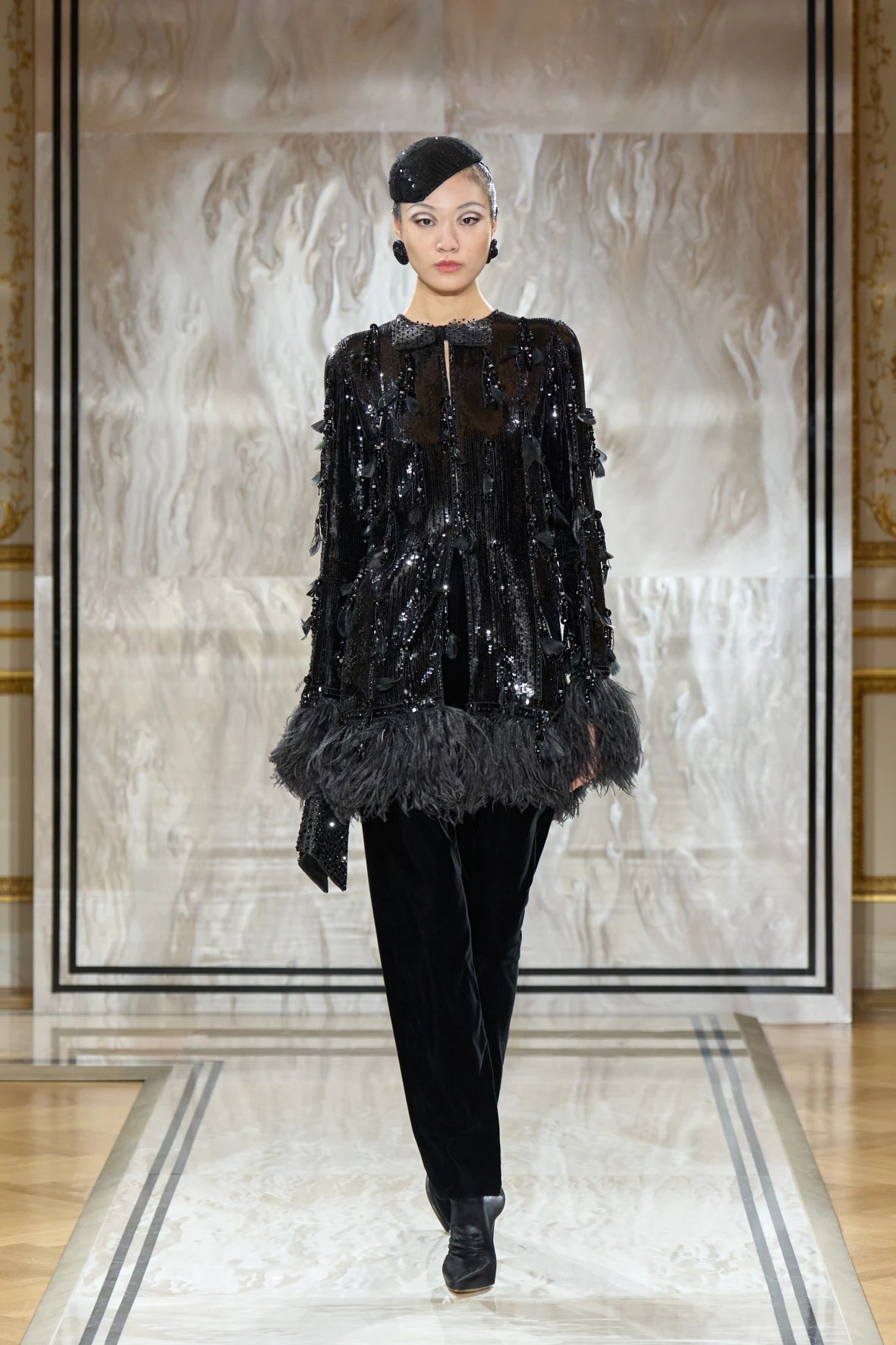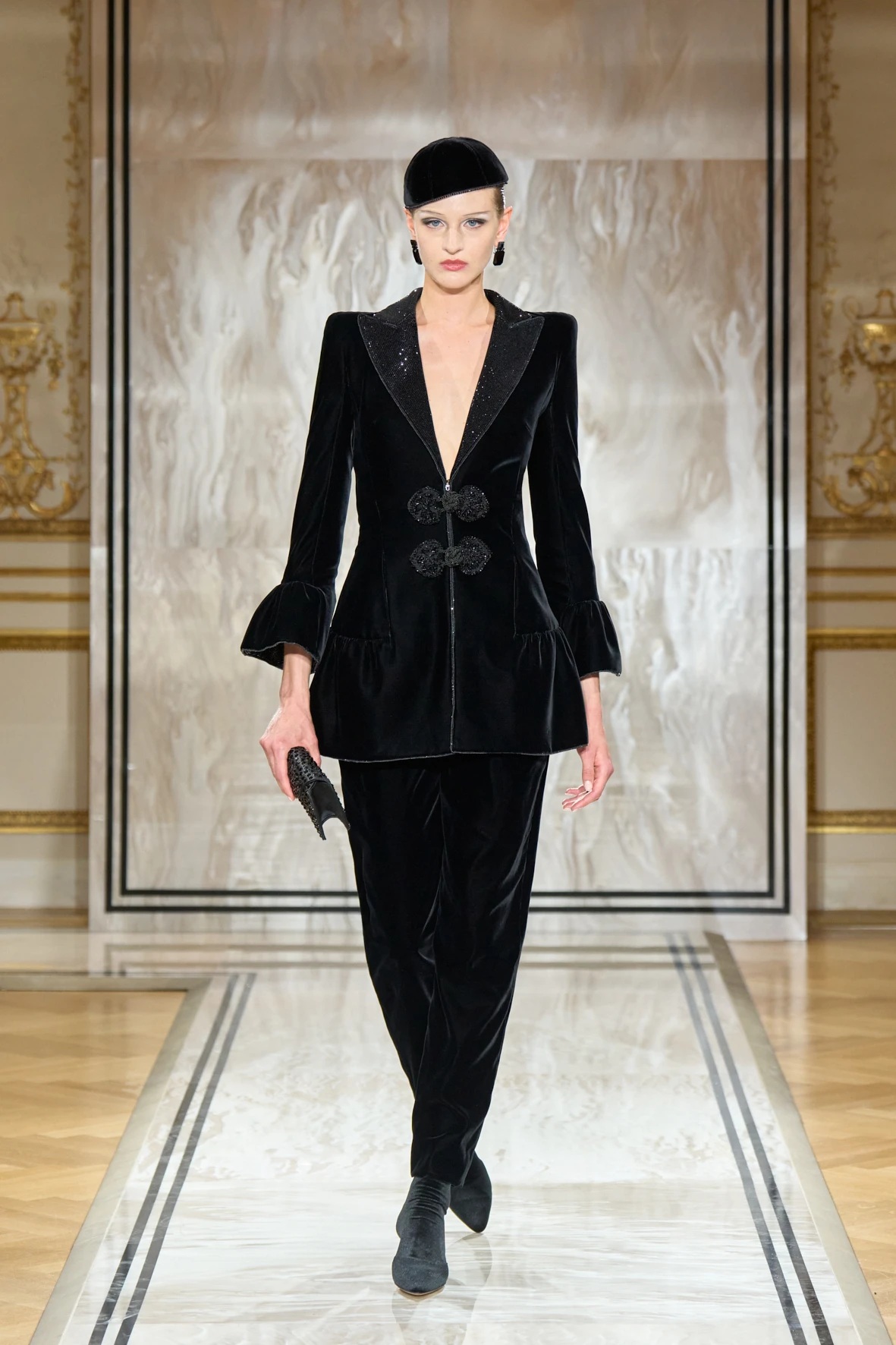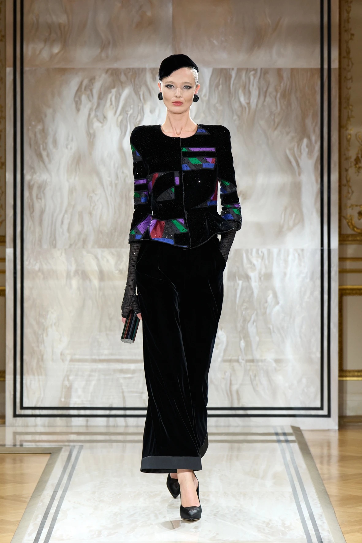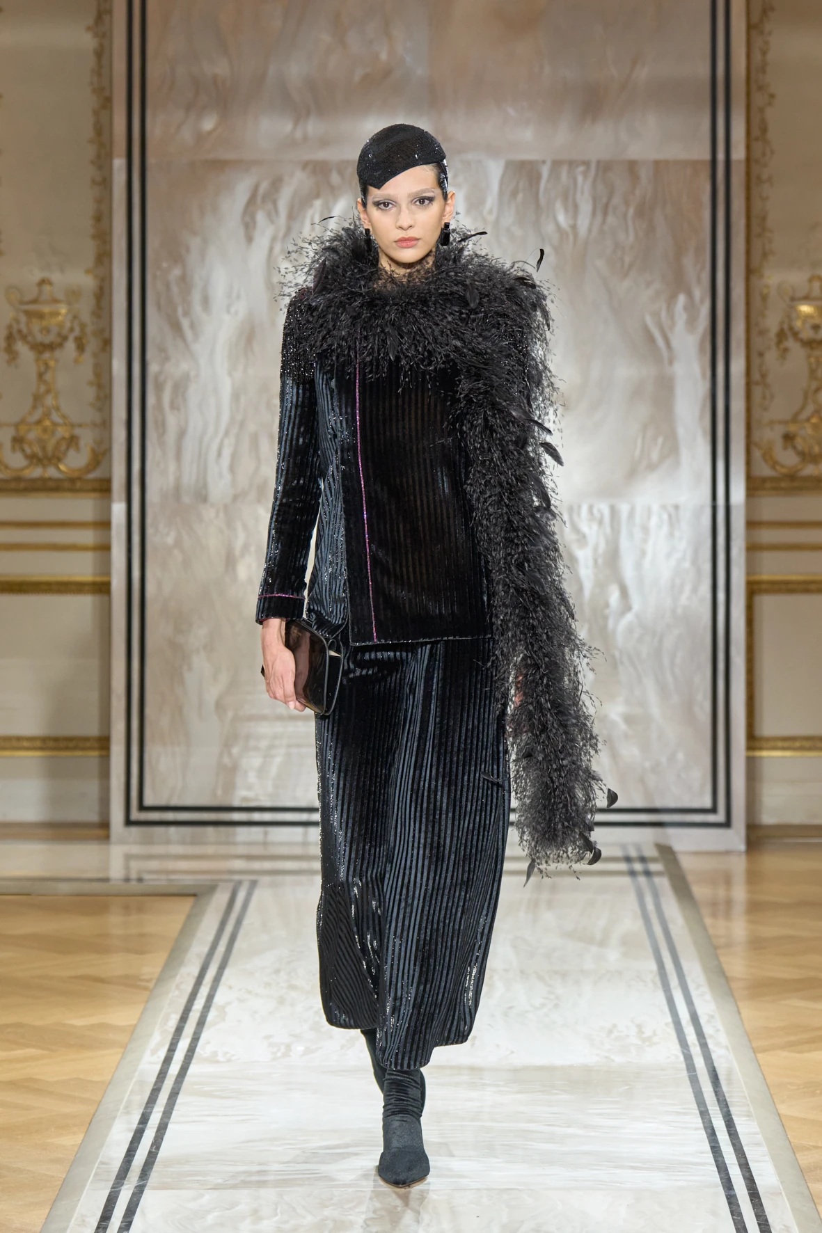 A gyűjtemény sziluettjei karcsúak és lágyan szigorúak – Armani szavaival élve: „mint a tintavonalak, diszkréten ragyogva, anélkül hogy vakítanának”. Az esti megjelenés új értelmezés kapott: a magas derekú, fekete bársonynadrágok kitűnően működtek a rövidre szabott zakókkal, a pagoda ujjakkal és az aszimmetrikus, peplumos felsőkkel. Finom átmenetet láthattuk a modern és a klasszikus sikk között, mintha egy kortárs Marlene Dietrich sétálna végig a kifutón – elegánsan, füstösen, szipkával és cigarettatartóval a kézben.