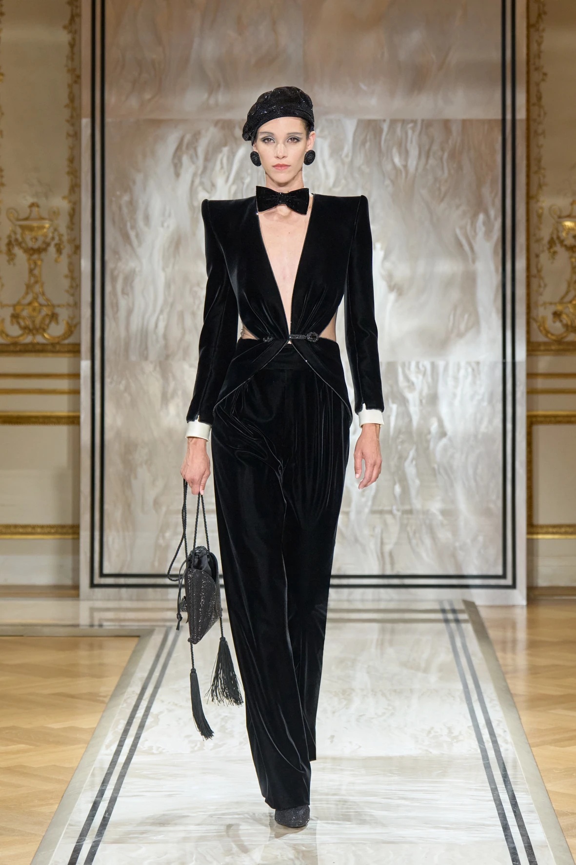 Armani újraértelmezi a női dandy archetípusát, miközben egy XXI. századi femme fatale születik meg. Olyan hősnőket láthatunk a kifutón, akik egyszerre végzetesek és titokzatosak. A klasszikus szmoking ebben a világban provokatív állításként jelenik meg: mélyen dekoltált estélyik hajtókás szabással, lebegő csokornyakkendővel, túlméretezett legyezőkkel és hegyes orrú cipőkkel.