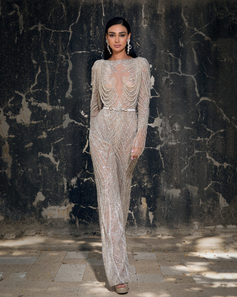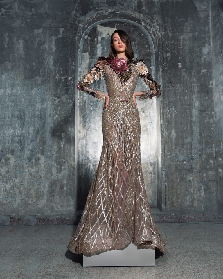 Nakad a pazar kreációiban mesterien egyensúlyoz az erő és a lágyság között, ezt az összhangot a gazdag textúrák harmoniájával, a szoborszerű sziluettek éteri muszlinjaival, a fényűző bársonyokkal és a leheletnyi tüllrétegekkel teremtette meg. Minden egyes sziluett a múlt egy-egy értékes ereklyéjeként jelent meg, a lenyűgöző kézi díszítések, a ragyogó kristálycsillagképek, a finoman hímzett virágmotívumok és a nőies szabásvonalak mind-mind egy elveszett időszak örökségéről meséltek.