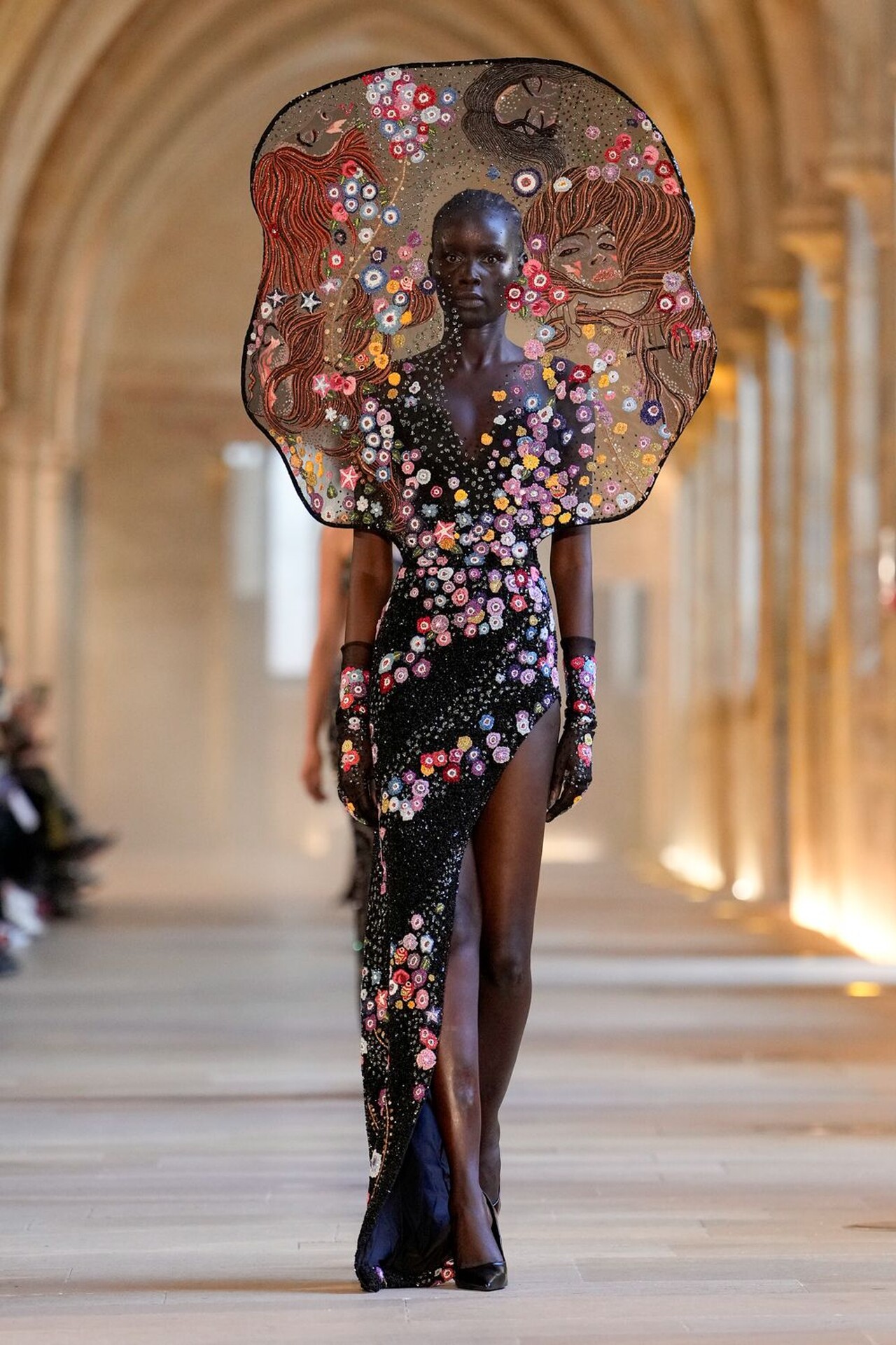 A bemutató olyan volt, mintha hét különálló show olvadt volna egybe, mégis teátrális kohézió tartotta össze. A nyitókép egy áttetsző anyagra hímzett, aranyszálas szívformájú kreációval hirdette meg a gyűjtemény szimbolikus tétjét: a szerelem egyszerre a páncél és a sebezhetőség jelképe. A drámai pillanatokat csendesebb, meditatív részletek váltották, mint a holdfényben ragyogó lótuszokkal hímzett ruha – az indiai kozmológiában az örök jelenlétre utal. A lótusz itt nem puszta díszítés, hanem szent szimbólum, amely a spirituális és a romantikus dimenzió között teremtett hidat.