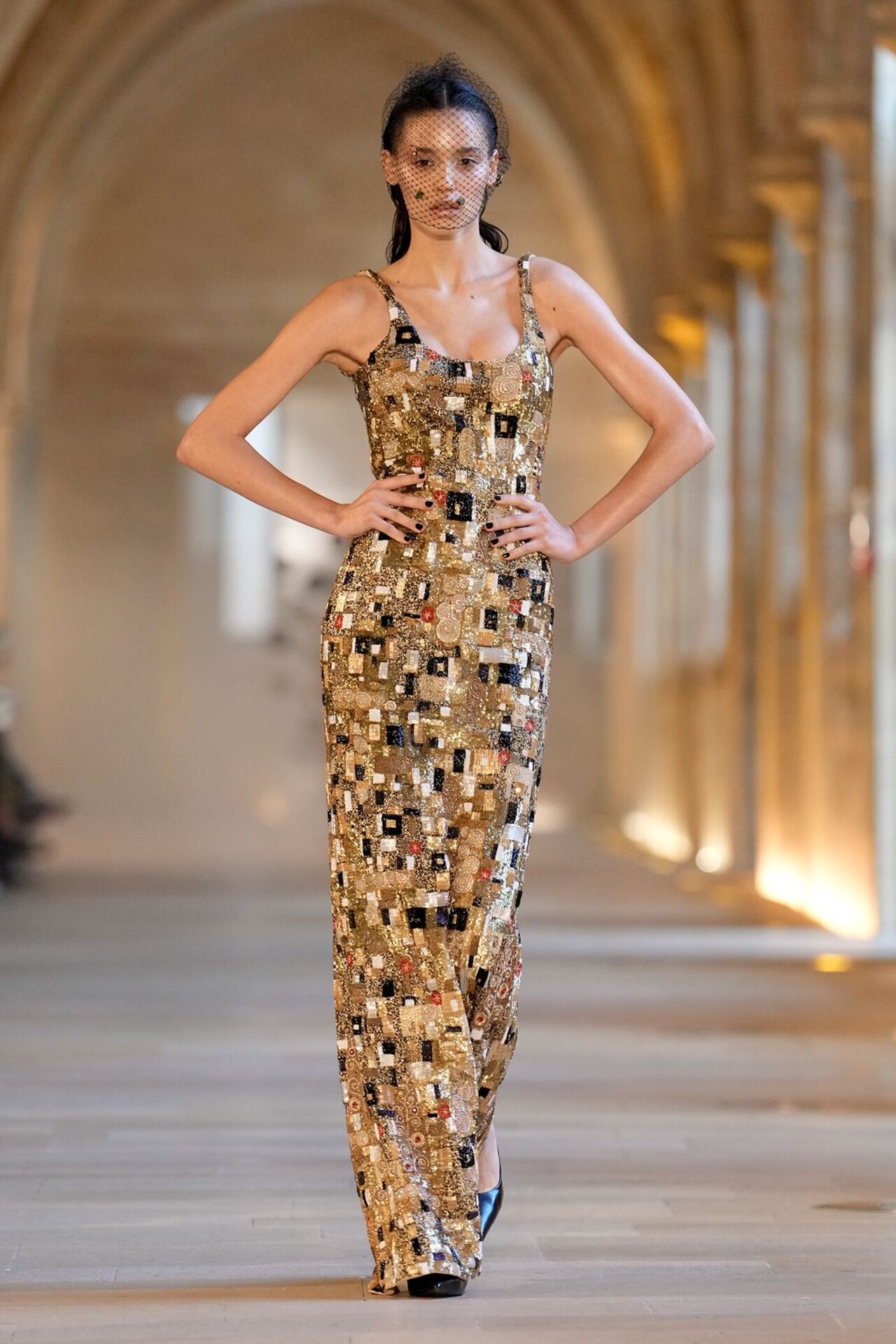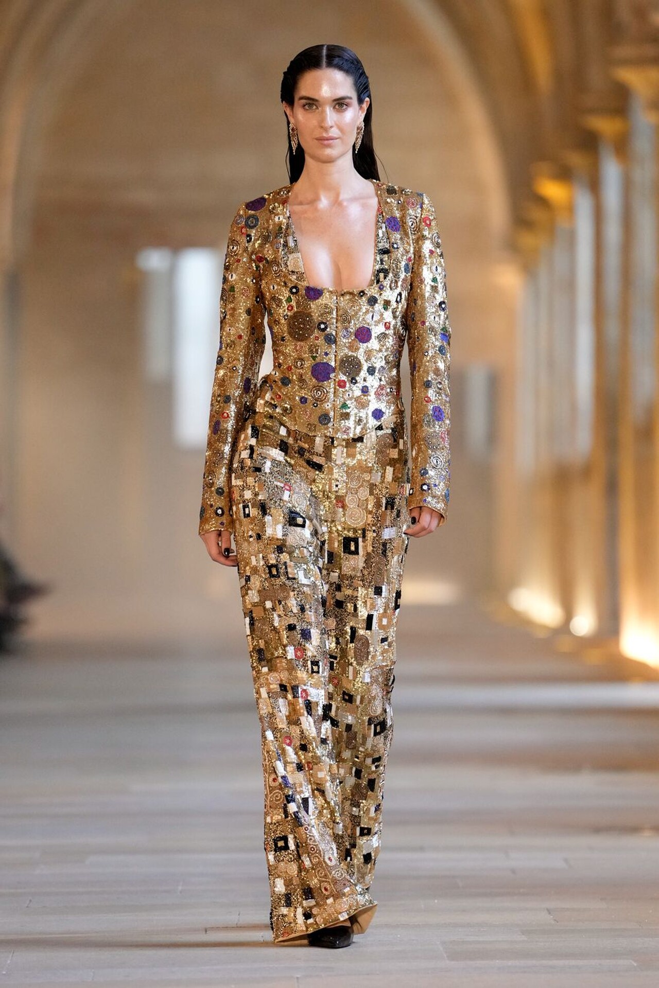 A ruhasorozat legizgalmasabb dialógusát Gustav Klimt képi világával folytatta Mishra: aranymozaikok, szárnyaló glóriák és érzéki textúrák idézték meg osztrák festő szecessziós művészetét. Ezek a látomások az indiai kézművesség legfinomabb technikáival keltek életre. Az aari, zardozi, naqshi, dabka és fareesha hímzések mellett a gyöngyök, az édesvízi gyöngyök, a kundan és a flitterek szőttek fényáradatot az organzára, a tüllre, a bársonyra és a szaténra. A szoborszerű sziluetteket betétes szerkezetek tartották, amelyeket Mishra műhelyében helyi mesterek fémműves technikákkal formáltak meg. Nem véletlen, hogy a kollekció több mint kétezer (!!!) kézműves munkáját dicséri.