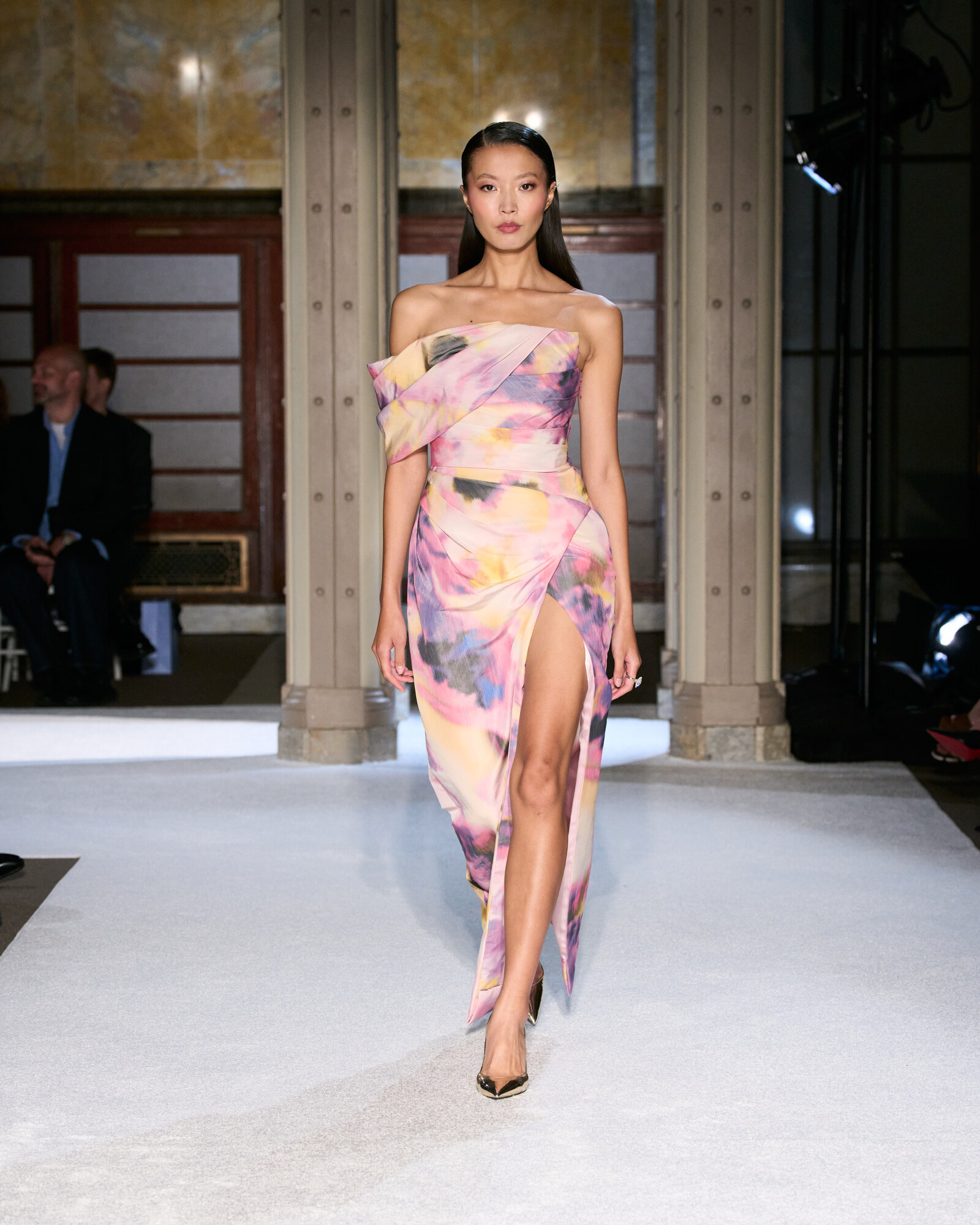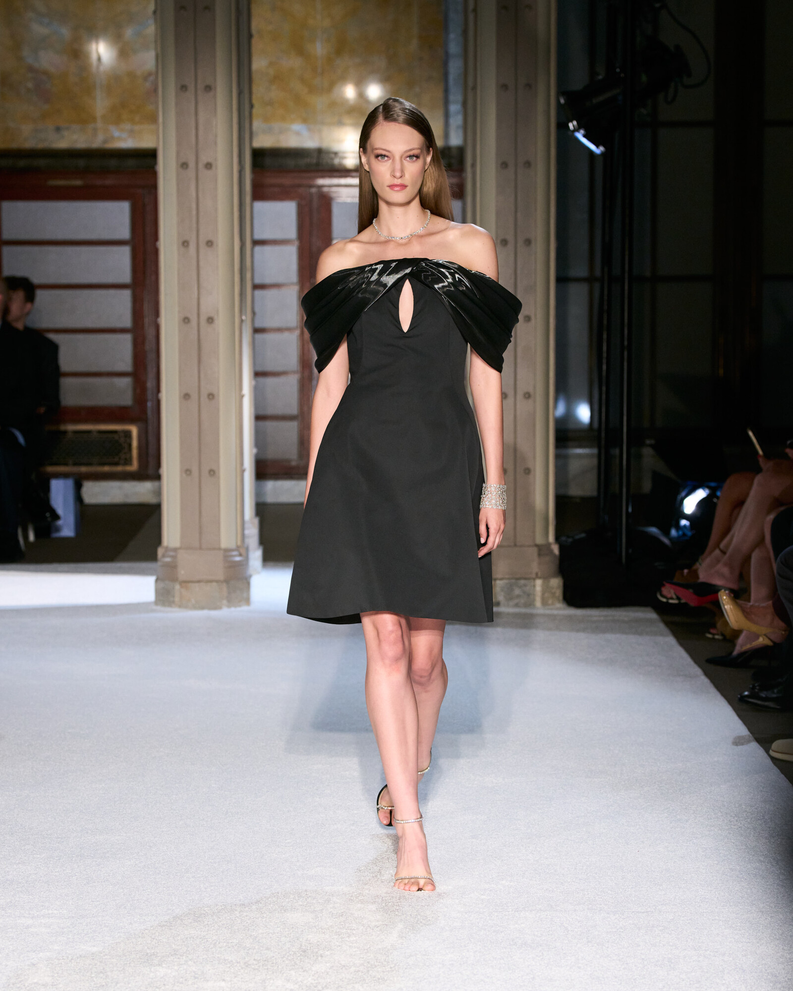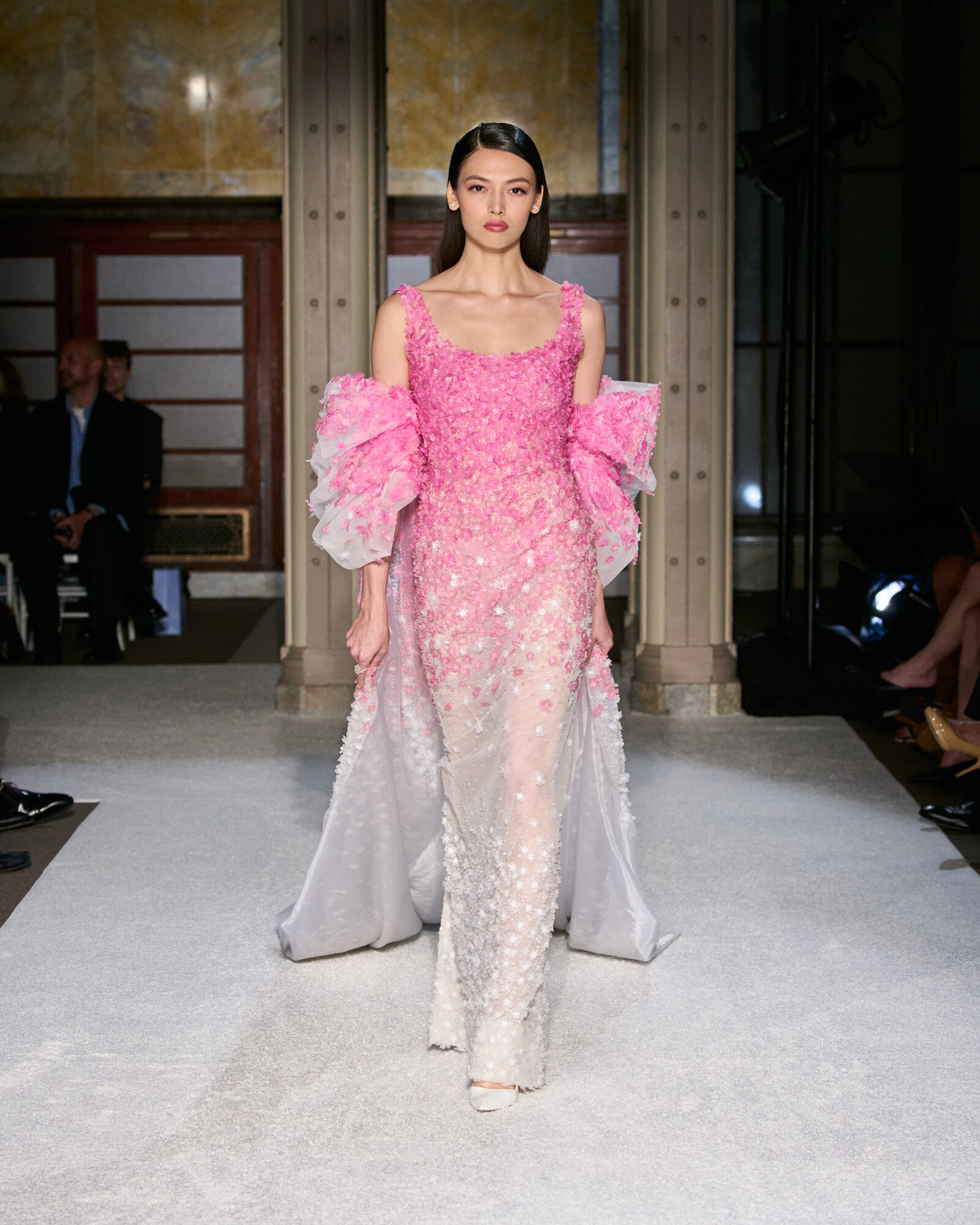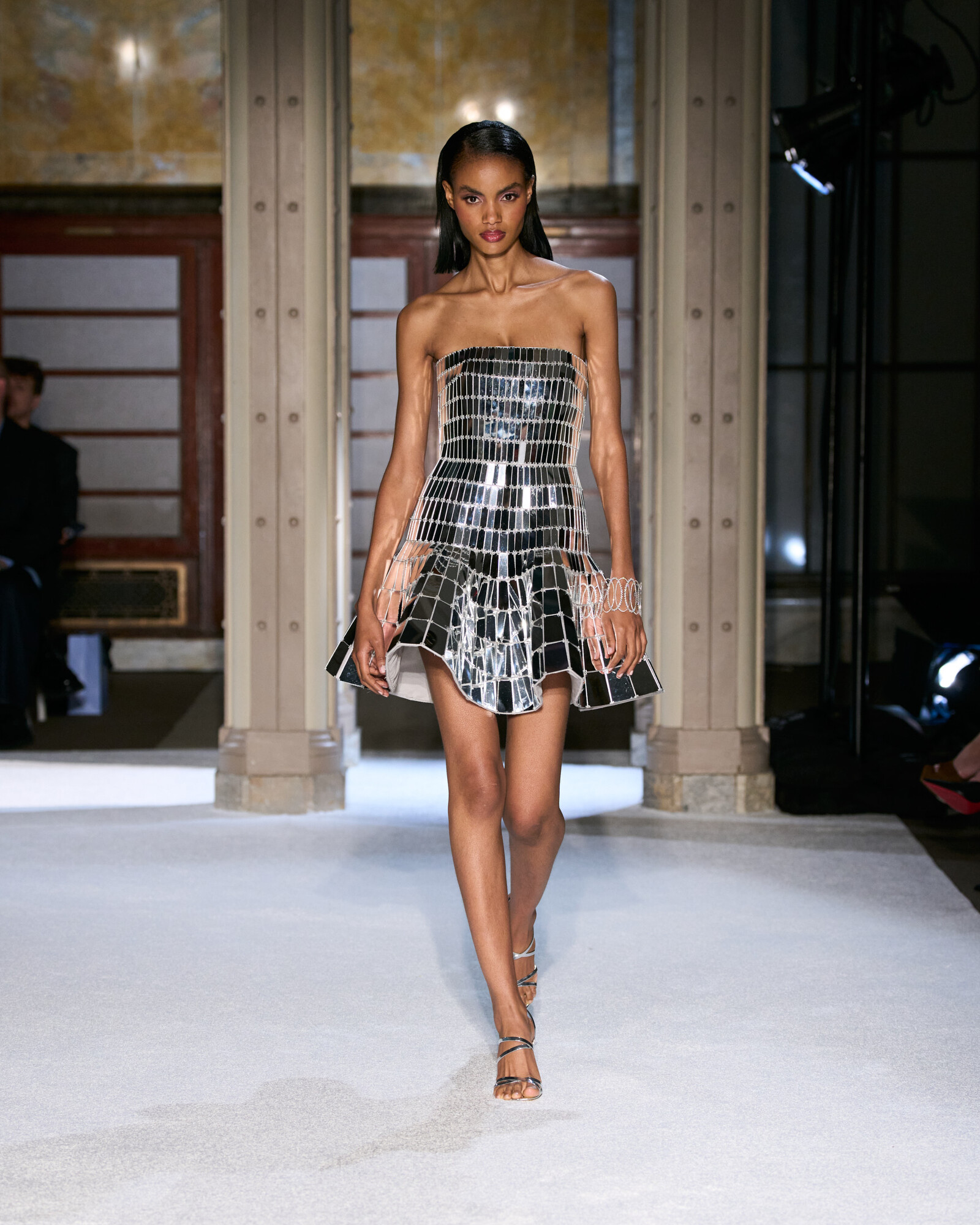 Az anyaghasználatát a lenyűgöző sokszínűség jellemzi, ez hozta el a kollekció szobrászati jellegét is. Az ombre sifonok és selymek Georgia O’Keeffe virágos érzékenységét idézték meg, a ropogós hajtogatások és a strukturált koktélruhák a századközepi geometrikus vonalvezetés szigorát sugallták. Lézerrel vágott plexi, metál felületek és hordható domborművek, mind-mind olyan egymásra rétegezett textúrák, amelyek minden egyes mozdulatot vizuális élménnyé tesznek.