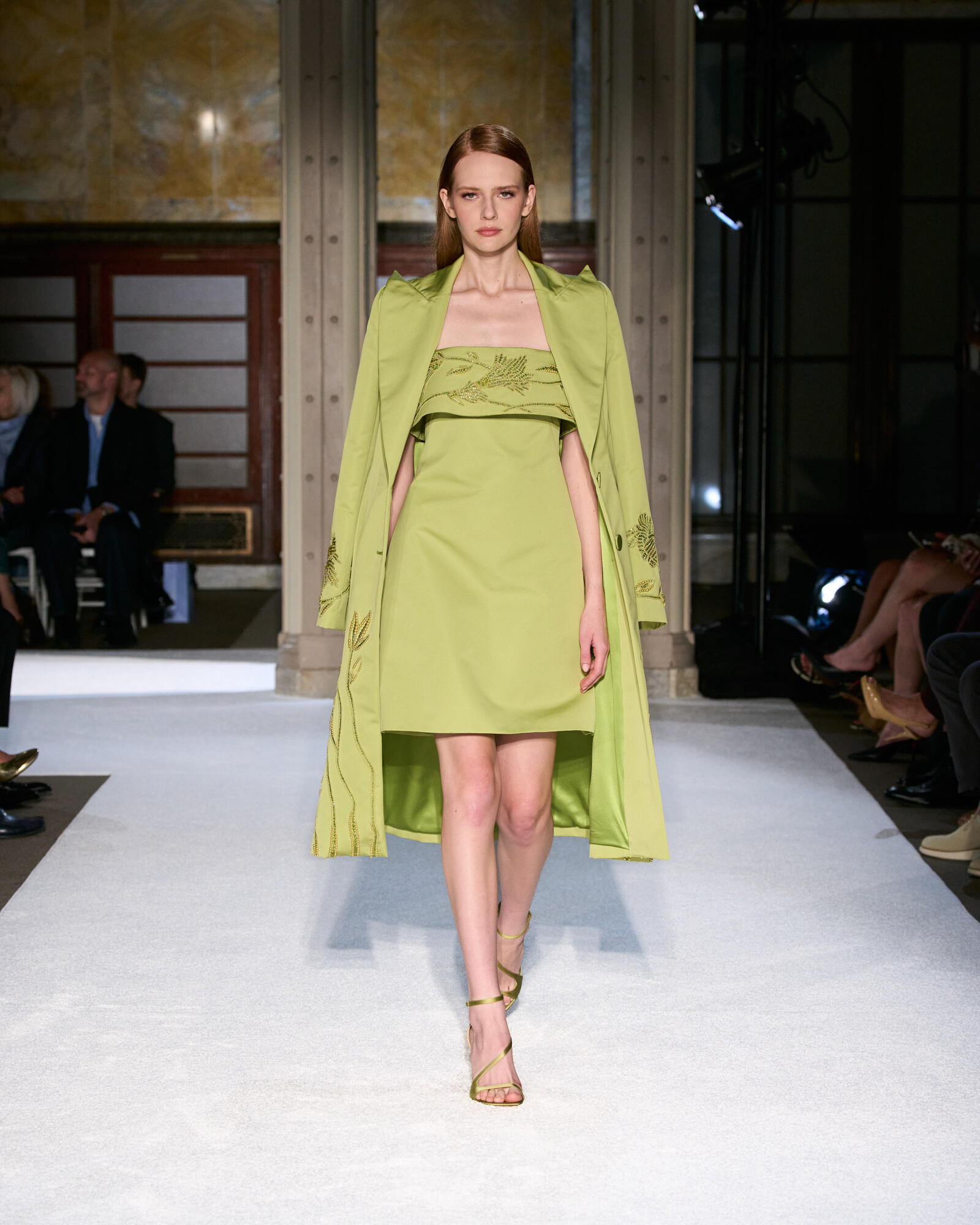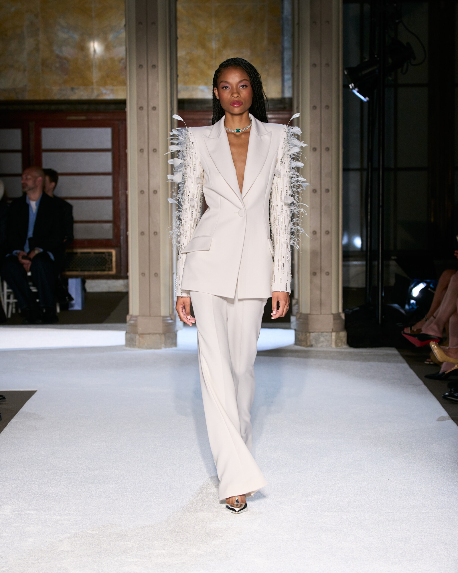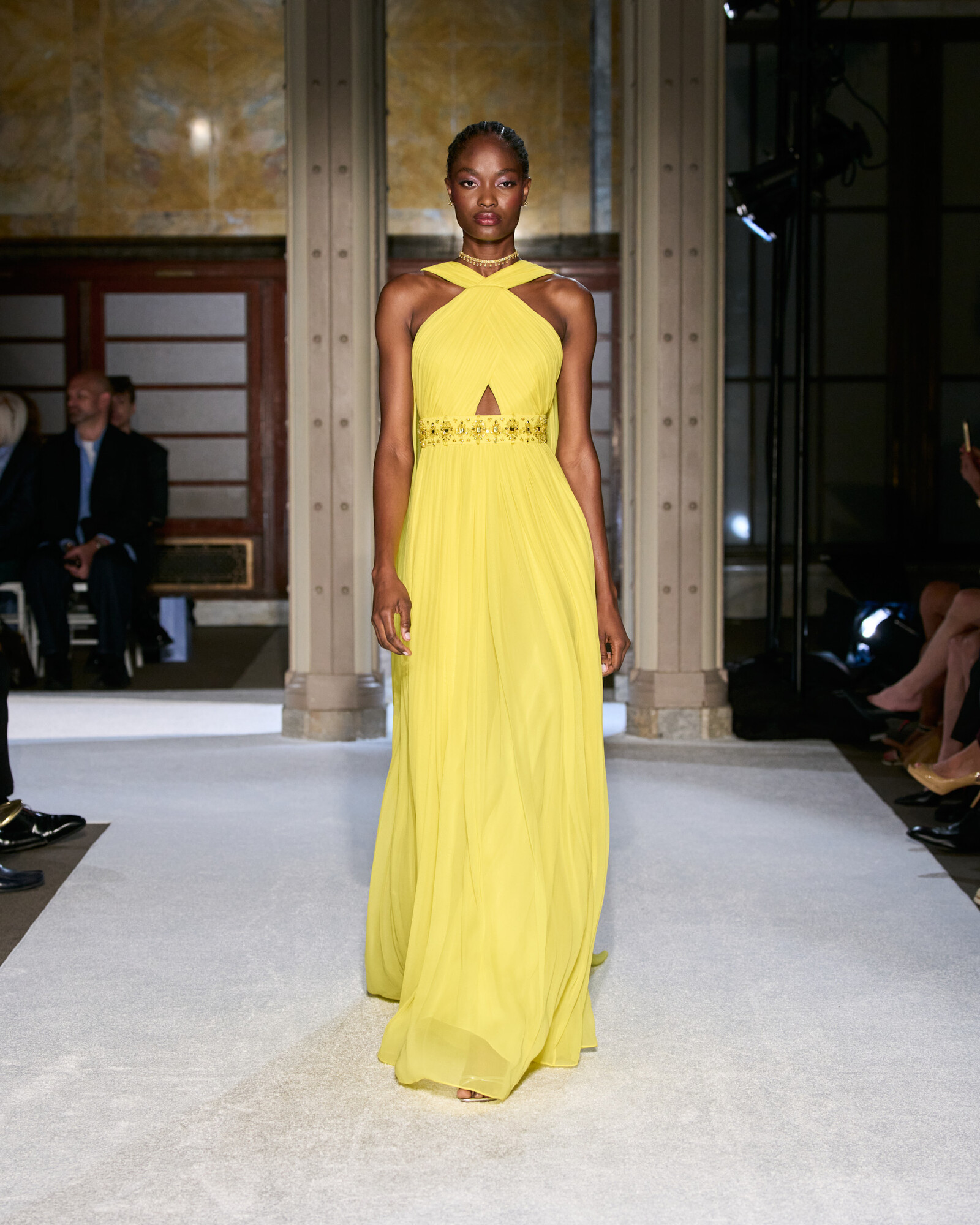 Az anyaghasználatát a lenyűgöző sokszínűség jellemzi, ez hozta el a kollekció szobrászati jellegét is. Az ombre sifonok és selymek Georgia O’Keeffe virágos érzékenységét idézték meg, a ropogós hajtogatások és a strukturált koktélruhák a századközepi geometrikus vonalvezetés szigorát sugallták. Lézerrel vágott plexi, metál felületek és hordható domborművek, mind-mind olyan egymásra rétegezett textúrák, amelyek minden egyes mozdulatot vizuális élménnyé tesznek.