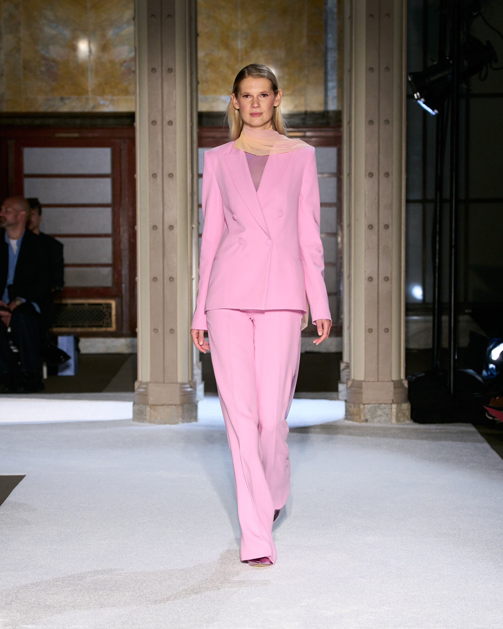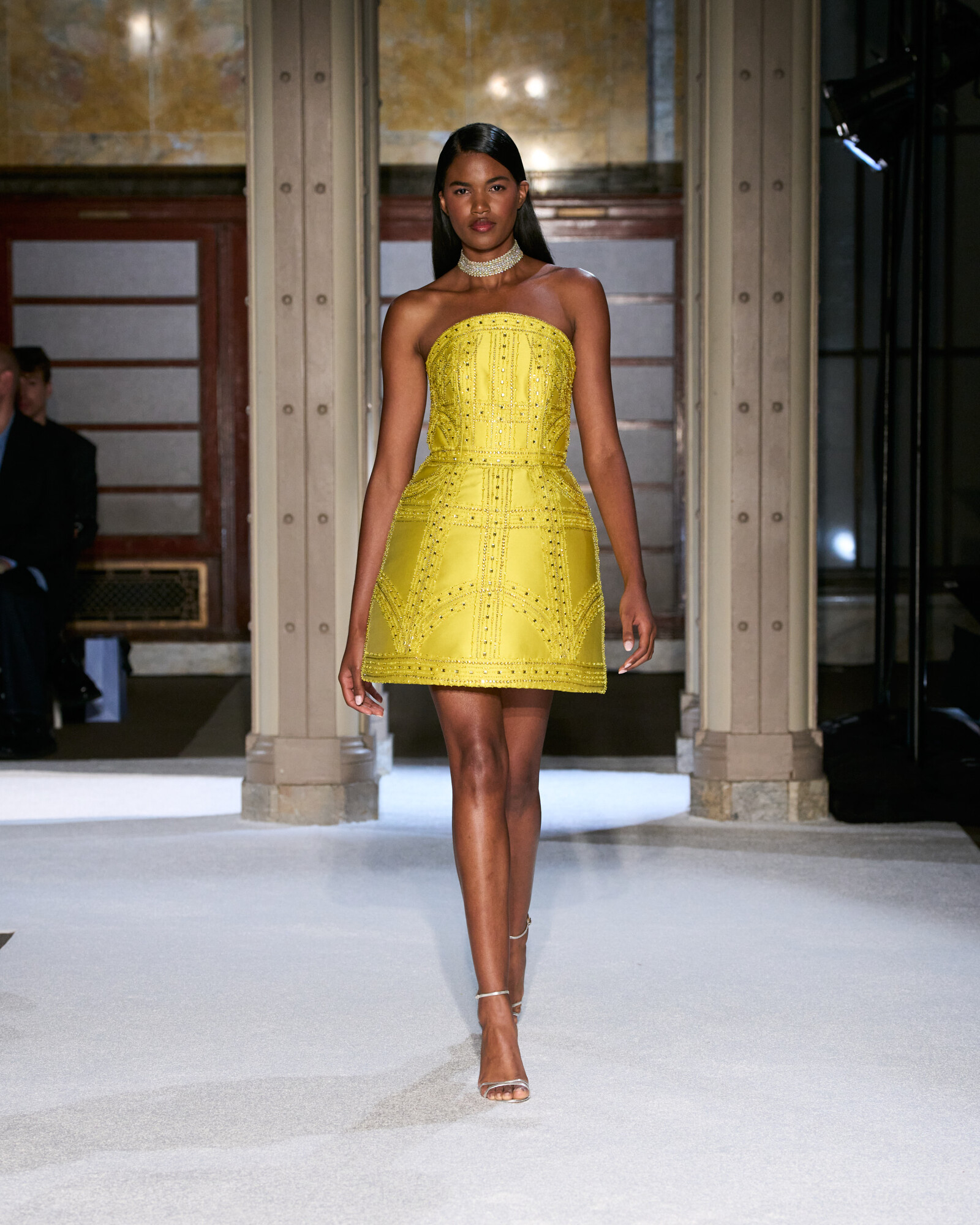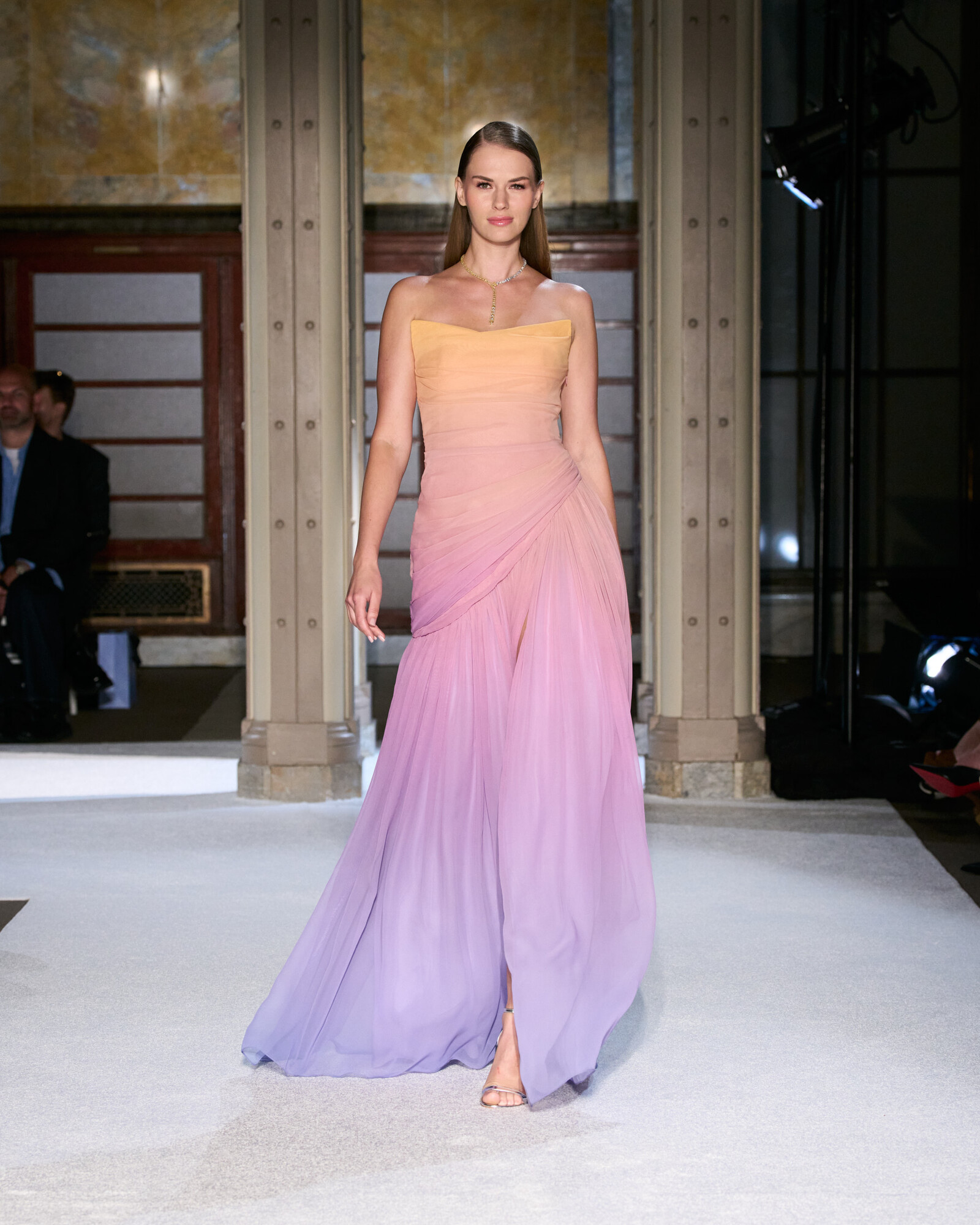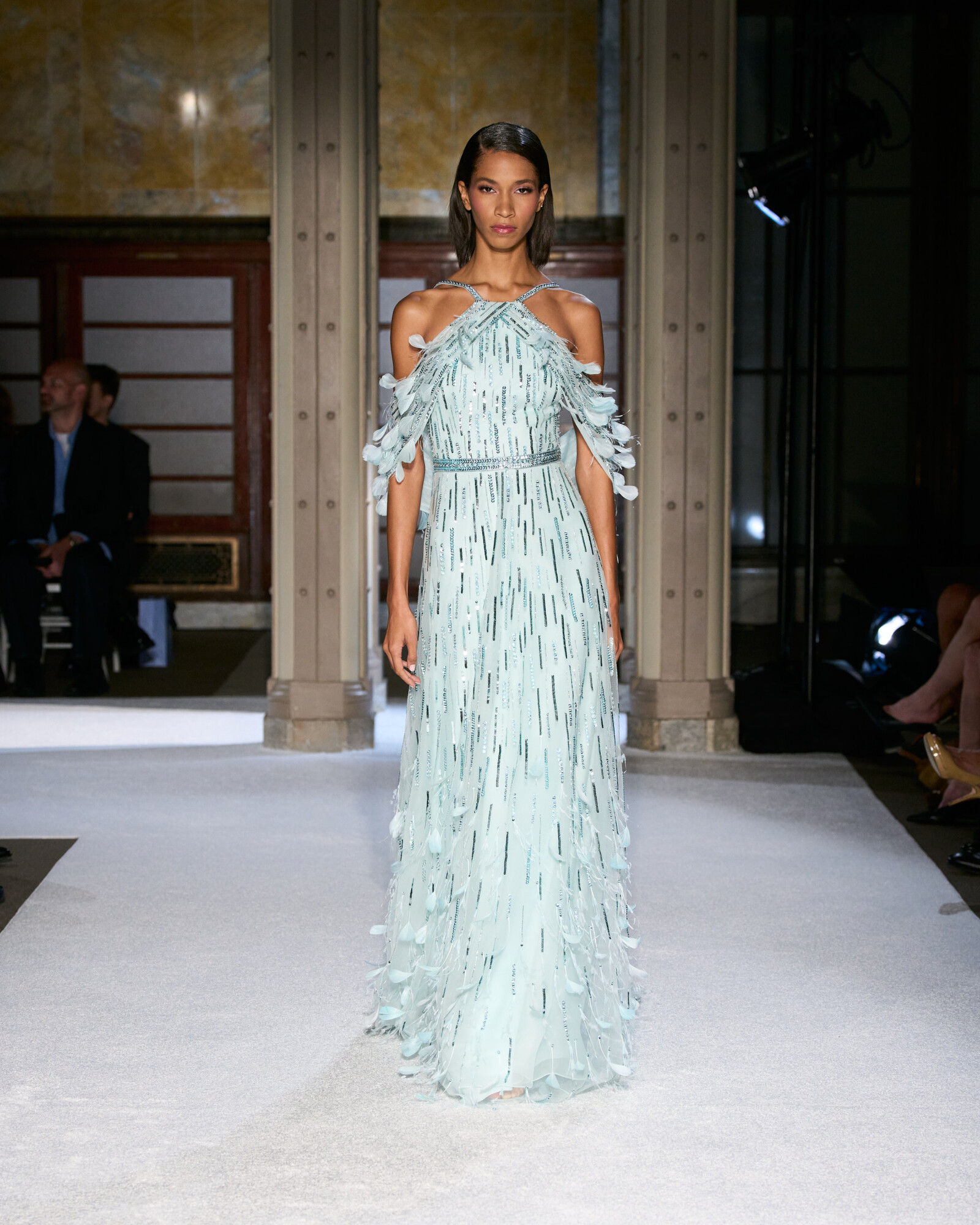 Az anyaghasználatát a lenyűgöző sokszínűség jellemzi, ez hozta el a kollekció szobrászati jellegét is. Az ombre sifonok és selymek Georgia O’Keeffe virágos érzékenységét idézték meg, a ropogós hajtogatások és a strukturált koktélruhák a századközepi geometrikus vonalvezetés szigorát sugallták. Lézerrel vágott plexi, metál felületek és hordható domborművek, mind-mind olyan egymásra rétegezett textúrák, amelyek minden egyes mozdulatot vizuális élménnyé tesznek.