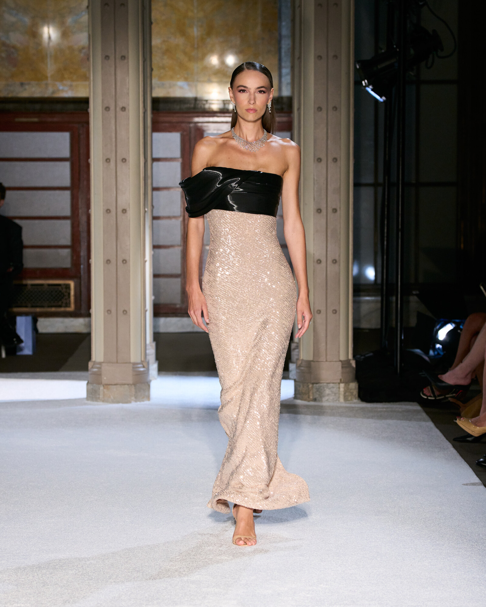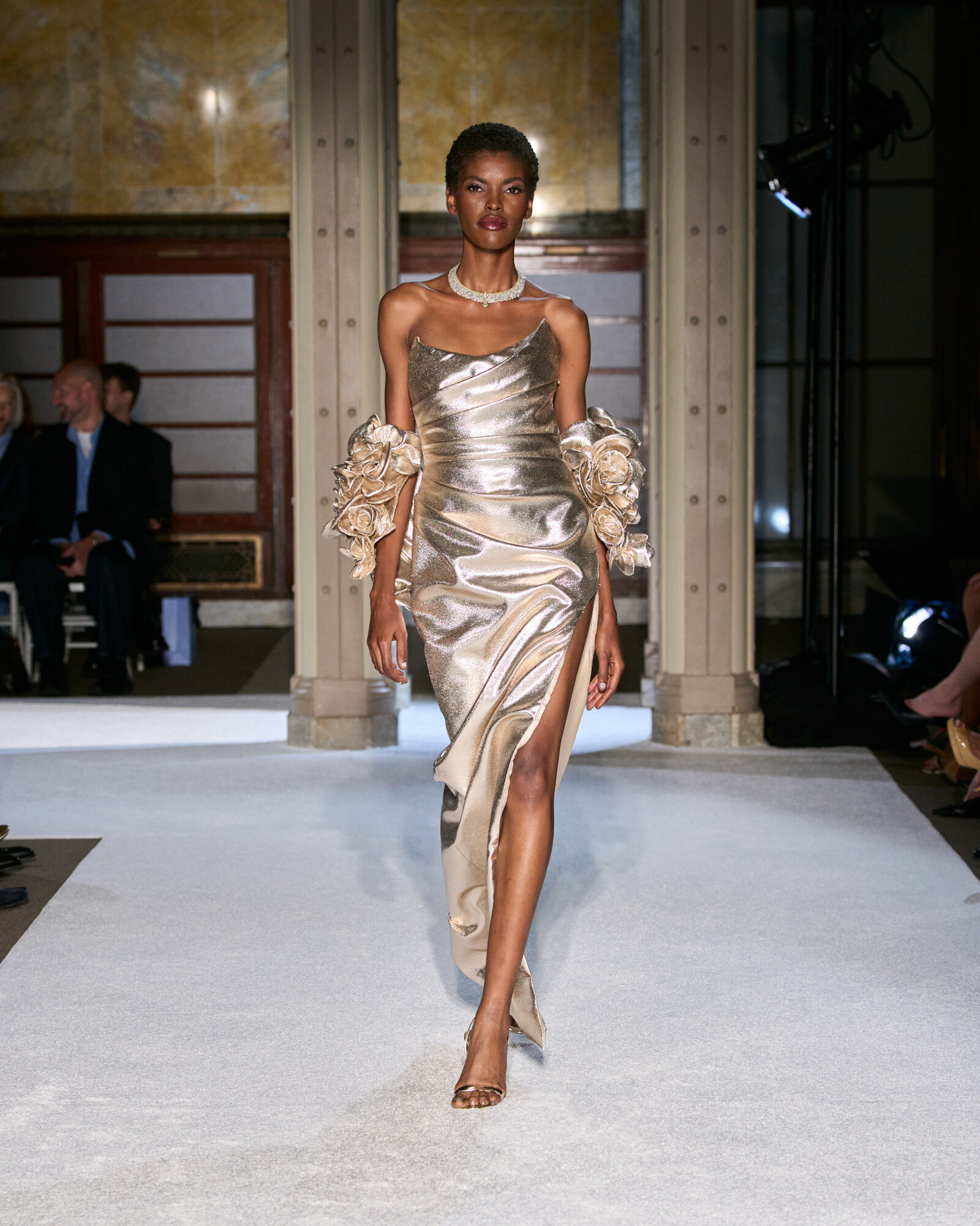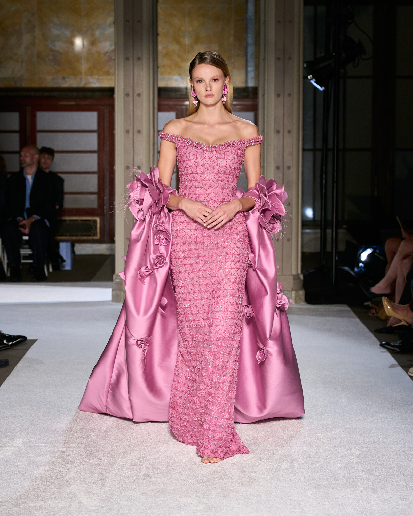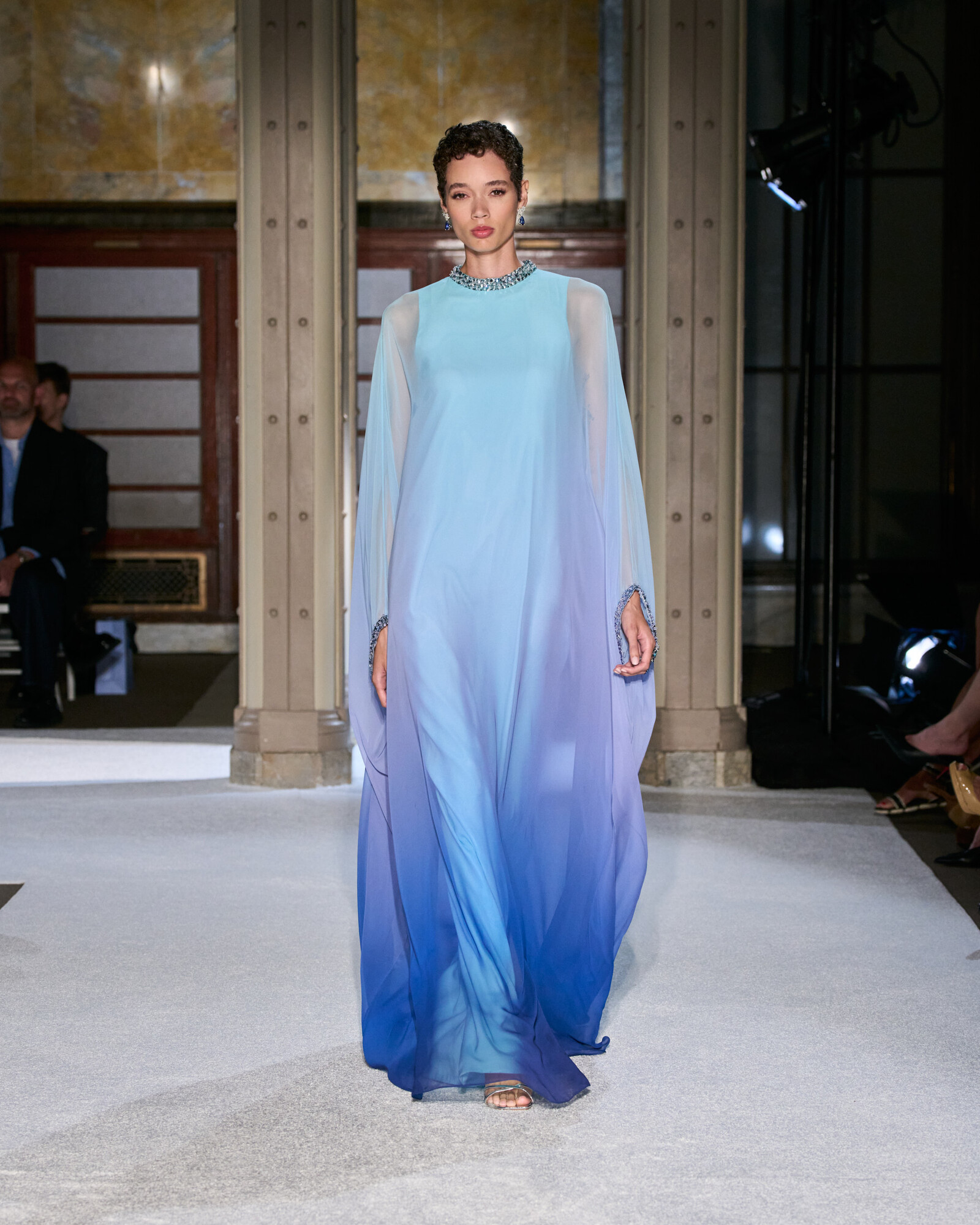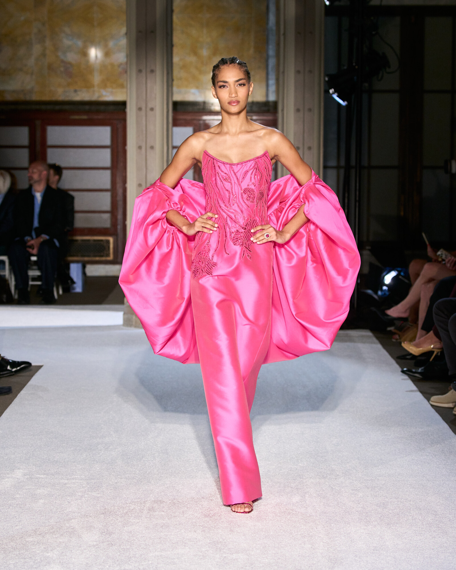 Roland szabásvonalaiban a tudatos építkezés és a lágy esés különleges egyensúlyt teremtenek. A szűkített derékrészek, a határozott vállak és az aszimmetrikus szegélyek klasszikus arányokat adtak, miközben a belső varrások és a precíz ívek hordhatóvá teszik a drámai volument. Izgalmasak továbbá az ombre festések és a réteges áttetszőségek, ezek mozgást és mélységet adnak a sziluetteknek, a sugaras kristálydíszítések pedig vezetik a tekintetet, fókuszpontot alakítanak ki.