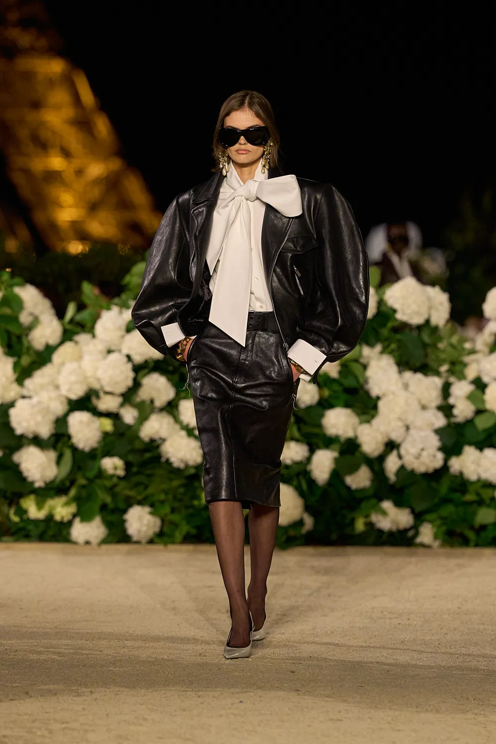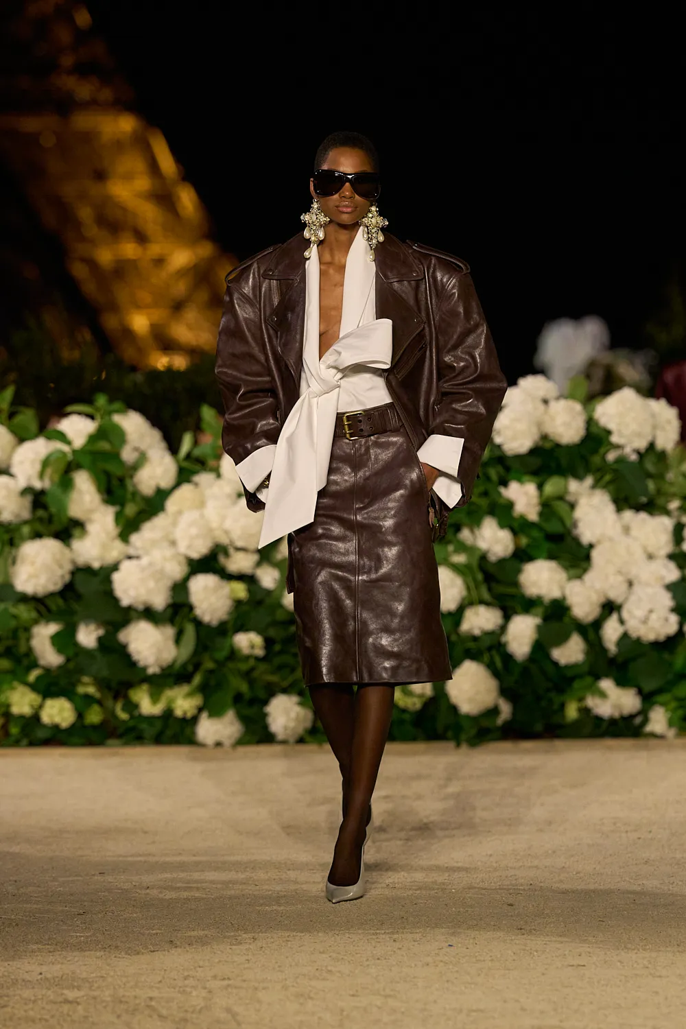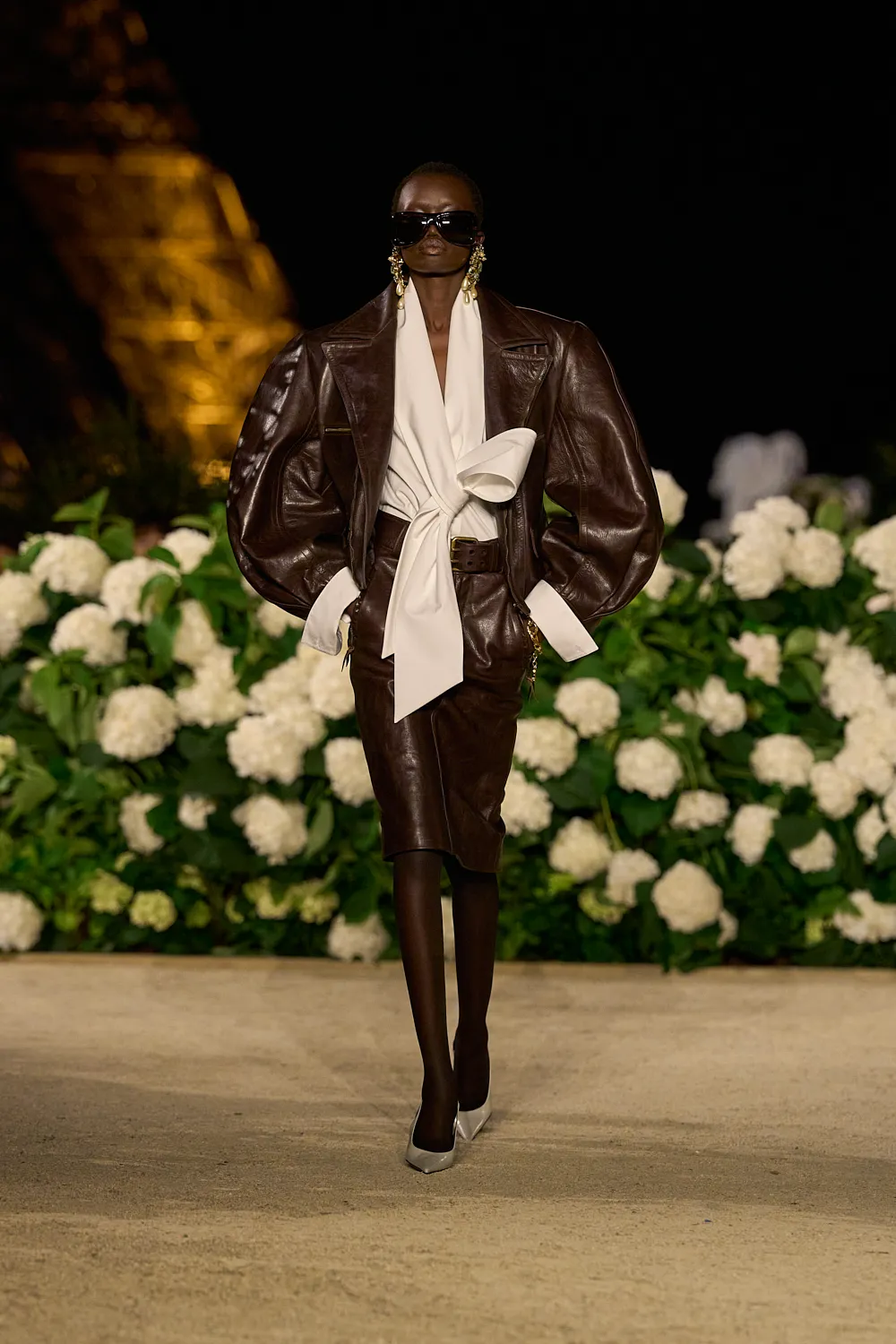 A Saint Laurent 2026-os tavaszi-nyári kollekciója a keménység és a törékenység határán egyensúlyozott. Az éles szabású bőrdzsekik, a szigorú ceruzaszoknyák és a határozott vonalú blúzok erőteljes nyitányt adtak ennek a pazar ruhasorozatnak. Mintha az éjszakai élet intrikái keltek volna életre a sziluettekben, annyi titok, merészség, lendület és újragondolt elegáns pillanat siklott végig a kifutón. A bőr itt nem csupán anyag, hanem valódi páncél volt a világ viszontagságaival szemben, a formák pedig tekintélyt sugalltak, miközben finoman érzékiek maradtak.
