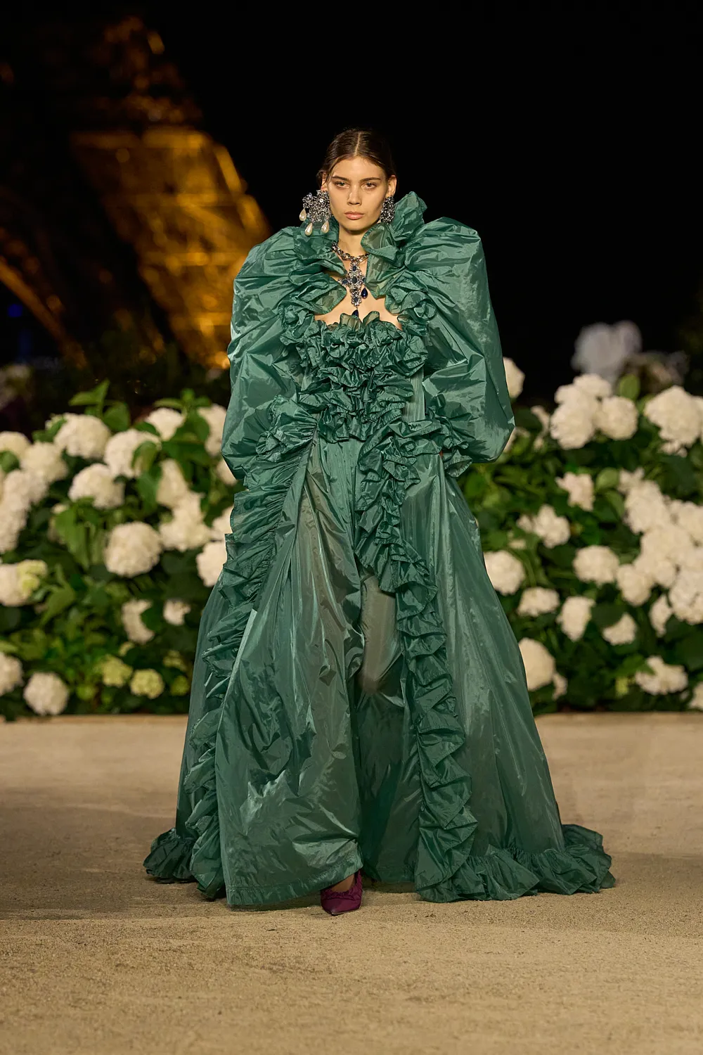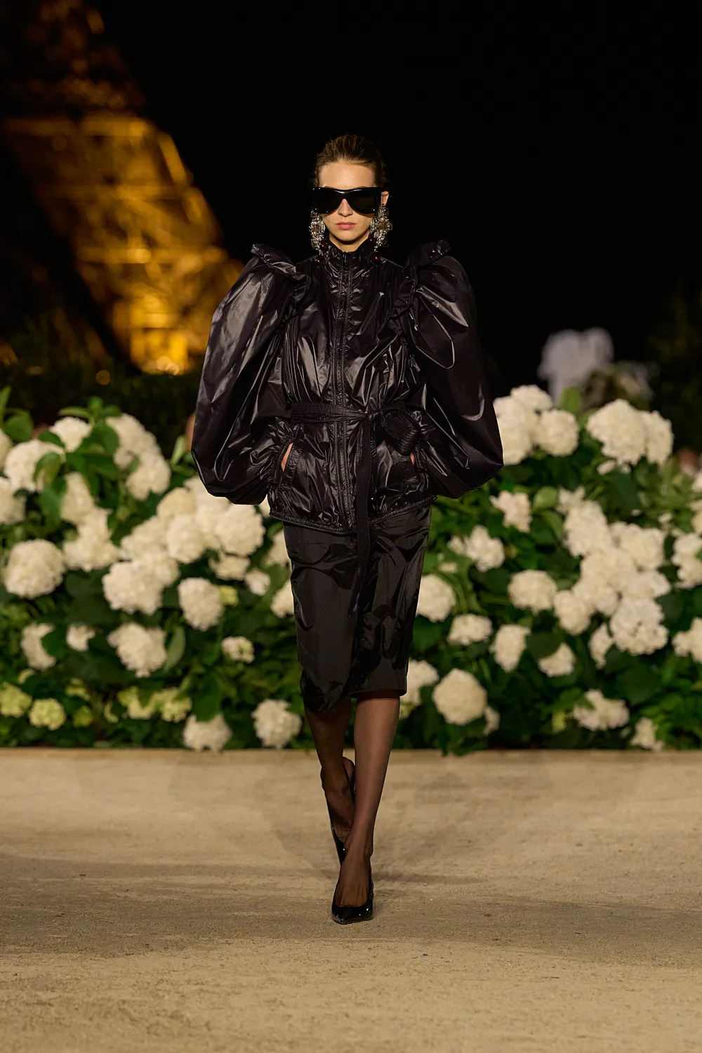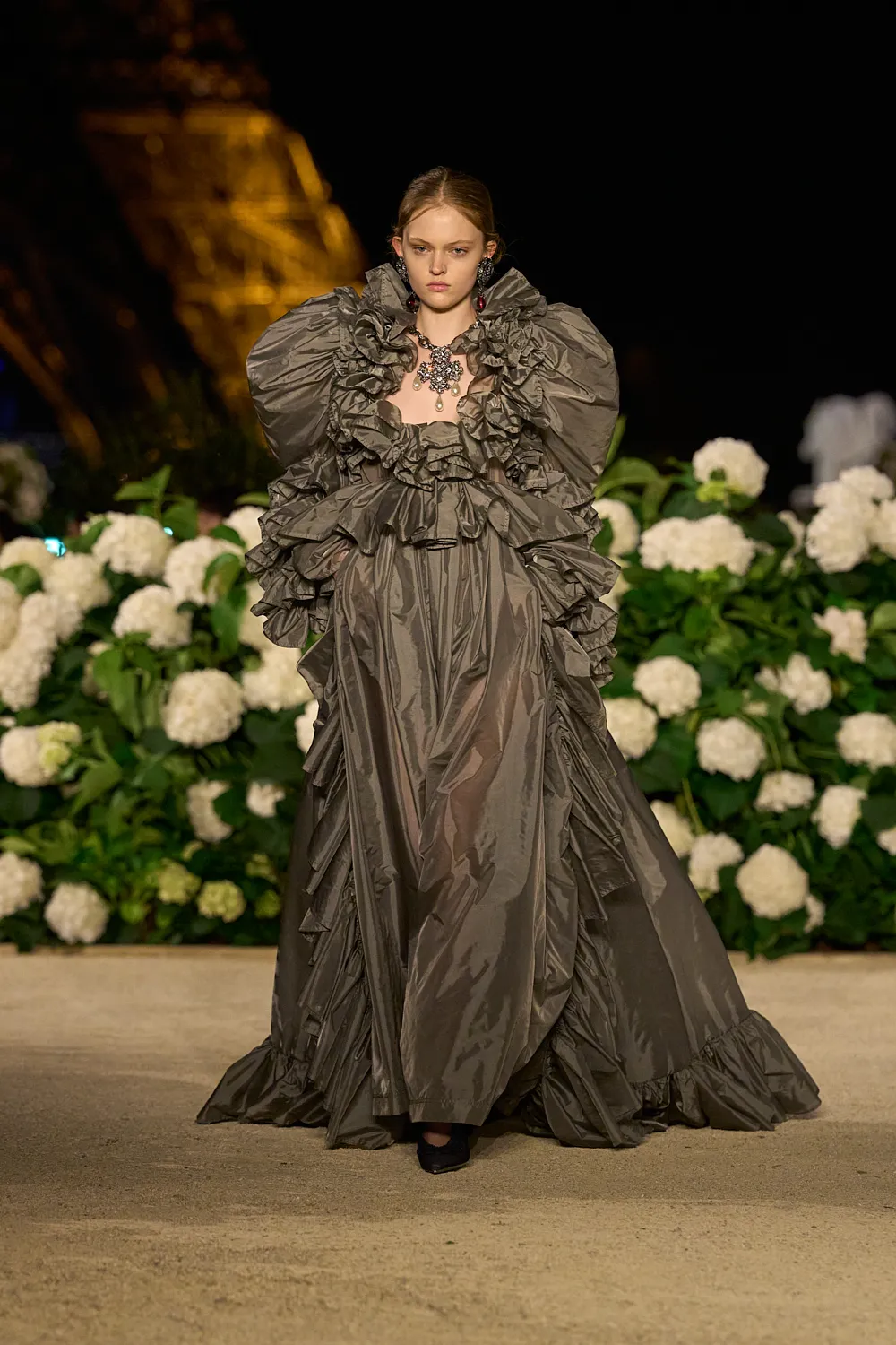 A gyűjtemény utolsó felében az estélyi ruhák drámaisága már a Belle Époque pompáját idézte meg. A puffos ujjak, a fodros volumenek és a romantikus túlzások keveredtek a modern anyaghasználattal és a lendületes szabásmintákkal. A kollekció színei – fekete, fehér és visszafogott semleges árnyalatok – szigorú keretet adtak, ezt a fel-felbukkanó fémes csillogás és a vibráló árnyalatok még inkább erősítették. A látványos kiegészítők, a hegyes cipősarkak, a lesimított haj és a minimális smink hangsúlyozták a női magabiztosságot és az őket körülvevő megfoghatatlan aurát.