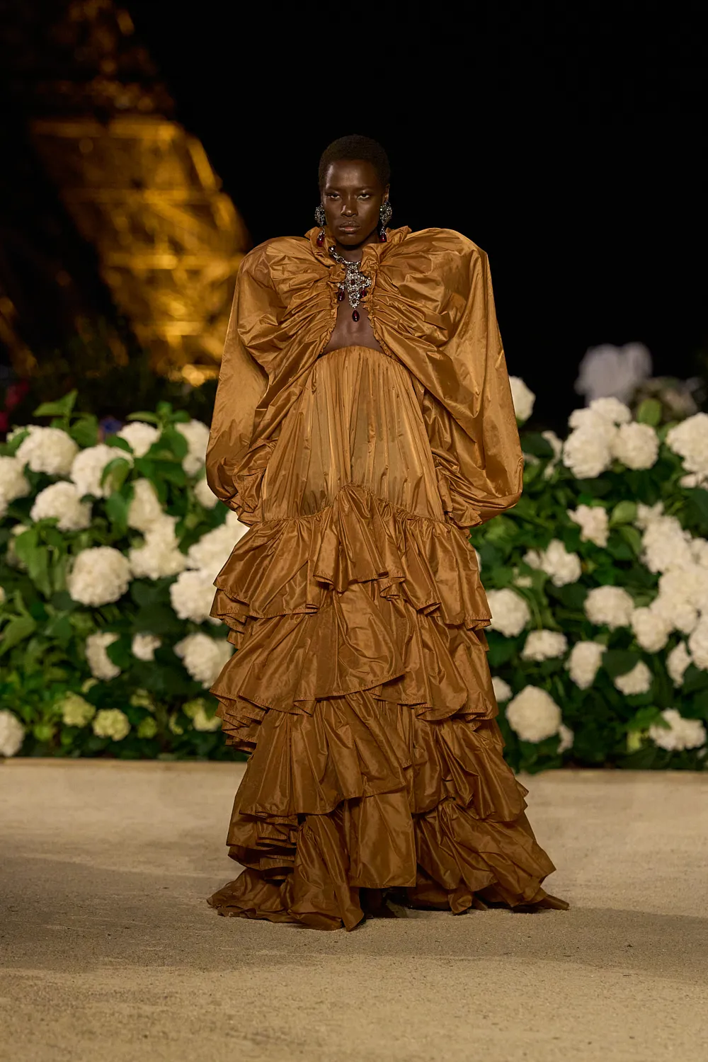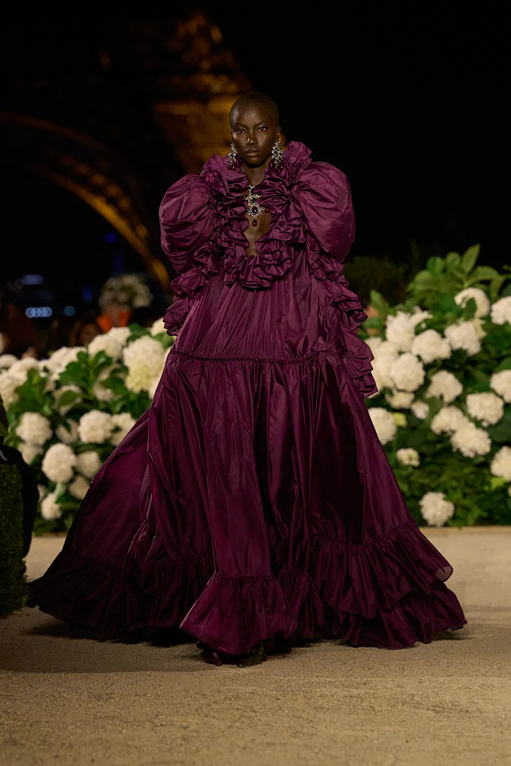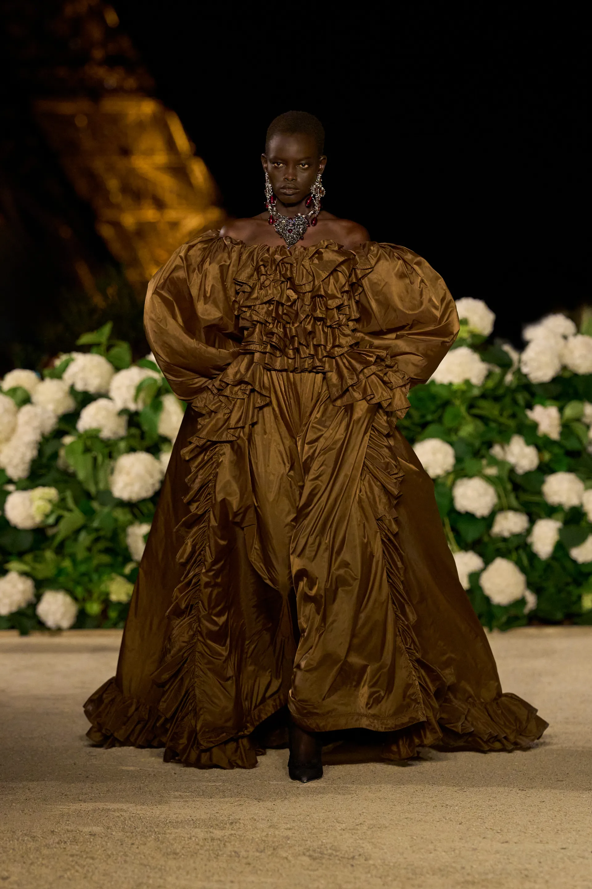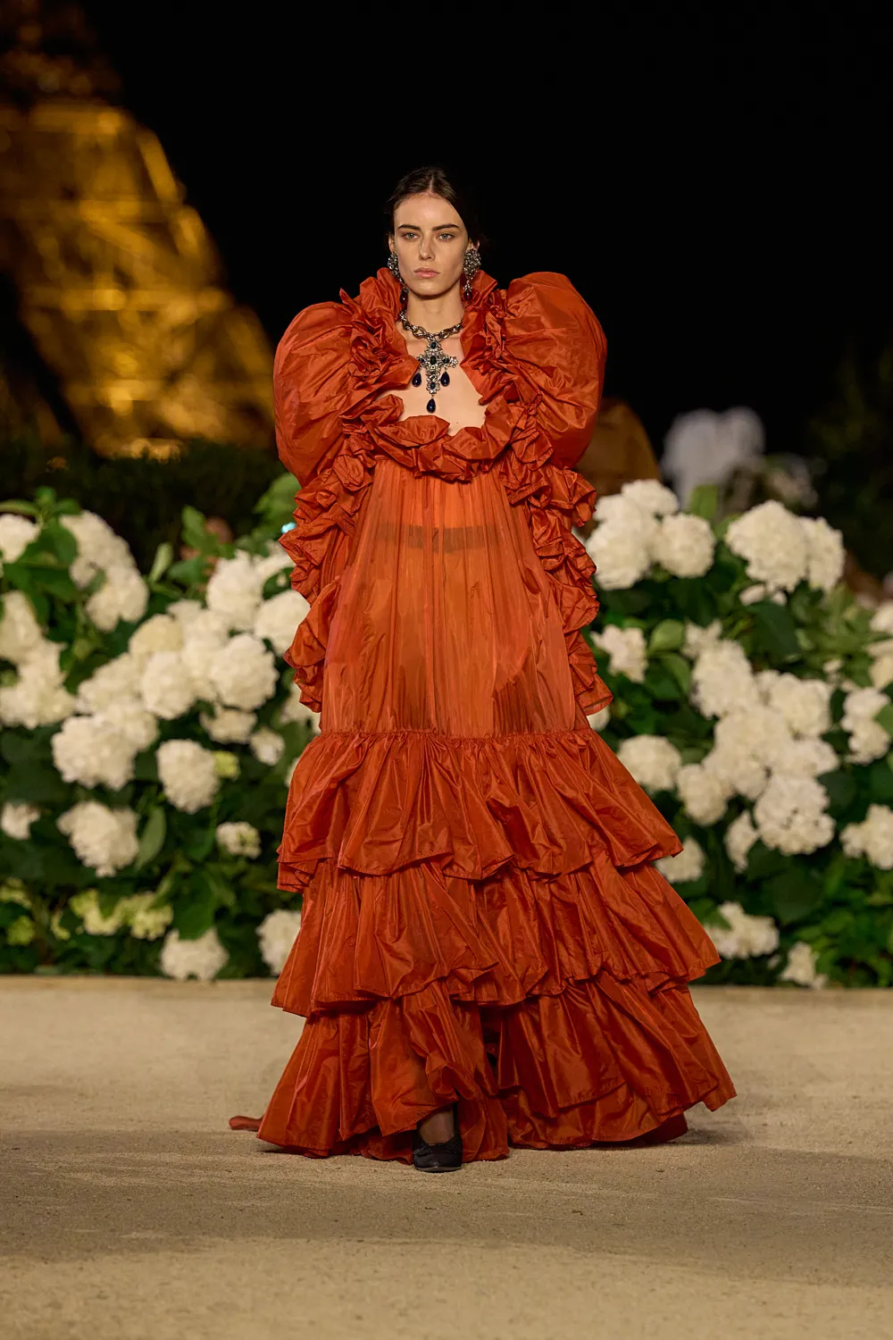 A gyűjtemény utolsó felében az estélyi ruhák drámaisága már a Belle Époque pompáját idézte meg. A puffos ujjak, a fodros volumenek és a romantikus túlzások keveredtek a modern anyaghasználattal és a lendületes szabásmintákkal. A kollekció színei – fekete, fehér és visszafogott semleges árnyalatok – szigorú keretet adtak, ezt a fel-felbukkanó fémes csillogás és a vibráló árnyalatok még inkább erősítették. A látványos kiegészítők, a hegyes cipősarkak, a lesimított haj és a minimális smink hangsúlyozták a női magabiztosságot és az őket körülvevő megfoghatatlan aurát.