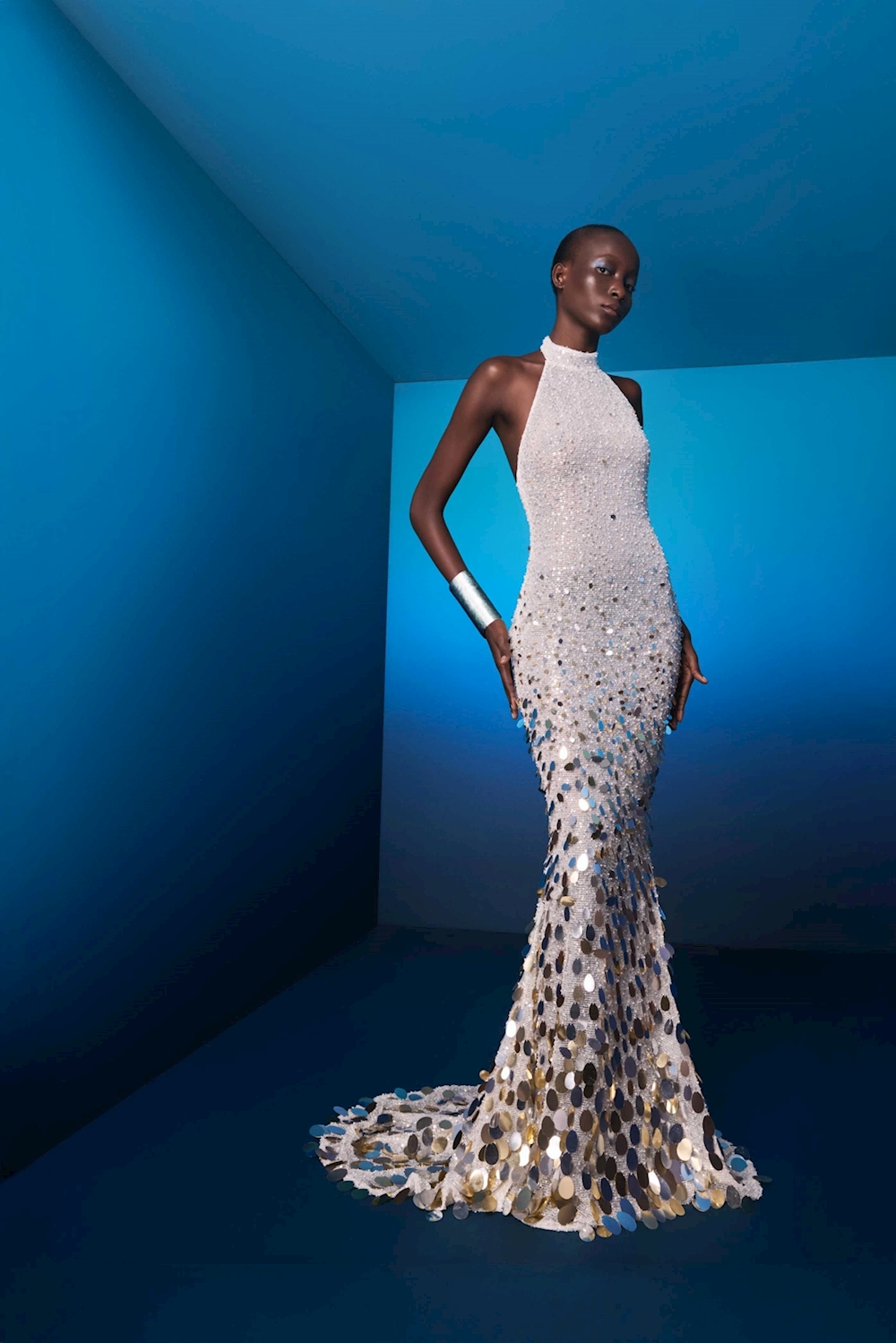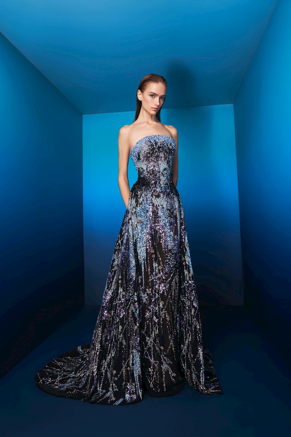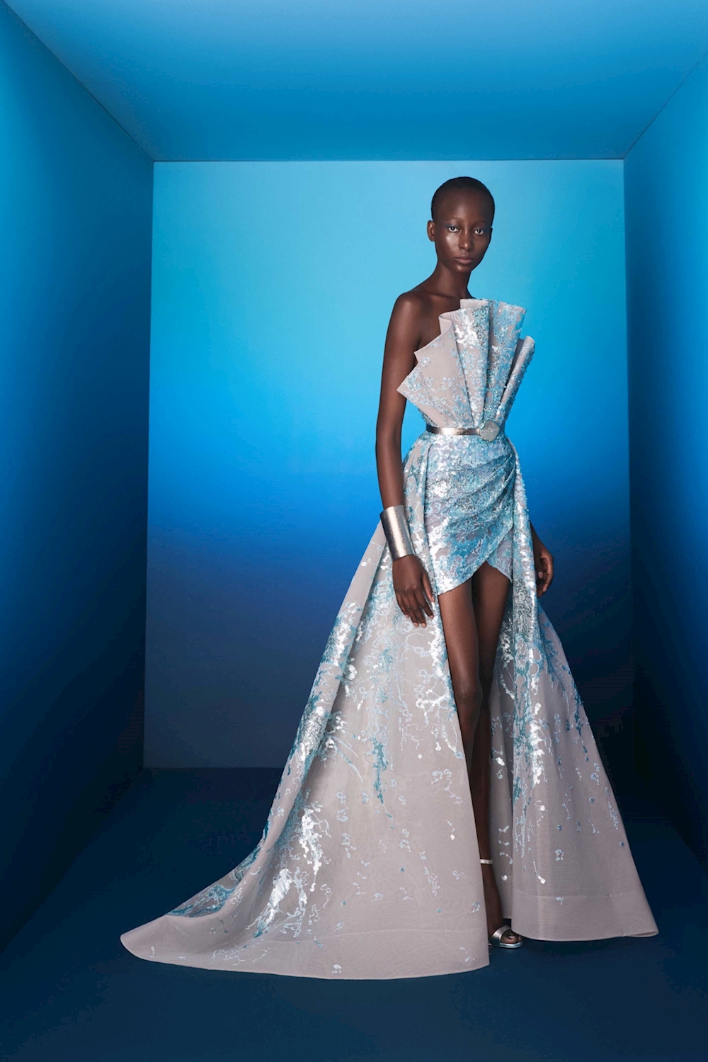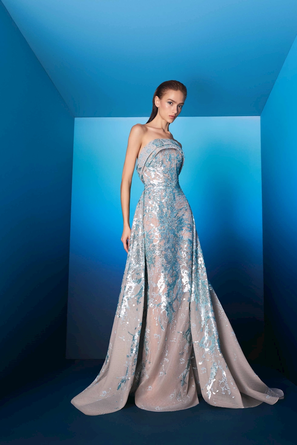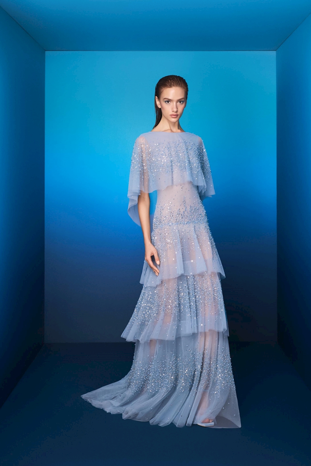 Tony Ward ruhái folyékony rétegekben bontakoznak ki. Az organza fodrok és a muszlinok úgy mozognak, mint a tengervíz az elsüllyedt város romjai között. A csillogó kristályok és a csipkék finom árnyai valósággal beborítják a felületeket, míg a taftok és a redők törésvonalakként hasadnak szét. A színpaletta a mélykék, az akvamarin és a lila árnyalatai között sodródik, amelyet a kvarcrózsaszínek és a lágy pasztellek oldanak fel. A fekete, az ezüst és a halvány arany fényei mintha a víz alól szűrődnének fel. A gyöngyös hímzések koralltelepekként derengenek a mélyben – emlékeztetve bennünket arra, hogy ami elveszett, az soha nem tűnik el teljesen. Csak csendben időzik, várva, hogy emlékezzenek rá.