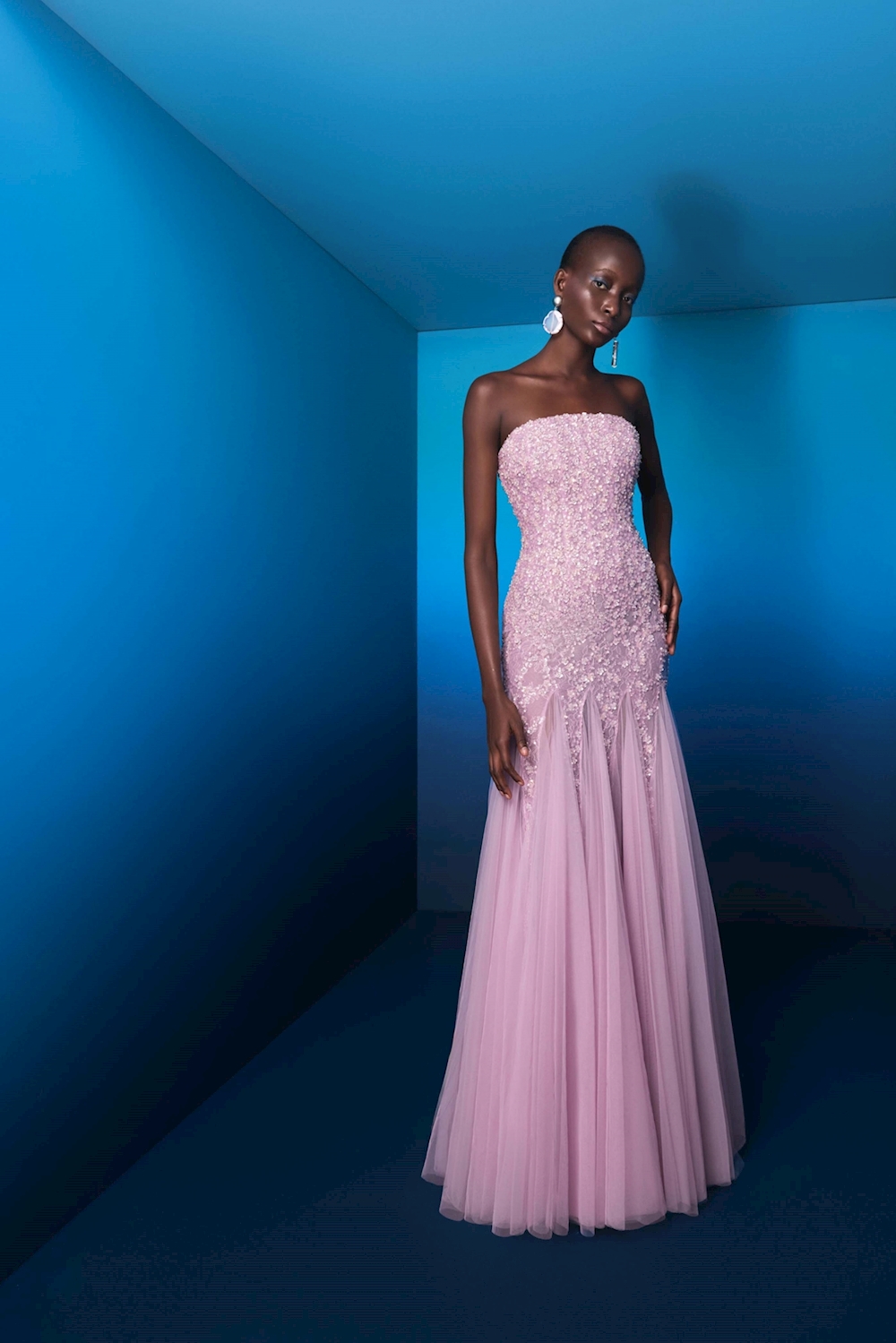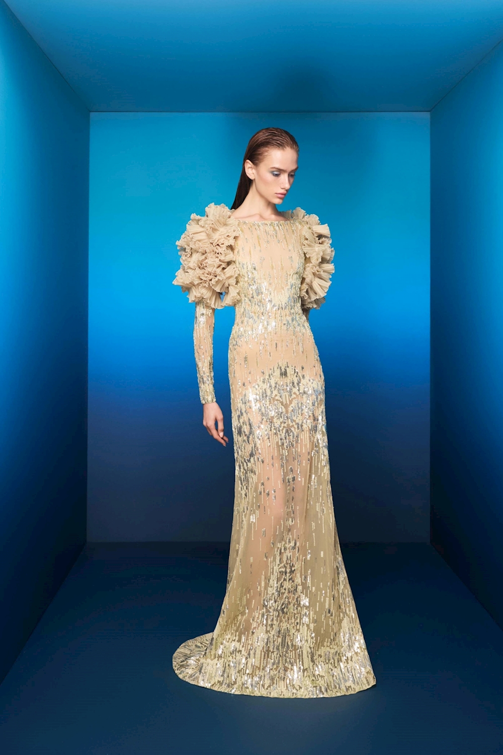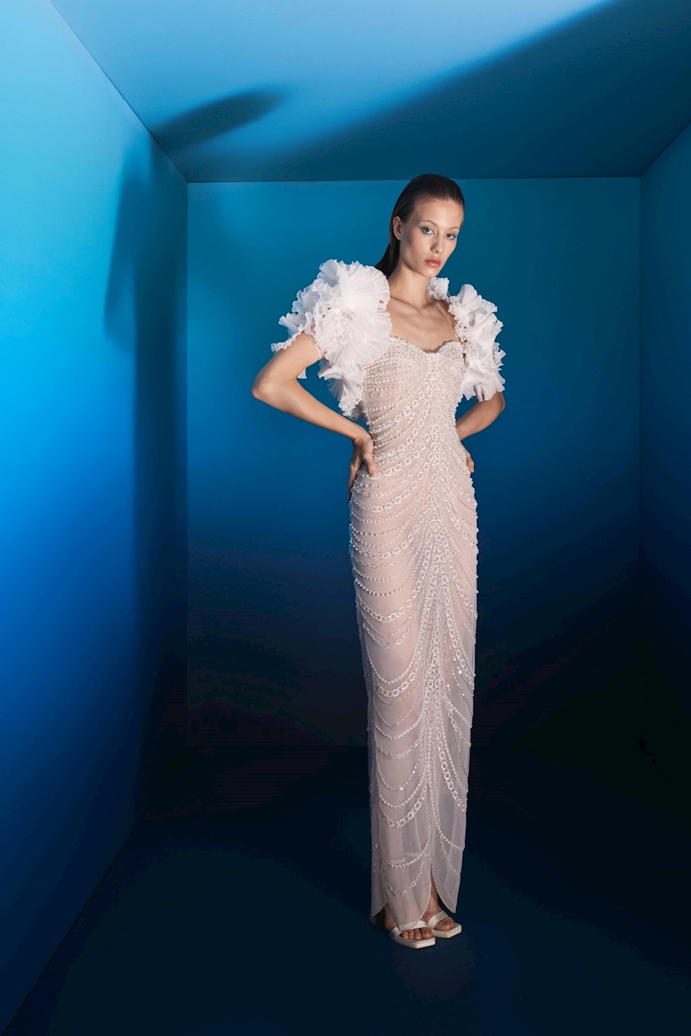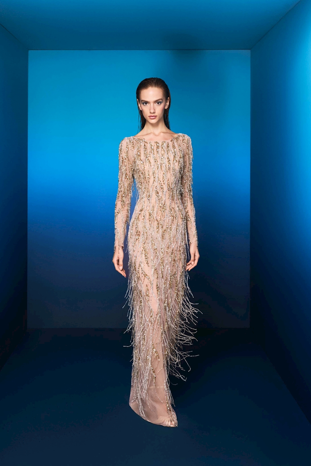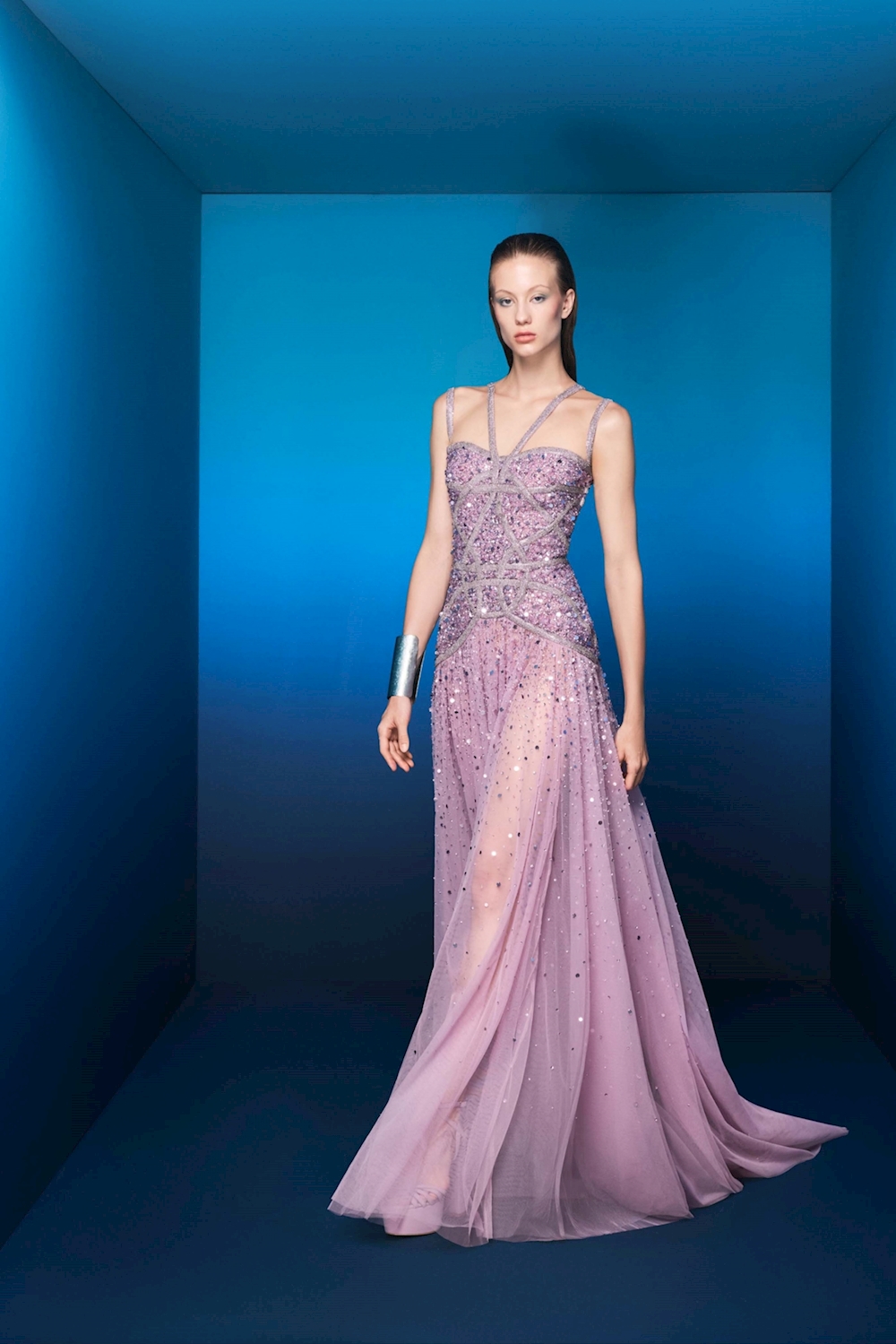 Tony Ward ruhái folyékony rétegekben bontakoznak ki. Az organza fodrok és a muszlinok úgy mozognak, mint a tengervíz az elsüllyedt város romjai között. A csillogó kristályok és a csipkék finom árnyai valósággal beborítják a felületeket, míg a taftok és a redők törésvonalakként hasadnak szét. A színpaletta a mélykék, az akvamarin és a lila árnyalatai között sodródik, amelyet a kvarcrózsaszínek és a lágy pasztellek oldanak fel. A fekete, az ezüst és a halvány arany fényei mintha a víz alól szűrődnének fel. A gyöngyös hímzések koralltelepekként derengenek a mélyben – emlékeztetve bennünket arra, hogy ami elveszett, az soha nem tűnik el teljesen. Csak csendben időzik, várva, hogy emlékezzenek rá.