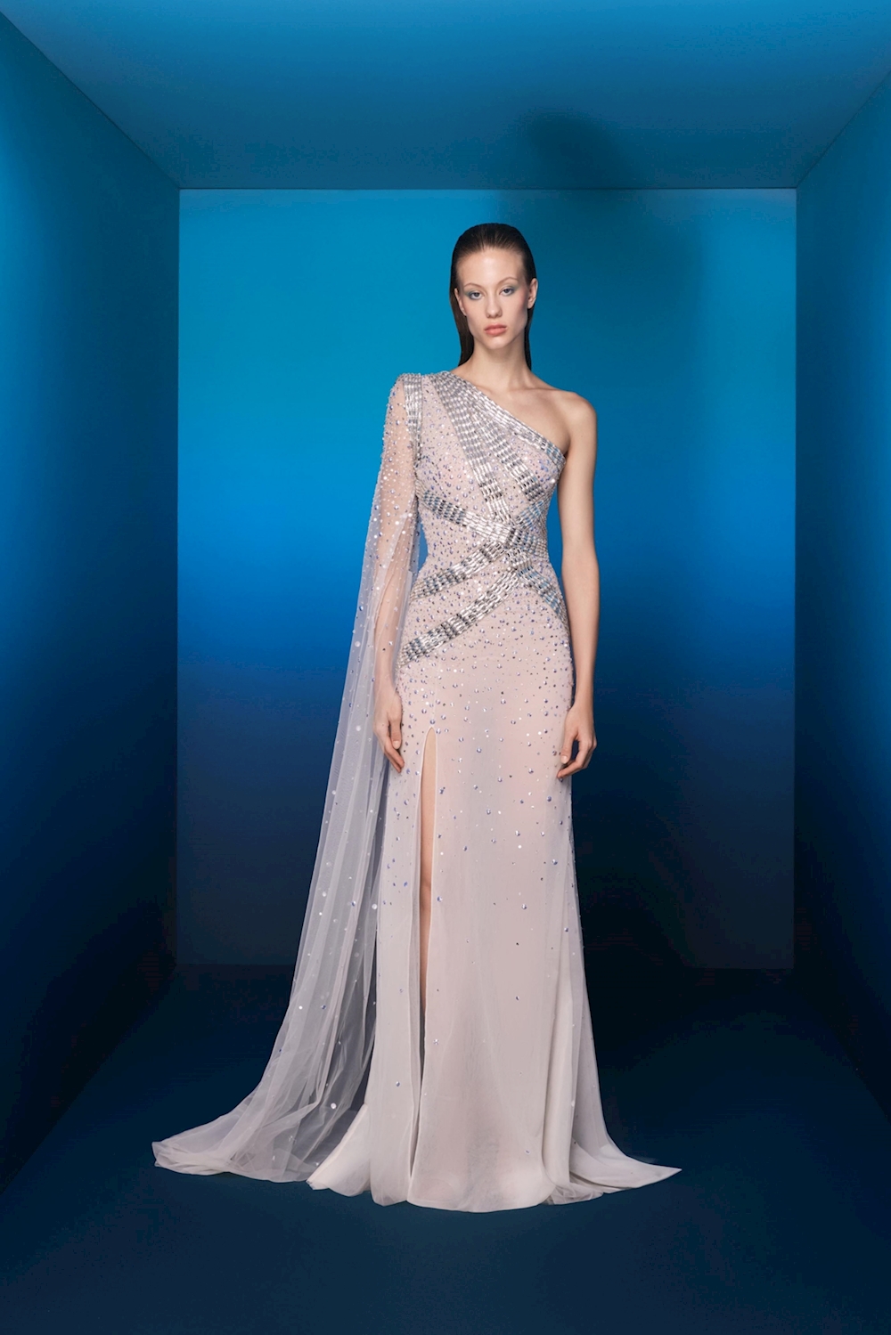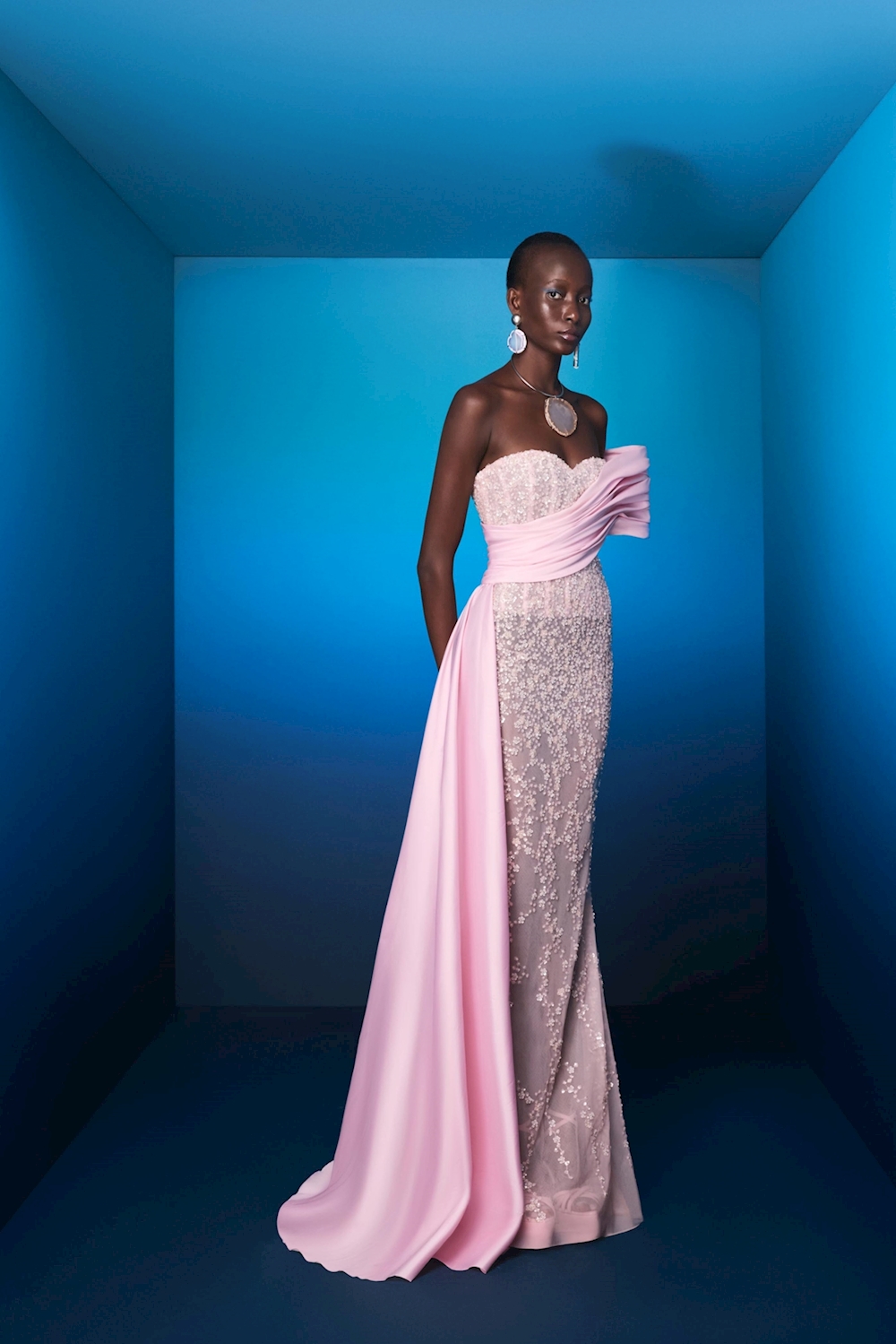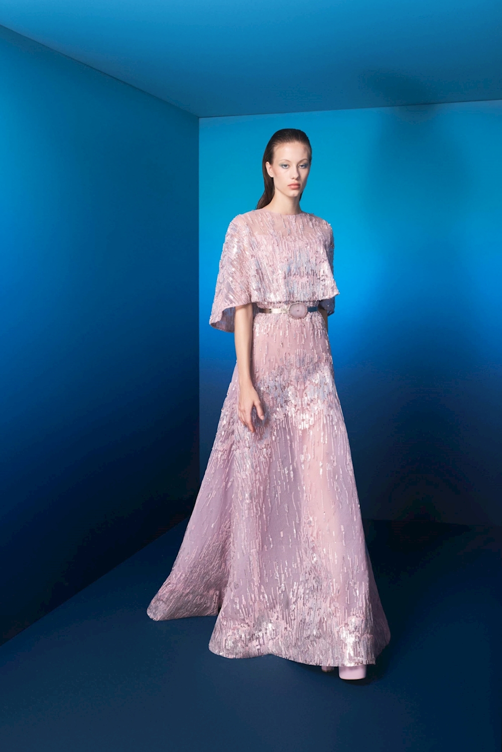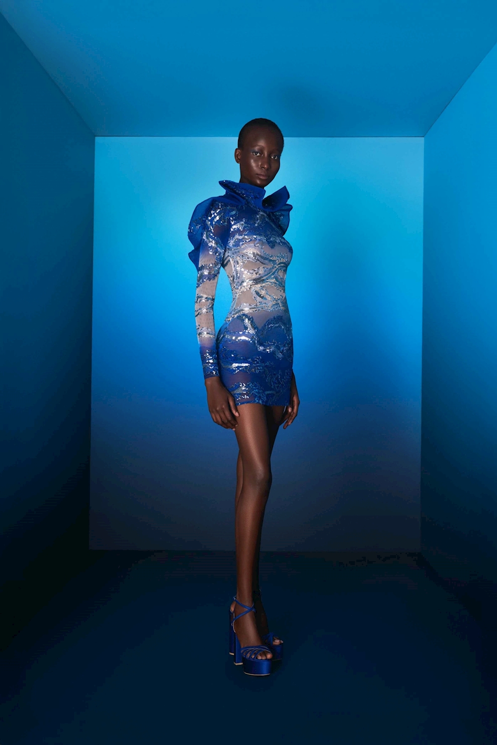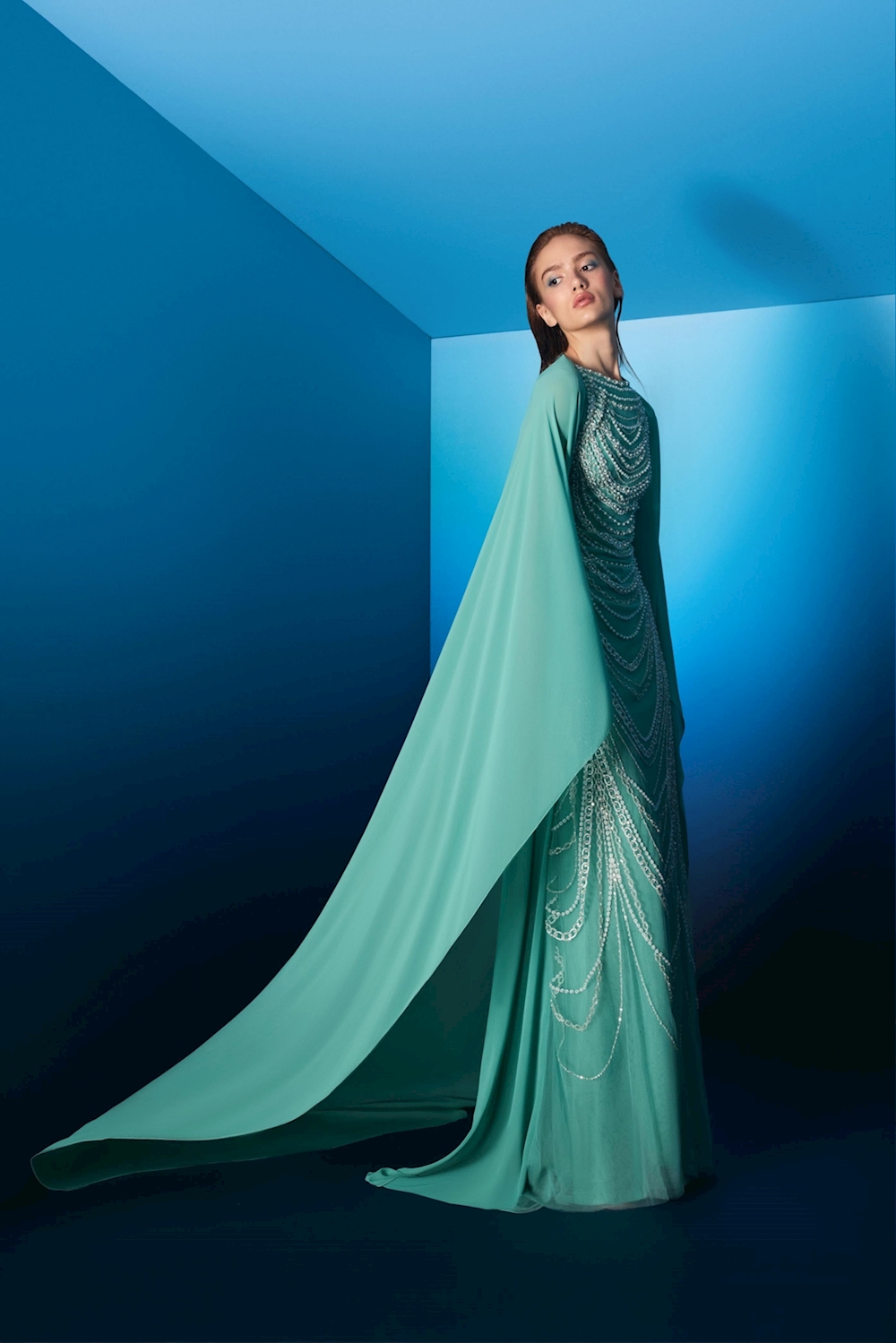 Tony Ward ruhái folyékony rétegekben bontakoznak ki. Az organza fodrok és a muszlinok úgy mozognak, mint a tengervíz az elsüllyedt város romjai között. A csillogó kristályok és a csipkék finom árnyai valósággal beborítják a felületeket, míg a taftok és a redők törésvonalakként hasadnak szét. A színpaletta a mélykék, az akvamarin és a lila árnyalatai között sodródik, amelyet a kvarcrózsaszínek és a lágy pasztellek oldanak fel. A fekete, az ezüst és a halvány arany fényei mintha a víz alól szűrődnének fel. A gyöngyös hímzések koralltelepekként derengenek a mélyben – emlékeztetve bennünket arra, hogy ami elveszett, az soha nem tűnik el teljesen. Csak csendben időzik, várva, hogy emlékezzenek rá.