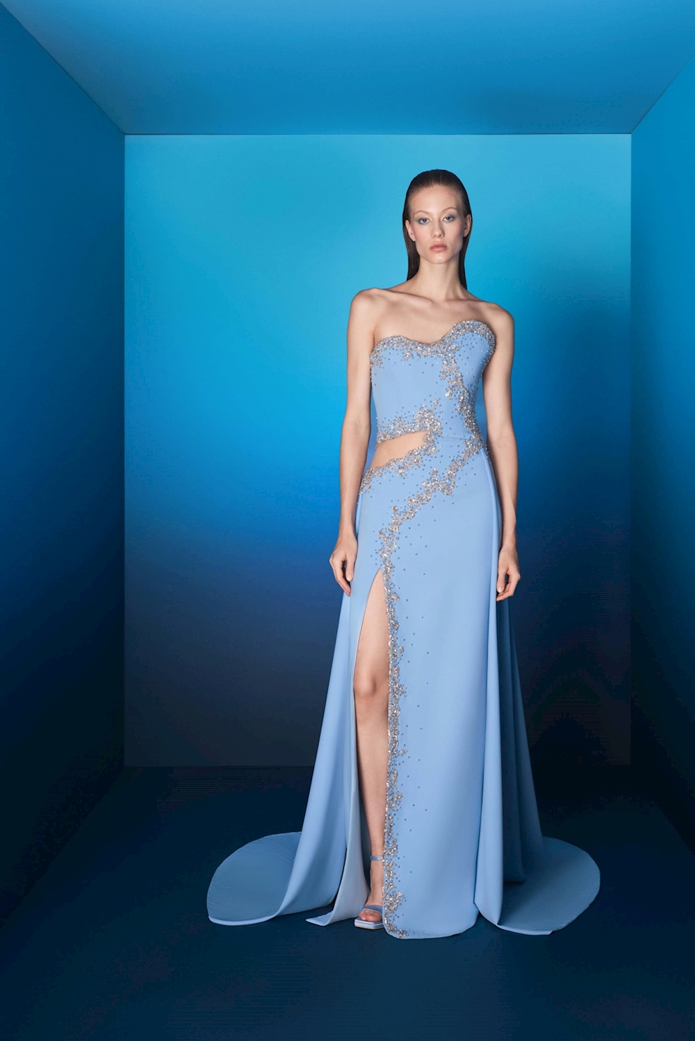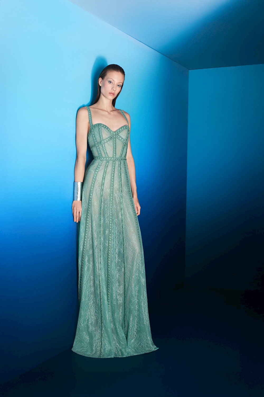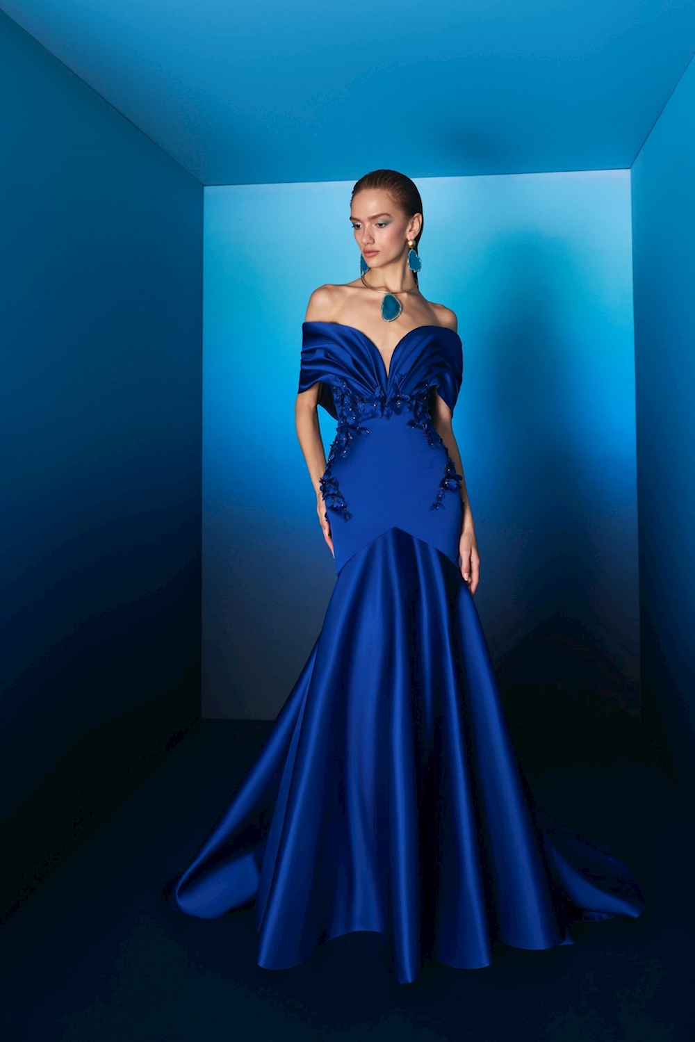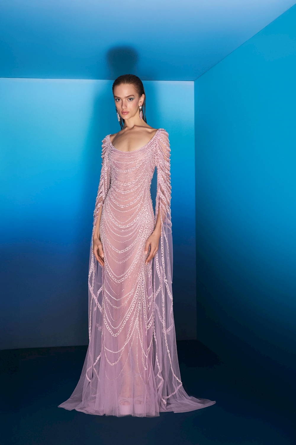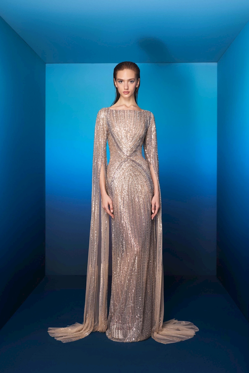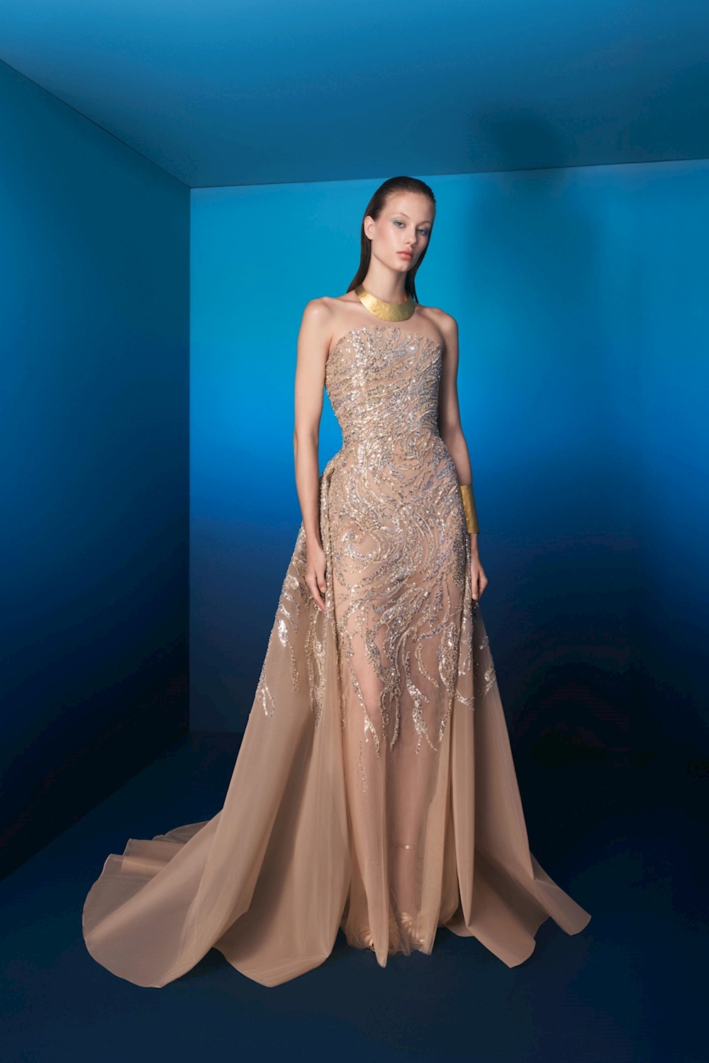 Tony Ward ruhái folyékony rétegekben bontakoznak ki. Az organza fodrok és a muszlinok úgy mozognak, mint a tengervíz az elsüllyedt város romjai között. A csillogó kristályok és a csipkék finom árnyai valósággal beborítják a felületeket, míg a taftok és a redők törésvonalakként hasadnak szét. A színpaletta a mélykék, az akvamarin és a lila árnyalatai között sodródik, amelyet a kvarcrózsaszínek és a lágy pasztellek oldanak fel. A fekete, az ezüst és a halvány arany fényei mintha a víz alól szűrődnének fel. A gyöngyös hímzések koralltelepekként derengenek a mélyben – emlékeztetve bennünket arra, hogy ami elveszett, az soha nem tűnik el teljesen. Csak csendben időzik, várva, hogy emlékezzenek rá.