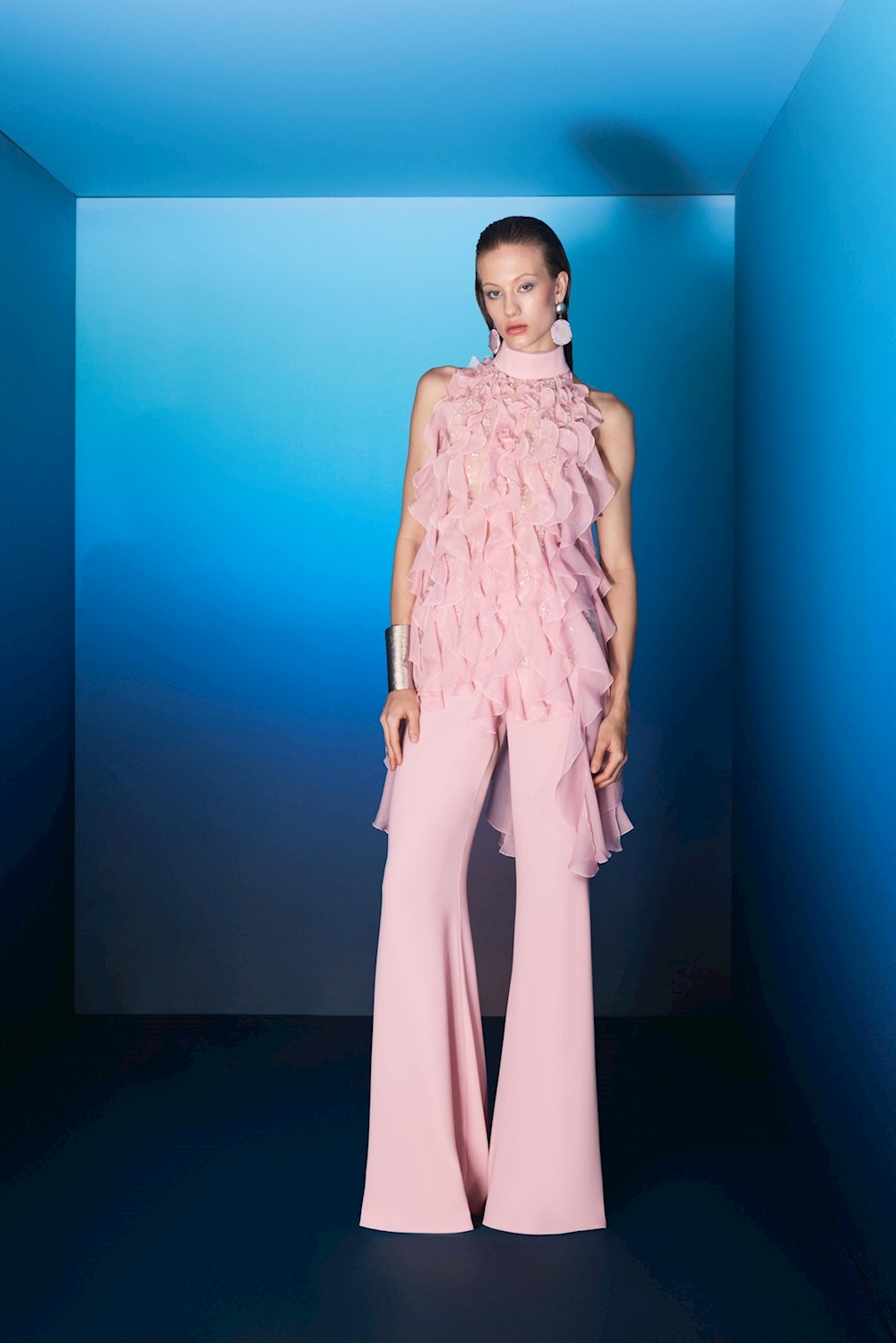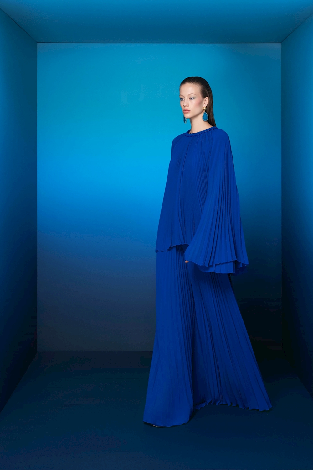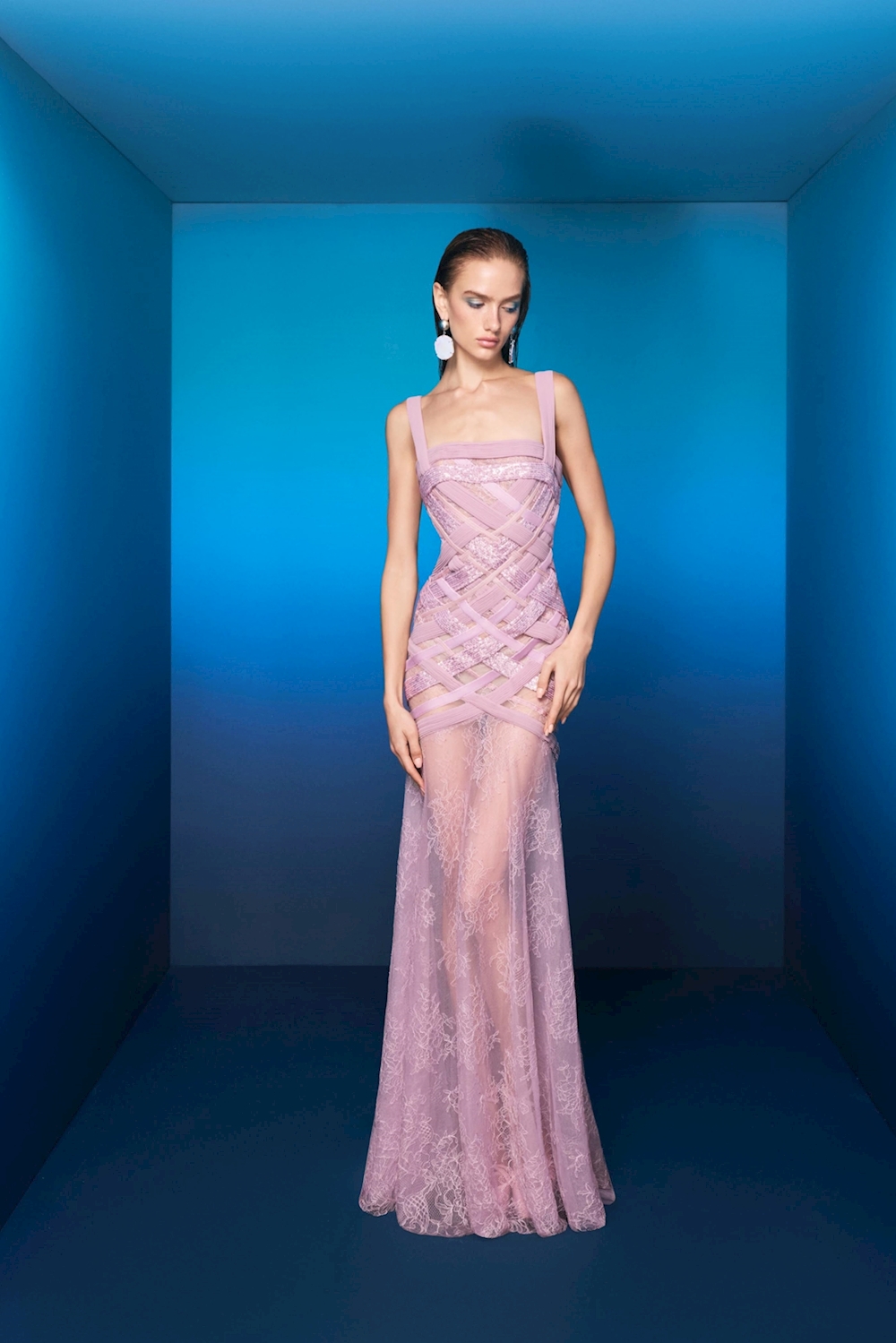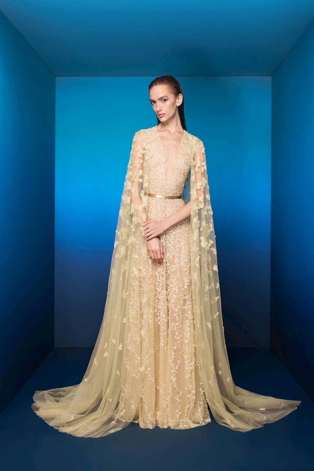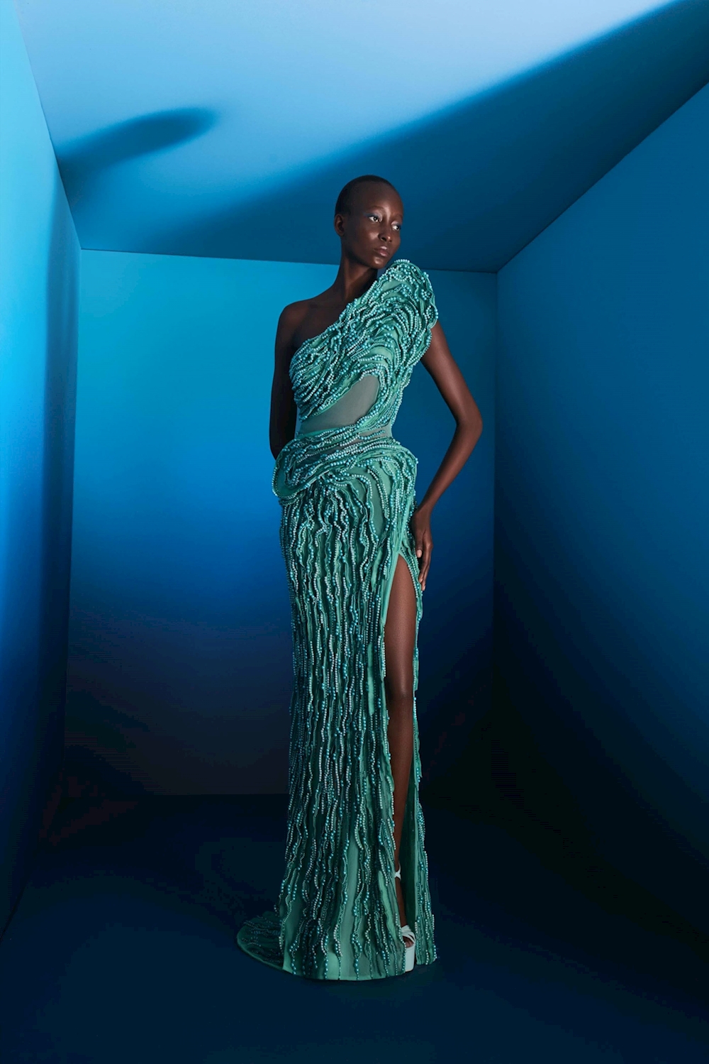 Tony Ward ruhái folyékony rétegekben bontakoznak ki. Az organza fodrok és a muszlinok úgy mozognak, mint a tengervíz az elsüllyedt város romjai között. A csillogó kristályok és a csipkék finom árnyai valósággal beborítják a felületeket, míg a taftok és a redők törésvonalakként hasadnak szét. A színpaletta a mélykék, az akvamarin és a lila árnyalatai között sodródik, amelyet a kvarcrózsaszínek és a lágy pasztellek oldanak fel. A fekete, az ezüst és a halvány arany fényei mintha a víz alól szűrődnének fel. A gyöngyös hímzések koralltelepekként derengenek a mélyben – emlékeztetve bennünket arra, hogy ami elveszett, az soha nem tűnik el teljesen. Csak csendben időzik, várva, hogy emlékezzenek rá.