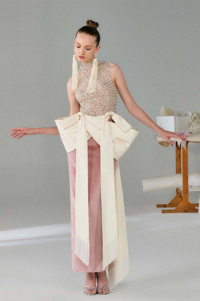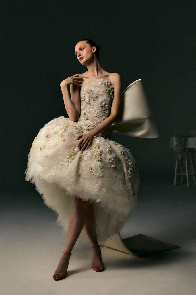 A Virágzás ideje szoborszerű vonalakat és éteri drapériákat ötvöz. A kreppből, selyem gazarból, taftból, faille-ből, dupla szaténból, bársonyból és hímzett tüllből készült ruhák az architekturális precizitás és a lebegő könnyedség találkozásai. Amíg a fűzős formák a lágy peplumokban oldódnak fel, addig a masnik uszályokká alakulnak, a kapucnik és a köpenyek misztikus fátyolként ölelik körbe a testet.
