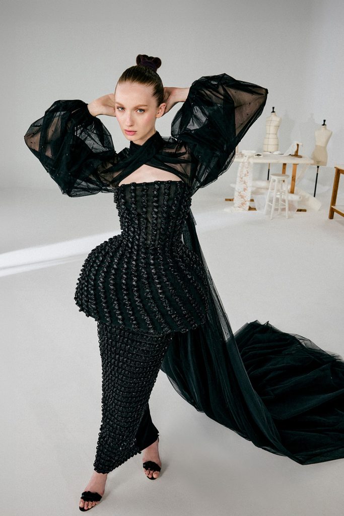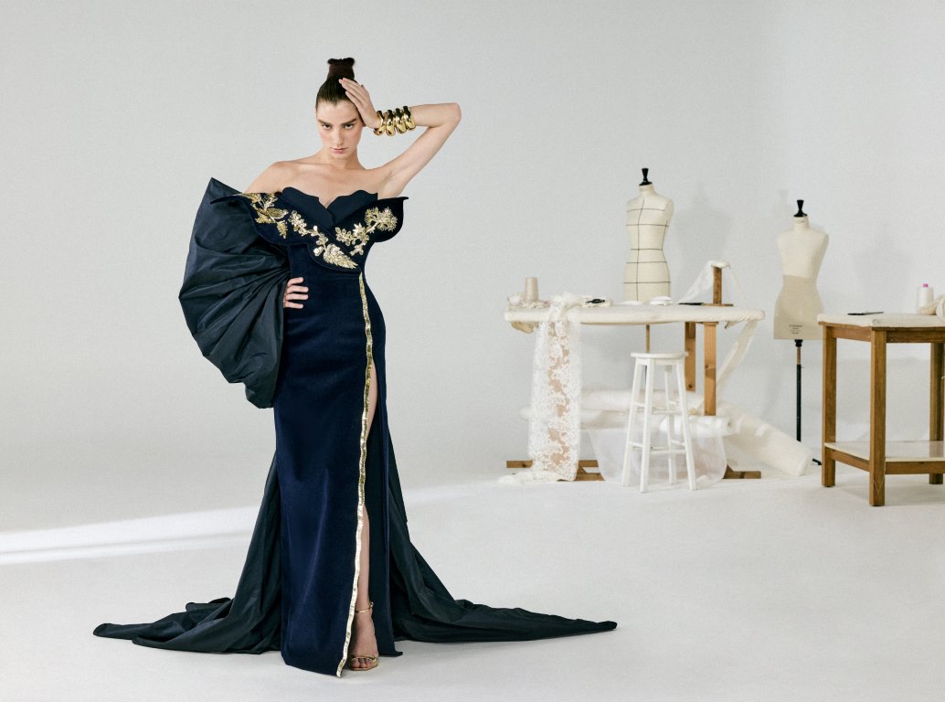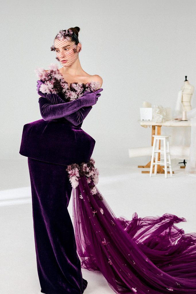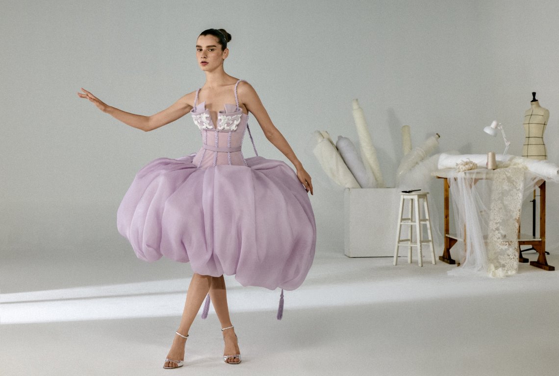 A huszonöt kreáció közül kiemelkedik a fekete Selene ruha, amely matematikai precizitású szalaghímzéssel és kürtgyöngyökkel borított textúrával szoborrá nemesíti az anyagot. A hímzés itt nem pusztán díszítés, építészeti struktúraként formálja a sziluettet, megfogható gazdagságot adva a testnek. A lookbook sztárja, a mélylila bársonyból készült, strukturált csípővonalú Ortensia ruha. Az organza hortenziadíszeivel királyi pompát sugároz, miközben a virágok egy áttetsző tüll uszályba omlanak le. Ebben a mesés couture alkotásban a súly és a könnyedség, az erő és a törékenység párbeszédbe lép egymással.