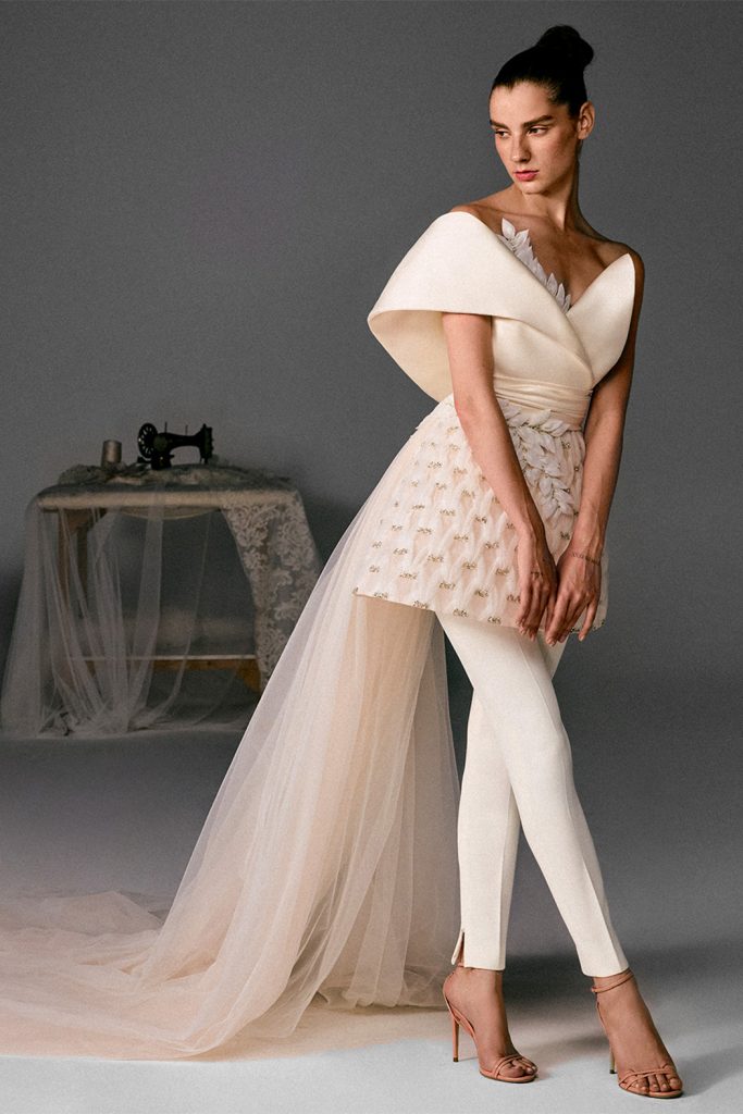 A kollekció kézműves részletei az Azzi & Osta stílusjegyeit viselik. A kristály-és flitteres csillagképek, a geometrikus gyöngydíszítések, az arany hímzések a növény-és állatvilág motívumaival fonódnak össze. Az organza és a tüll strukturált formákká emelkedik, a kézzel sodort szalagok háromdimenziós domborművekké alakulnak, a selyem organza hortenzia szinte életre kel a ruha felületén. A megjelenéseket a gyöngyös bojtok, az arany nyakláncok és a ragyogó koronák teszik teljessé, amelyek spirituális erővel rendelkező talizmánként testestik meg a transzcendenciát.