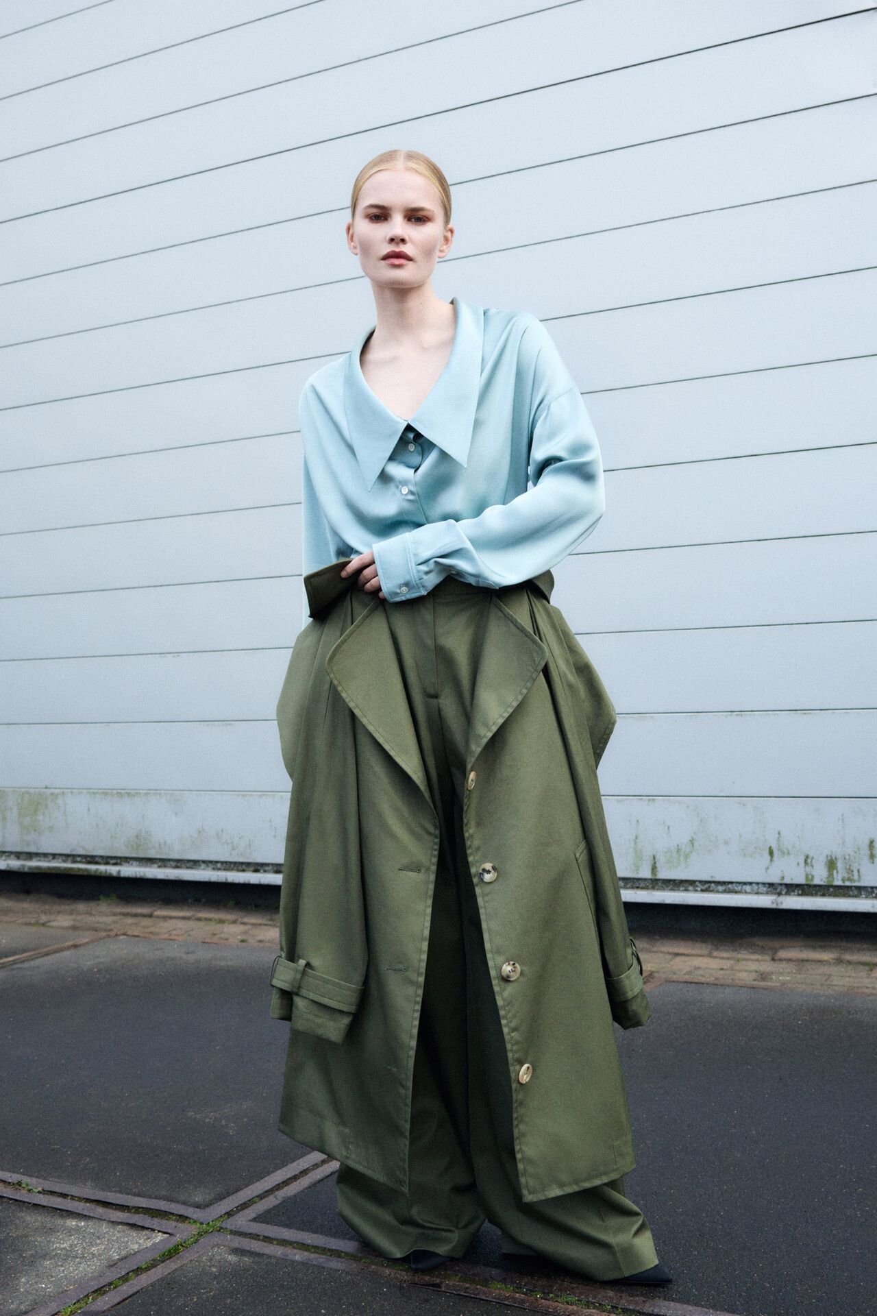 A gyűjtemény középpontjában továbbra is a ruhák állnak: dekonstruált drapériák, ballonkabátként induló koktélruhák és monumentalitást finoman oldó minisziluettek. Az ingek egyszerre túlméretezettek és precízen szabottak, tökéletesen illeszkednek a Viktor & Rolf-féle „könnyedség × dráma” egyenletbe.