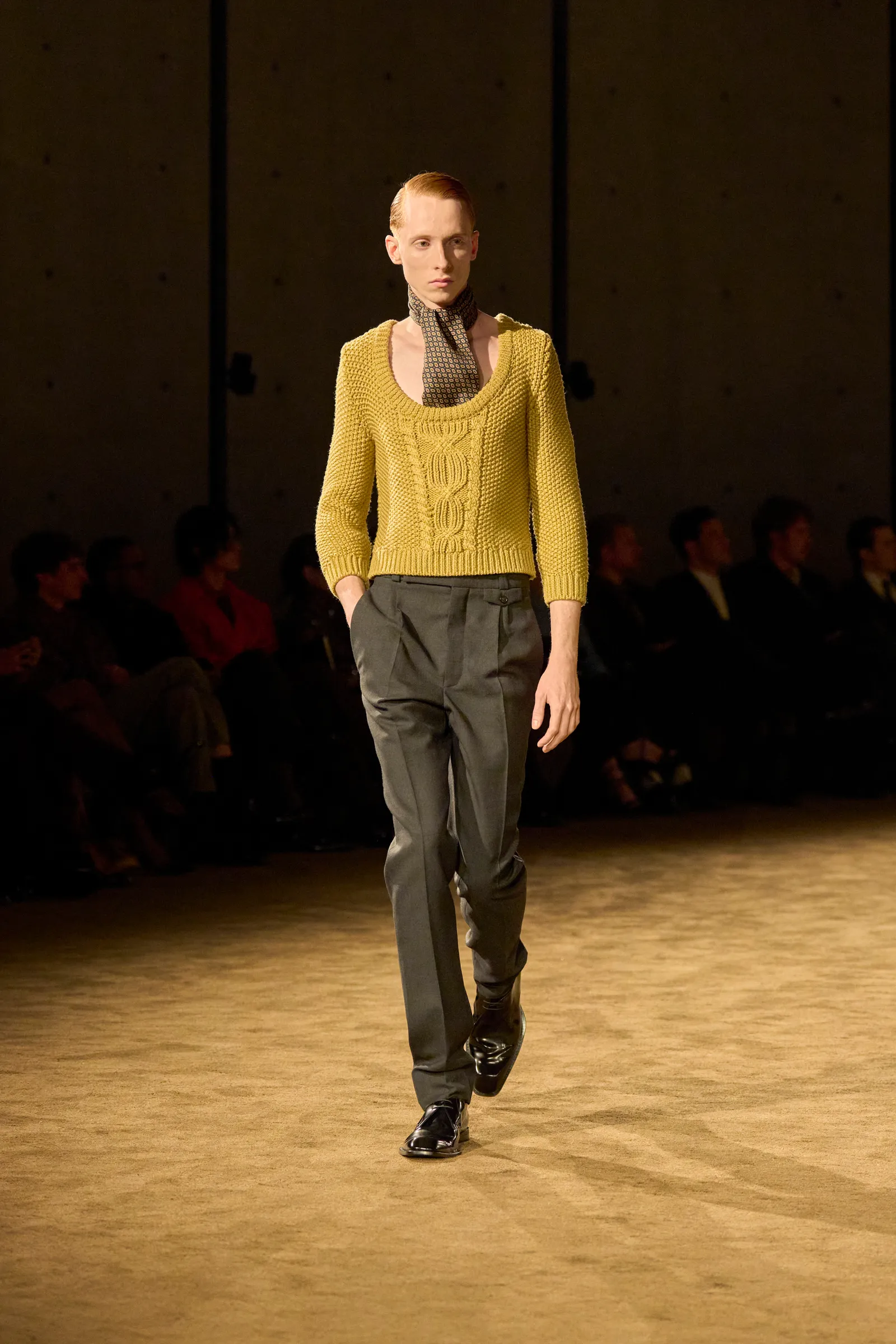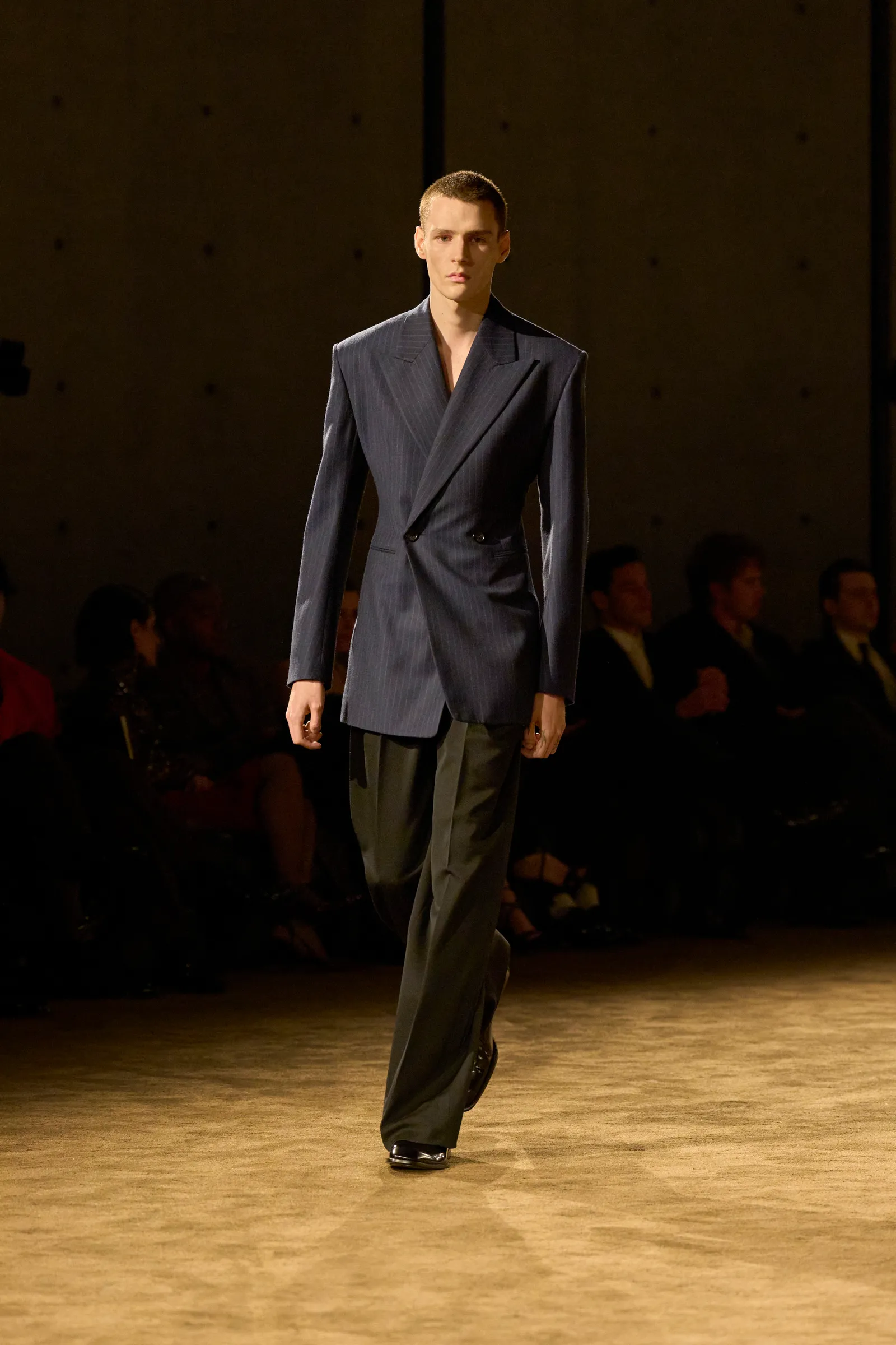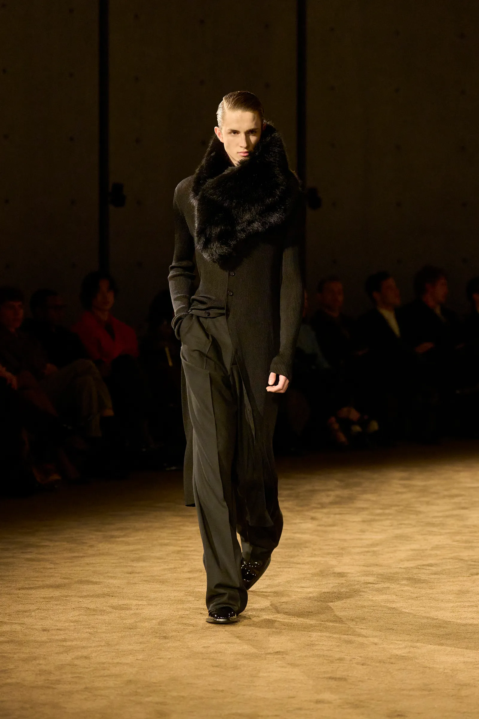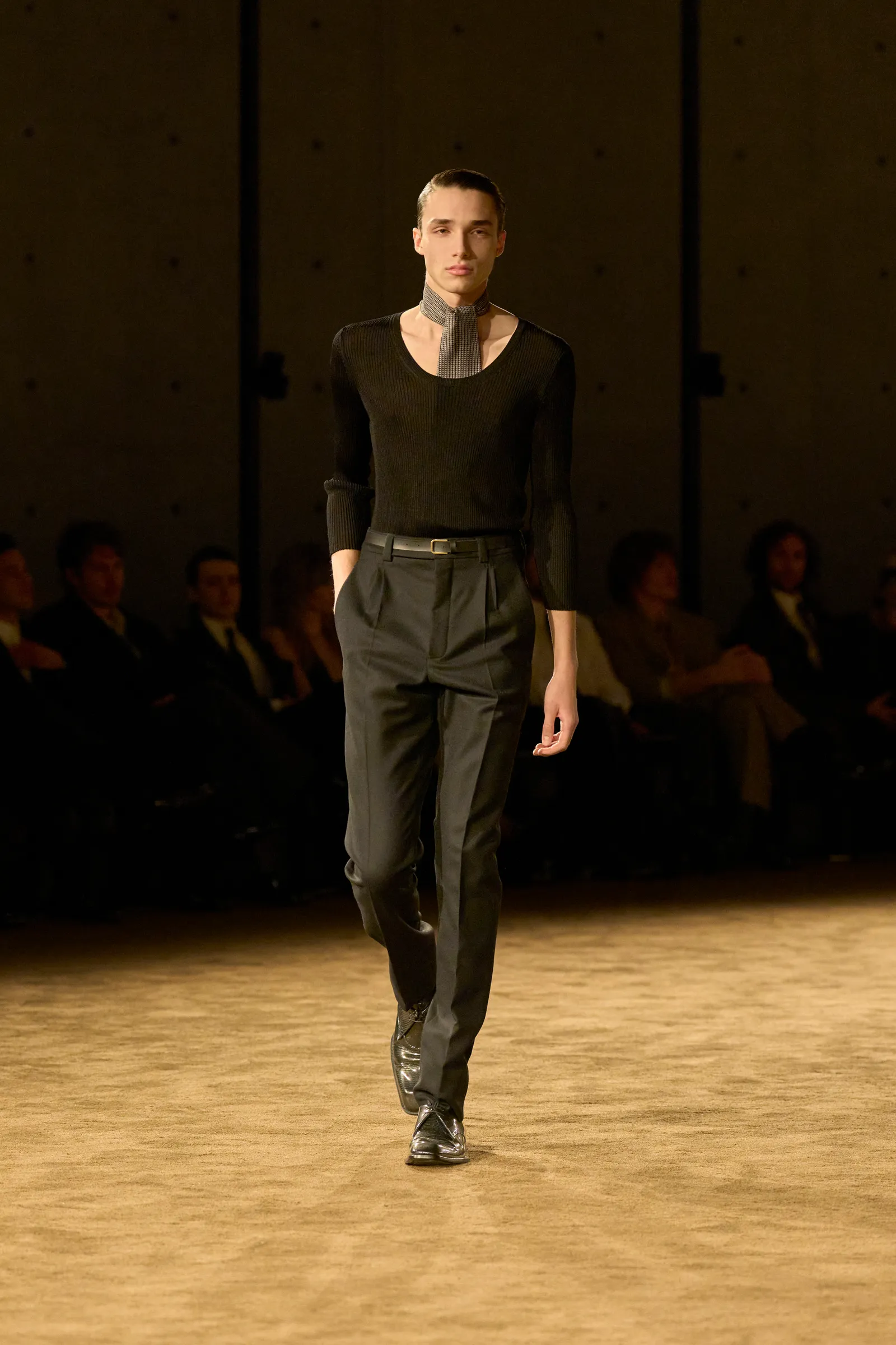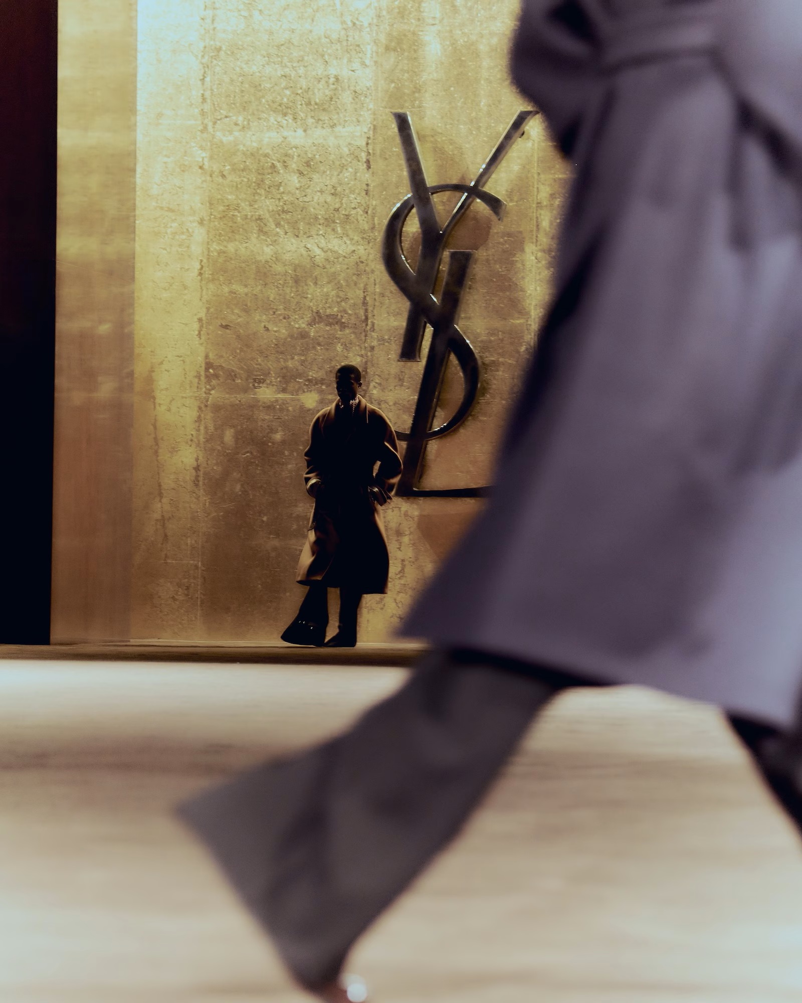 A sziluettek a tervezőre jellemző módon széles vállra és karcsúsított derékvonalra épültek, hosszú, bő nadrágokkal párosítva. A színpaletta ünnepélyes és igencsak sötét volt, ez minden bizonnyal tudatos eltérés az elmúlt szezonok világosabb tónusaitól. Vaccarello több interjúban elmondta, hogy ebben a kollekcióban nem akart úgy tenni, mintha minden rendben lenne a világban. A sötétség ezúttal nem valamiféle hatásvadász vagy esztétikai póz, hanem reflektív állítás. És láthatóvá vált, hogy a feszültség különösen izgalmas kontrasztokat szült. A fekete dominanciáját a selyemsálak, a szuperszűk kötött pulóverek és a meglepően intim hatású pizsamakészletek oldották fel.