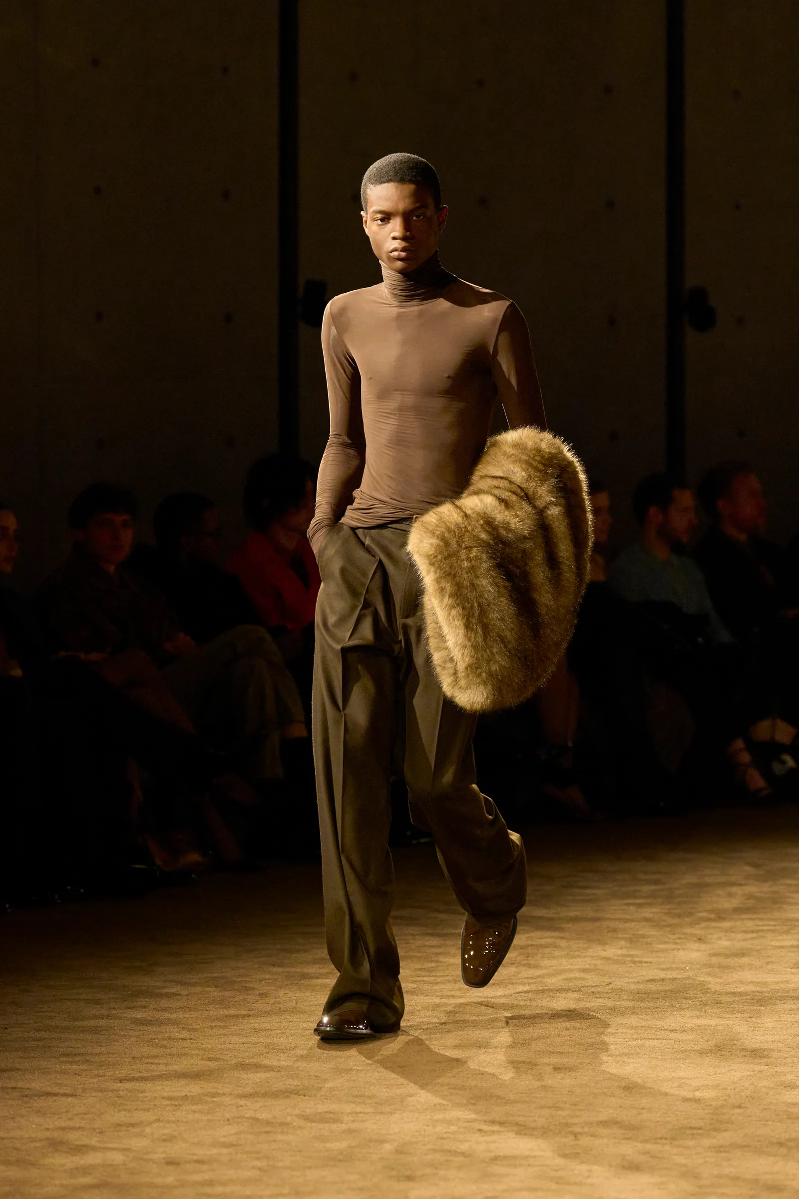 A Bourse de Commerce - Pinault Collection hangulatosan megvilágított rotundájában kifutóra vitt szettek az erőteljes vizuális élményen túl érzelmileg is súlyosabb tónust ütöttek meg. A bemutatótérben koromfekete szőrme stólák, túlméretezett muffok és szigorú, szögletes öltönyök vonultak fel, amelyek a Vaccarello-féle Saint Laurent egyik legerősebb védjegyét erősítették: a férfiasság érzéki, mégis fenyegetően elegáns újraértelmezését. (Fontos információ, hogy a darabok természetesen műszőrméből készültek.)
